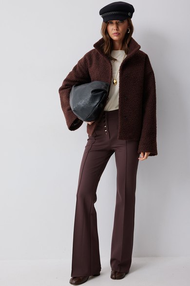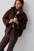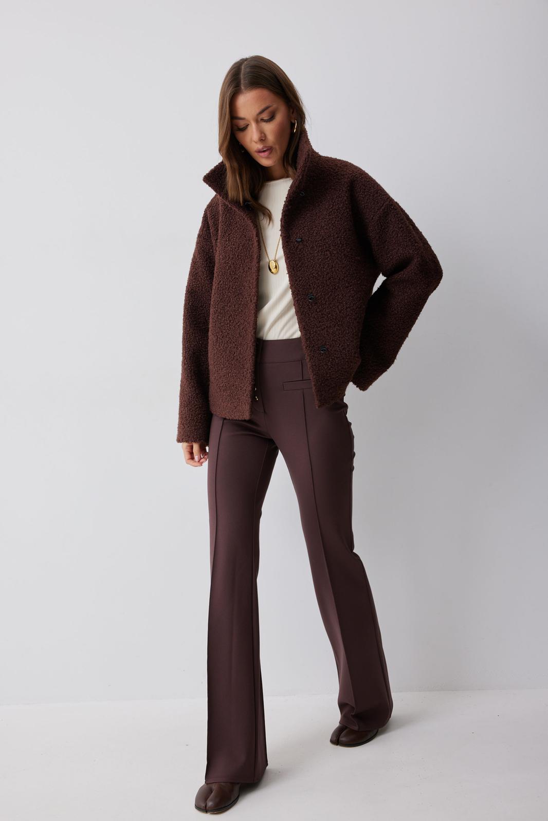 Жакет прямого силуэта из букле на трикотажной основе. Воротник-стойка. Центральная застежка на крючки. Рукав со спущенной линией плеча. По переду прорезные карманы. Жакет на подкладке. Обращаем ваше внимание, что фурнитура может отличаться от фото.