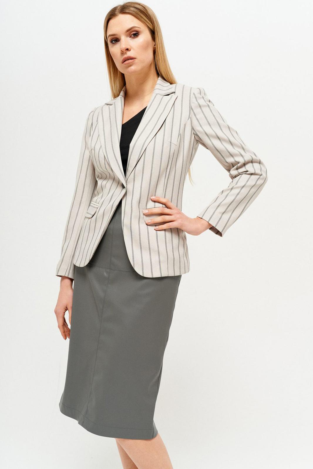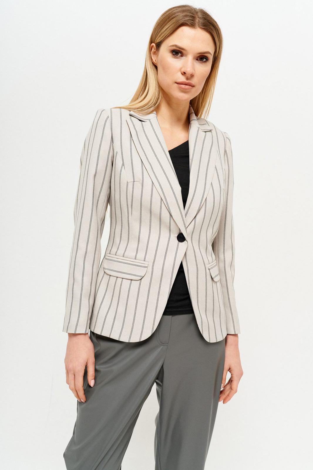 Базовый жакет полуприлегающего силуэта, на подкладке. Воротник пиджачного типа. Застежка центральная, на петлю и пуговицу. Перед и спинка с рельефами, выходящими из проймы. По переду расположены функциональные карманы с клапаном. Спинка с центральным швом. Рукав втачной двушовный длинный.