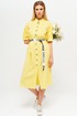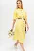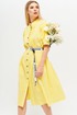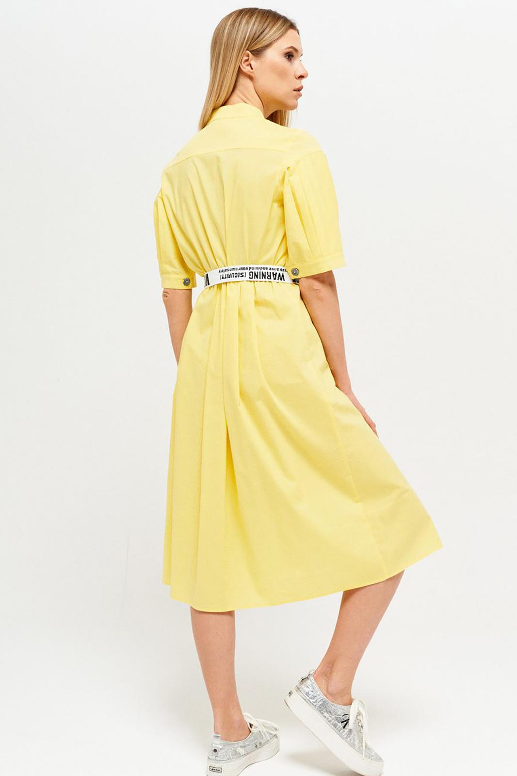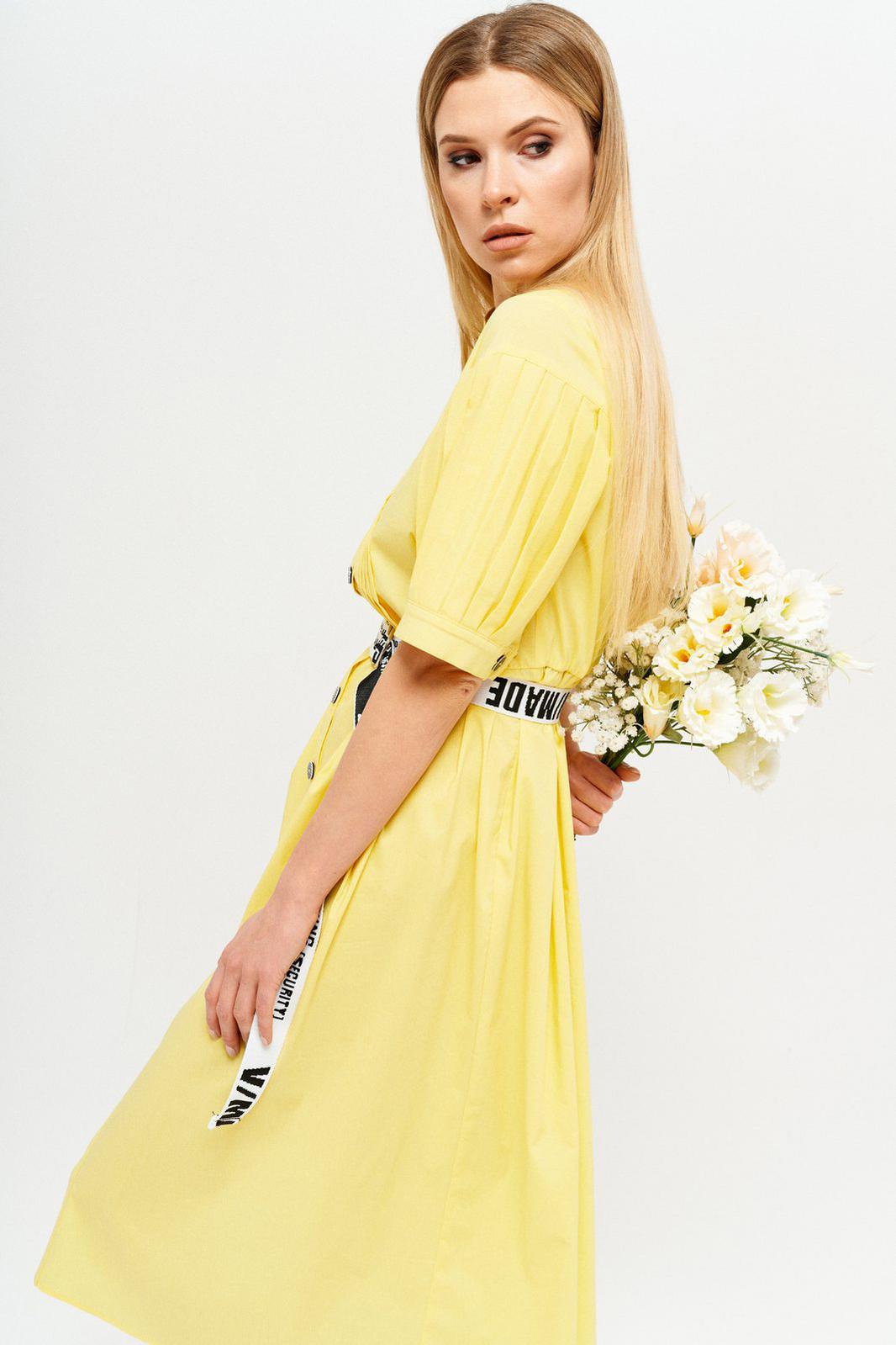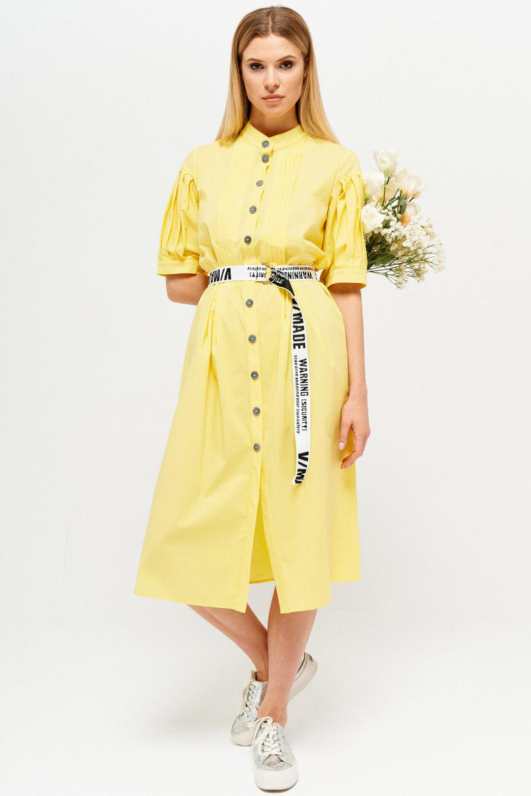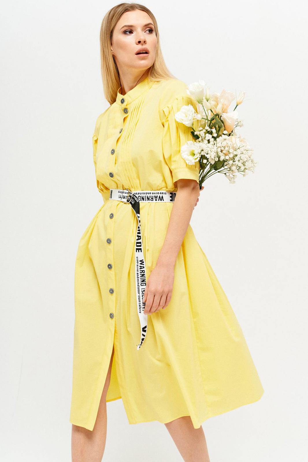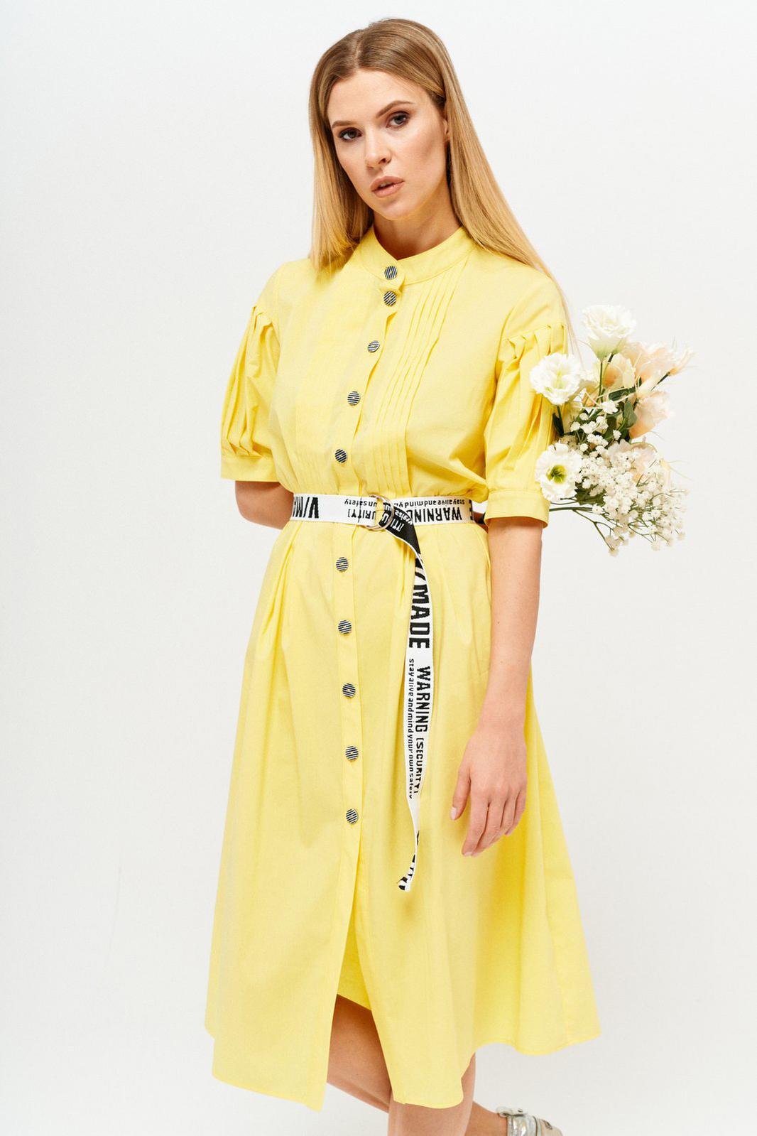 Оригинальное платье из хлопчато-бумажной ткани полуприлегающего силуэта, частично на подкладке. Горловина обработана воротником стойка. Платье отрезное по линии талии с мягкими складками. По переду центральная застежка на петли и пуговицы с притачными планками. Лиф переда с застроченными вертикальными складками. Спинка с кокеткой. Рукав втачной, длиной 3/4, с горизонтальным подрезом и складками, с притачной манжетой. В комплект входит съемный ремень.