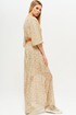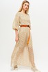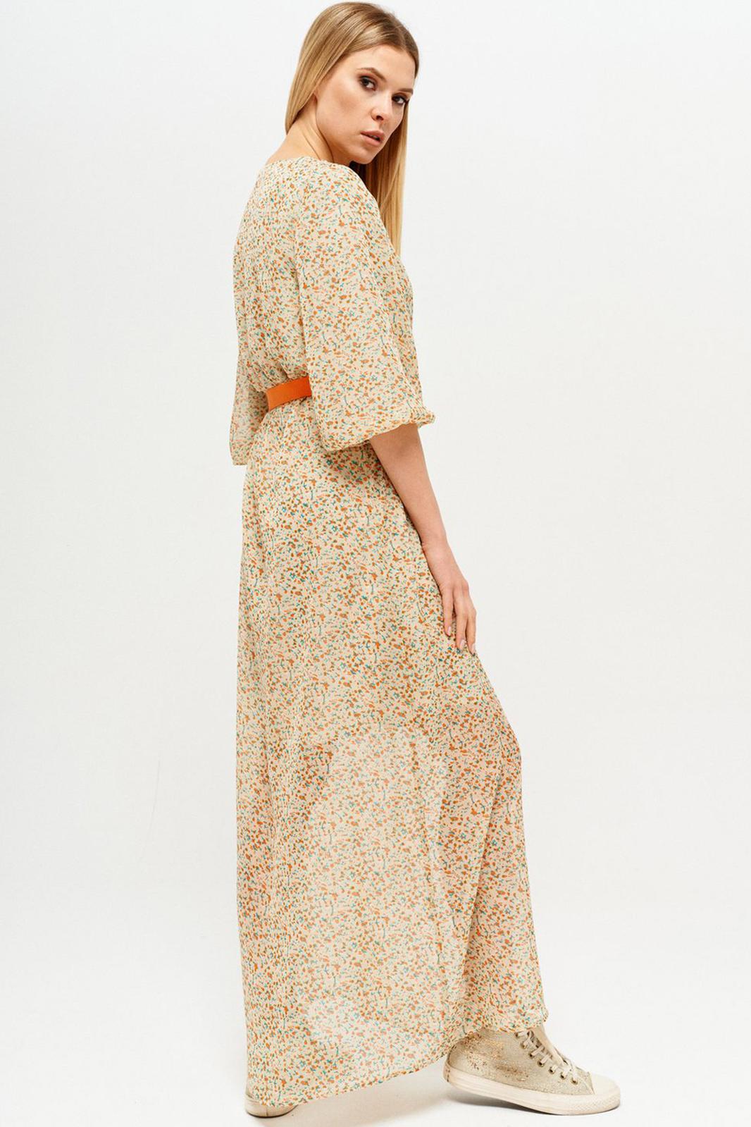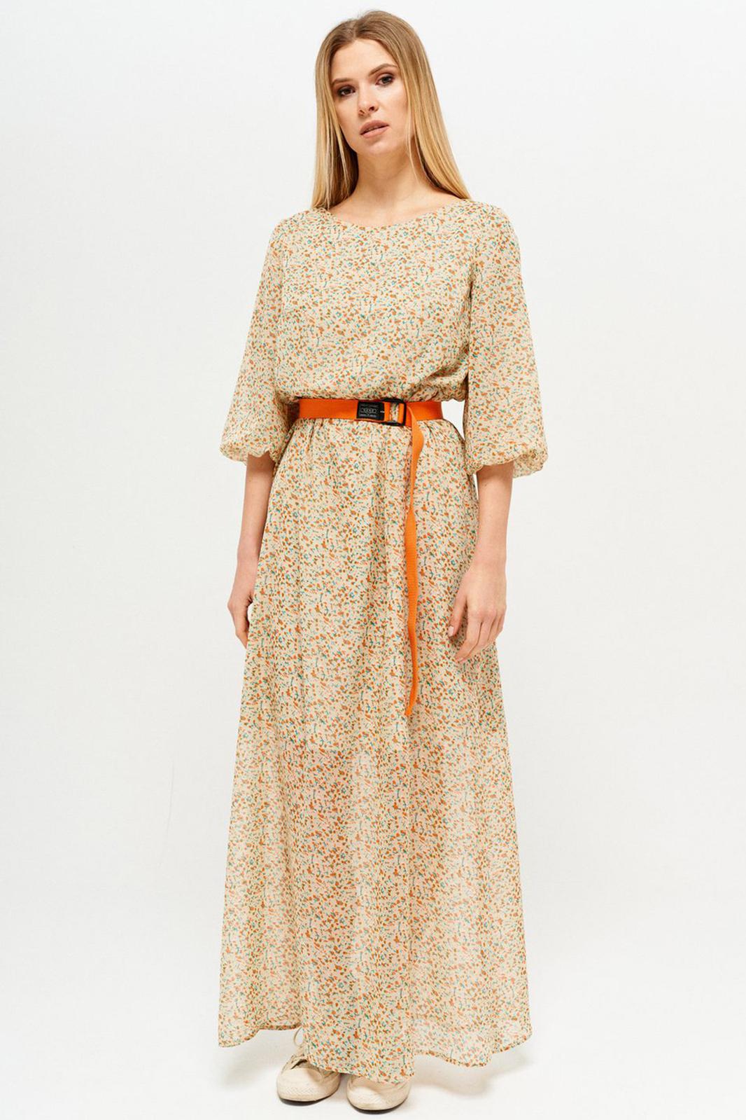 Платье на трикотажной подкладке. Горловина овальной формы с застежкой на навесную петлю и пуговицу на спинке. Платье отрезное по линии талии с эластичной тесьмой. Перед с нагрудными вытачками. Спинка со средним швом. Рукав втачной широкий длиной ¾. В комплект входит съемный ремень.