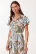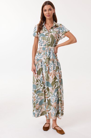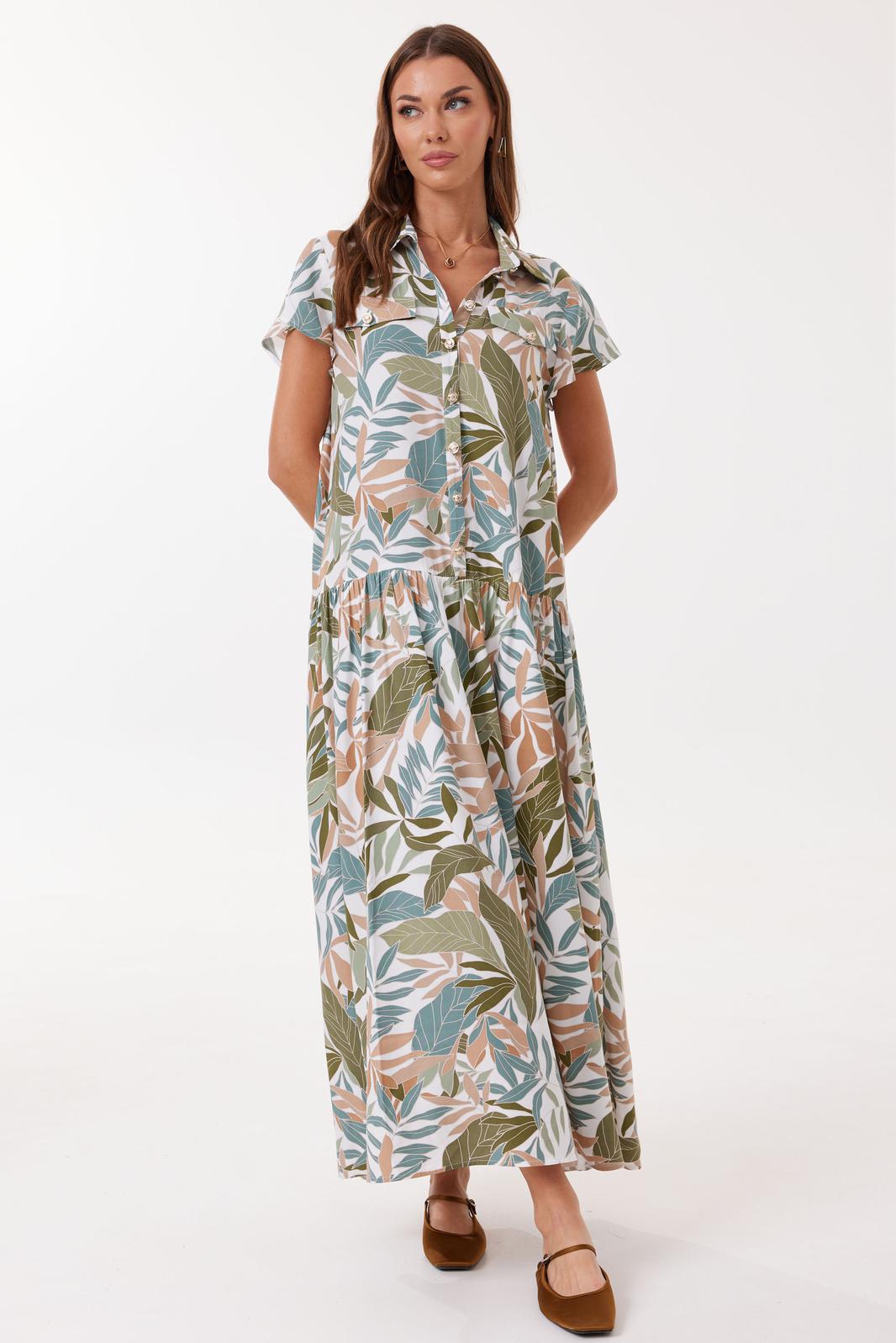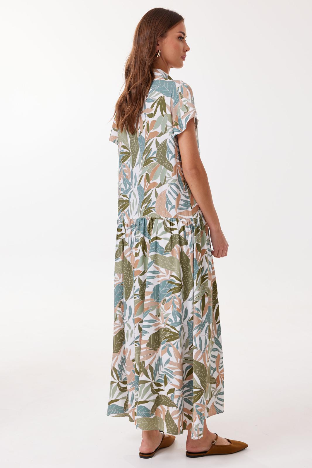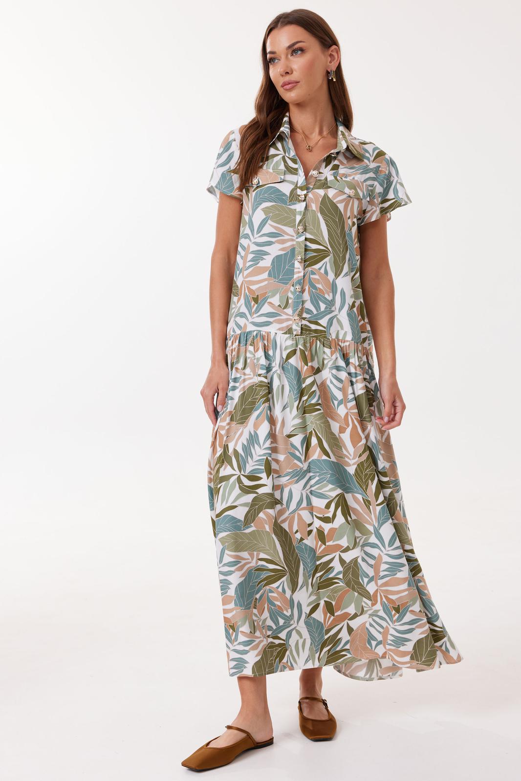 Платье прямого силуэта расширенное книзу из штапельной ткани с принтом. Горловина рубашечного типа с застежкой по центру на петли и пуговицы. Рукав втачной расширенный. Чуть выше линии бедер подрез, в нижней части платья сборка. По переду декоративные клапаны. Платье частично на подкладке. В комплект входит ремень. На все представленные размеры единая длина ремня, составляющая 120см. Модель подойдет на рост 164-170 см. На этикетке будет указан рост 170 см