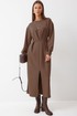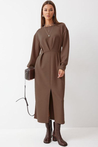 Платье полуприлегающего силуэта из трикотажного полотна. Горловина округлая. Рукав со спущенной линией плеча по низу манжета. Платье отрезное по линии талии. По переду на талии складки. В боковом шве функциональные карманы. В центральном шве юбки разрез.