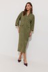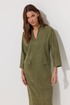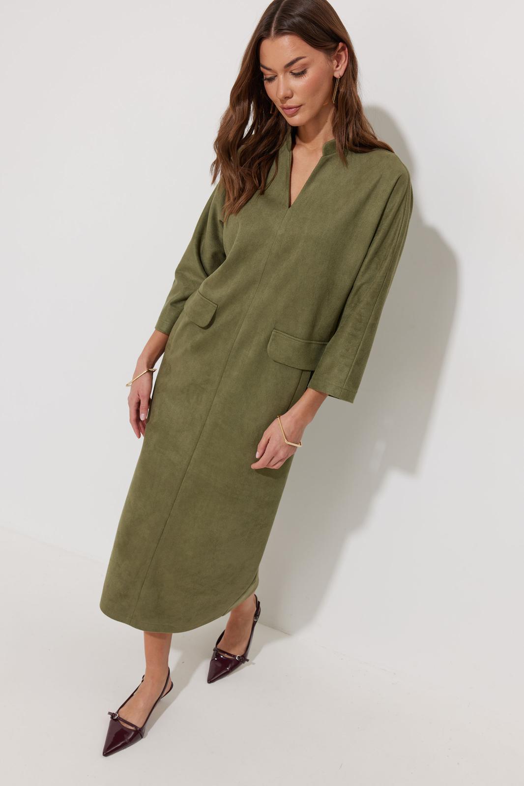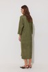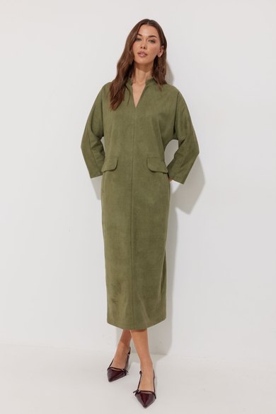 Платье прямого силуэта из трикотажного полотна длины миди. Рукав цельнокроеный, длиной ¾. Воротник-стойка. На передних половинках обработаны прорезные карманы с втачной листочкой и декоративным клапаном. По спинке расположен центральный шов с шлицей по низу.