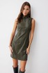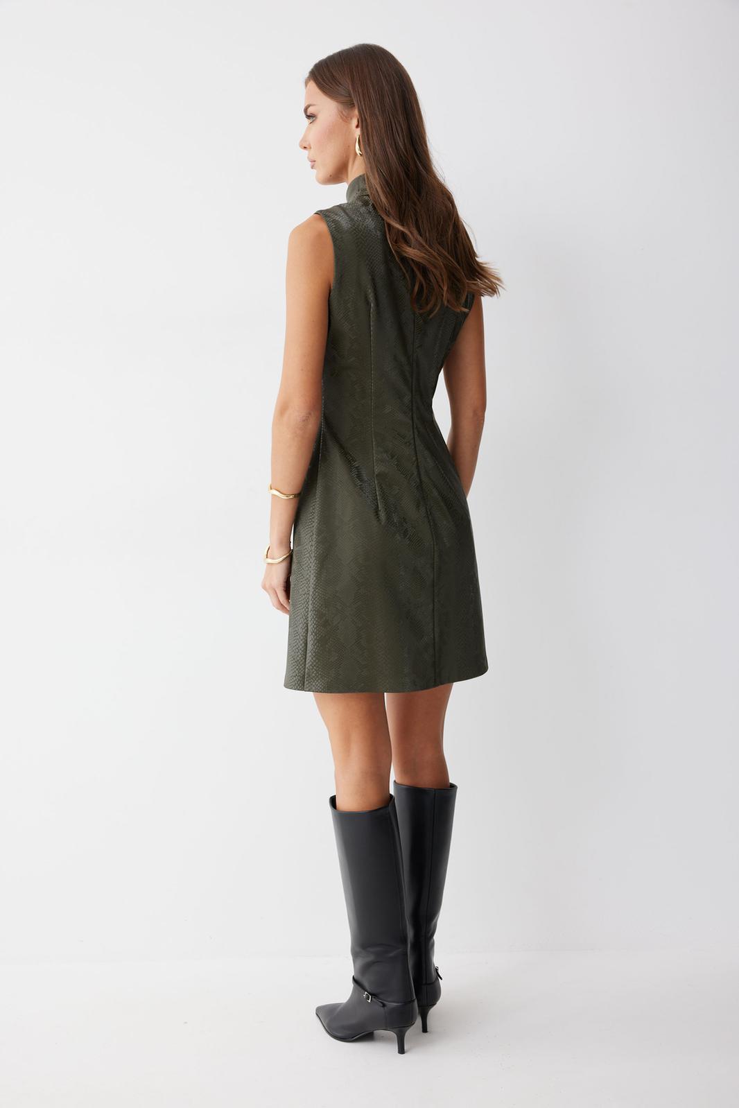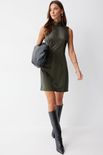 Платье прилегающего силуэта слегка расширенное книзу из экокожи длиной мини. Горловина-стойка. Спереди под грудью подрез, нагрудные и талиевые вытачки. На спинке в центральном шве потайная молния. На спинке платья талиевые вытачки. Обращаем ваше внимание, что фурнитура может отличаться от фото.