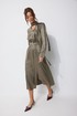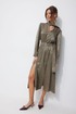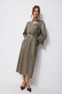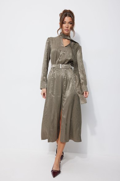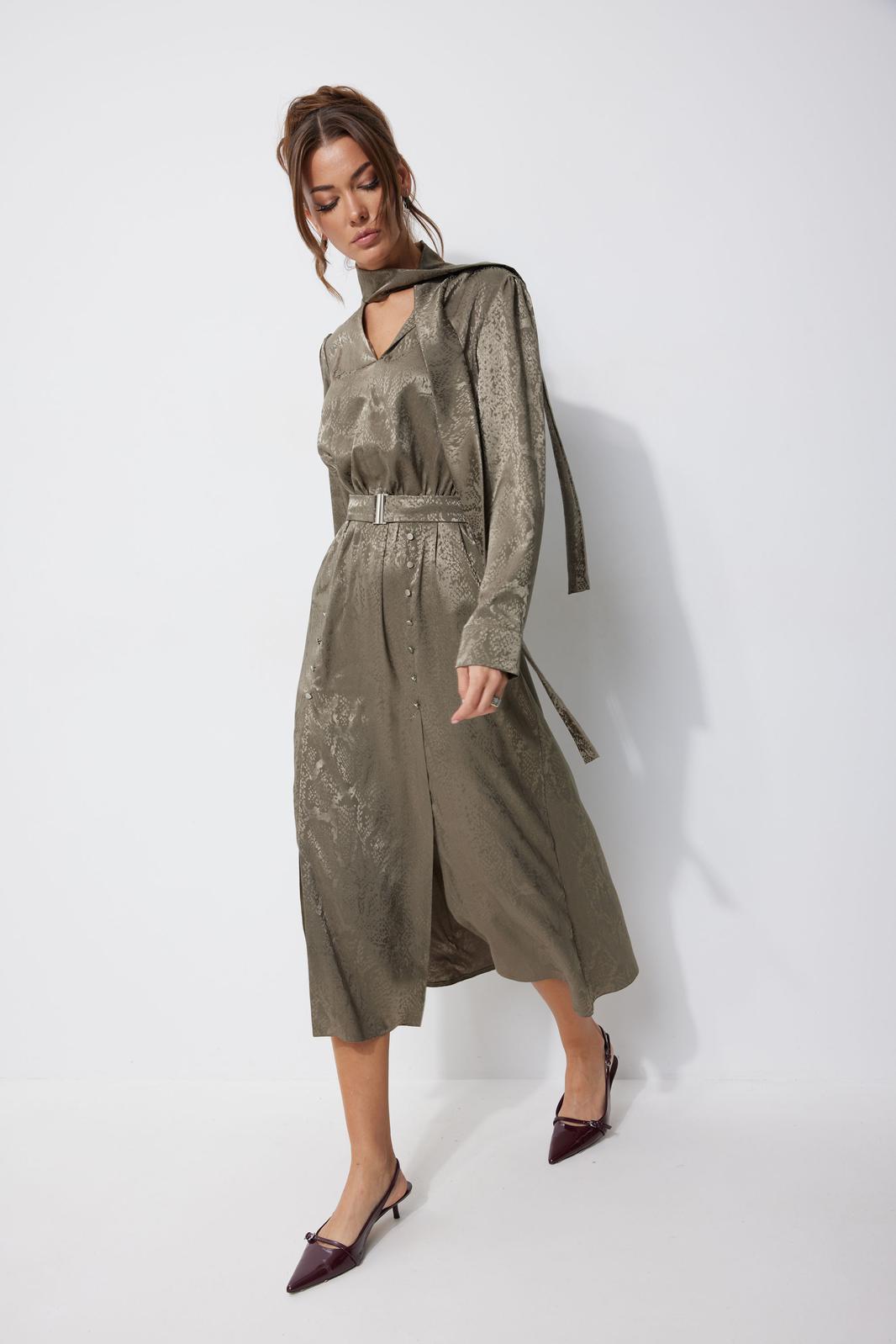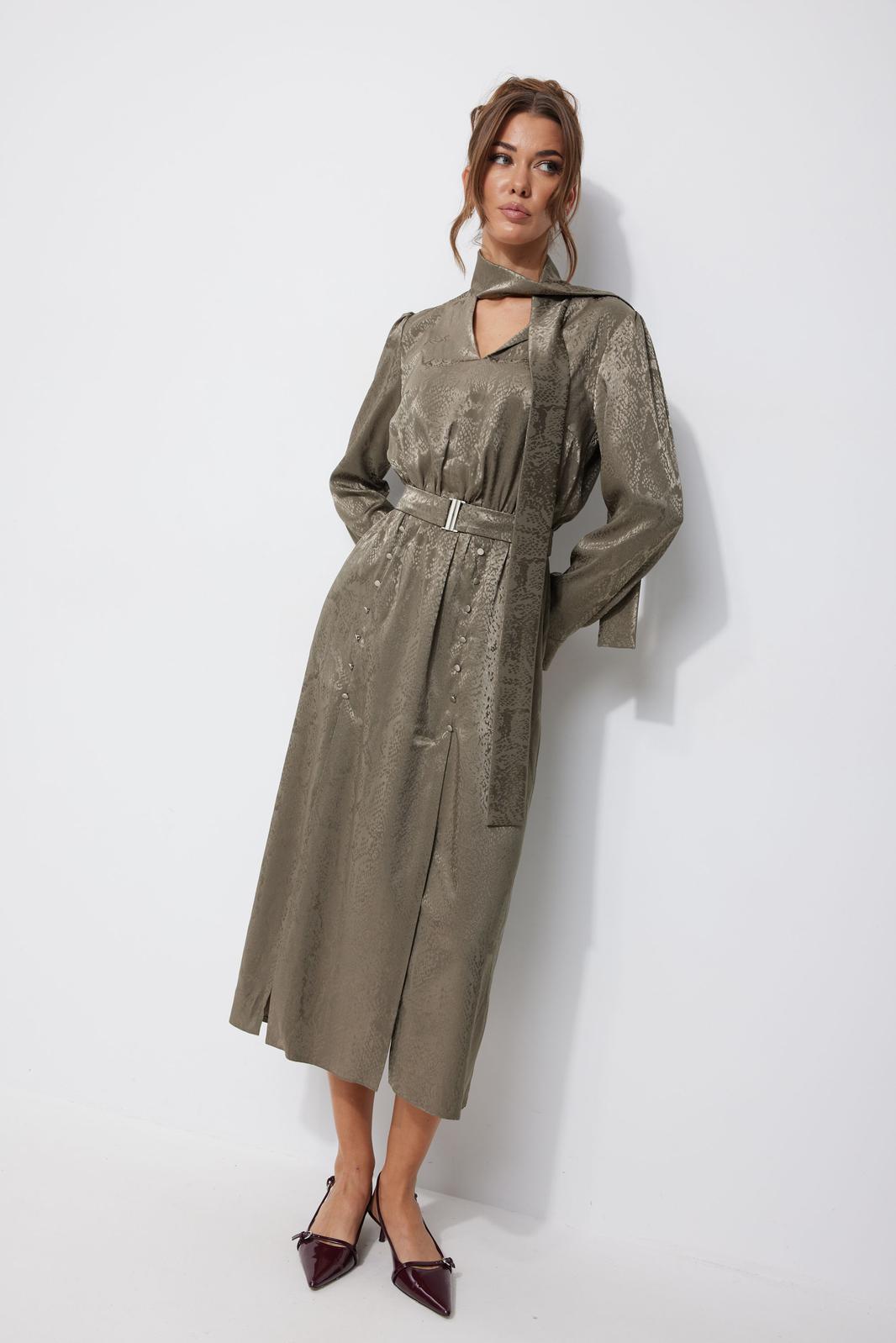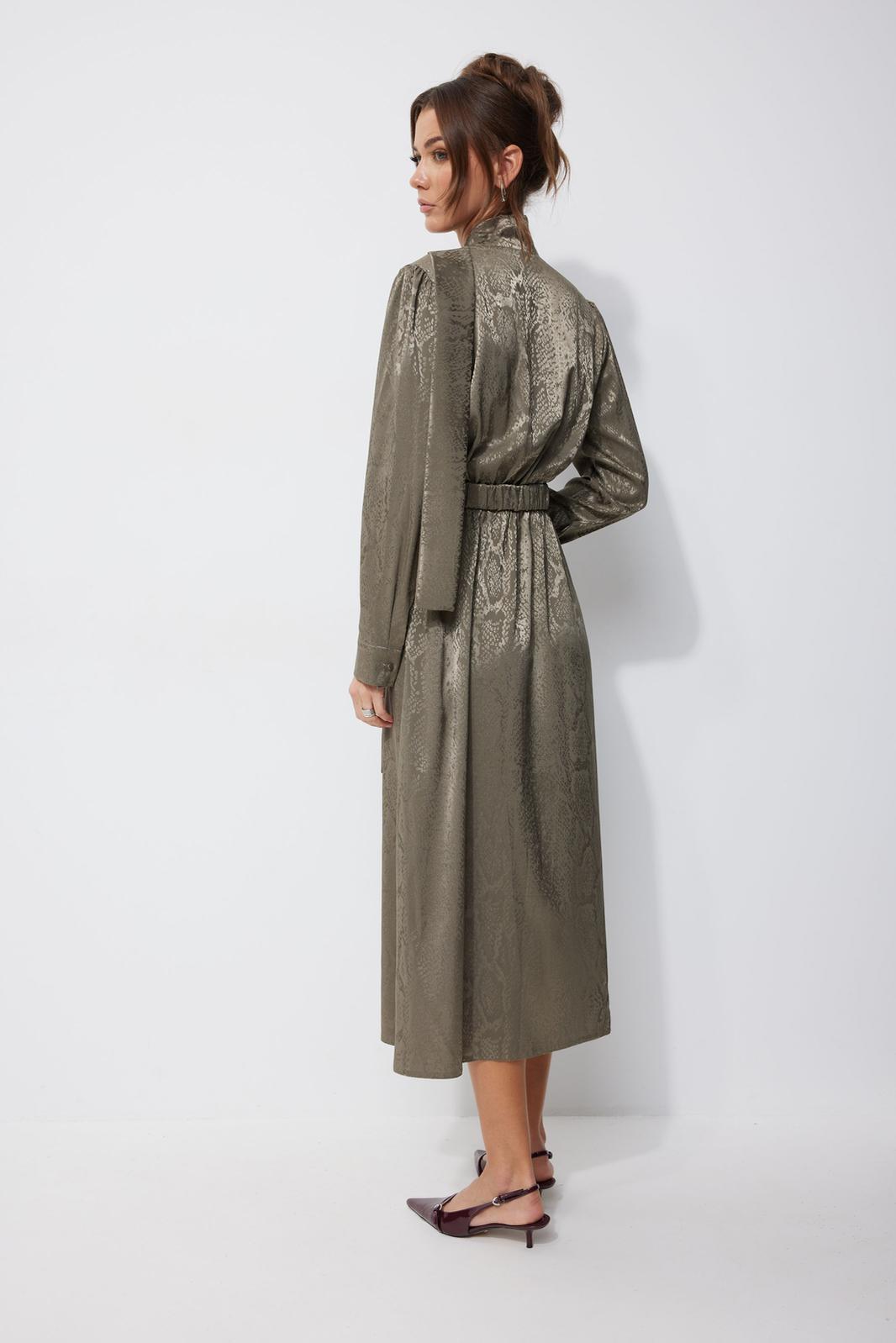 Нарядное платье из жаккардового атласа с анималистичным дизайном. Платье свободного кроя. Отрезное по талии, с резинкой. Рукав длинный, с манжетой с застежкой на петлю с пуговицей. Платье с мягким воротником-стойкой, переходящим в бант-завязки по переду. По переду V-образный вырез по горловине. По переднему полотнищу юбки шлицы в рельефах, рельефы от талии до шлиц декорированы пуговицами. Платье дополняется съемным поясом из основной ткани, с пряжкой. В среднюю часть пояса вставлена резинка. Обращаем Ваше внимание, что фурнитура может незначительно отличаться от фото.