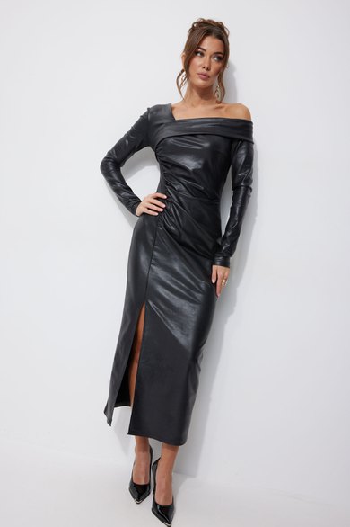 Ассиметричное платье прилегающего силуэта из трикотажного полотна. Верхняя часть платья с ассиметричным вырезом. Рукав одношовный втачной. По переду нагрудная вытачка и рельеф со сборкой, по низу в рельефе разрез. На спинке талиевые вытачки. В боковом шве потайная молния.