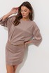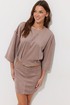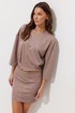 Платье из трикотажного полотна «замша». Длина мини. Платье с заниженной линией талии. Горловина овальная. Лиф свободного, расширенного силуэта, со спущенной линией плеча. По переду и спинке лифа по низу заложено по две складки по бокам, с декоративной отстрочкой. В среднем шве спинки короткая потайная молния. Юбка прилегающего силуэта. По переднему и заднему полотнищам средний шов с декоративной строчкой, а также по две вытачки по бокам с декоративной строчкой. В подрез вставлены шлевки. В боковом шве потайная молния. Рукав широкий, немного ниже линии локтя. Платье дополняется двумя съемными поясами. Обращаем Ваше внимание, что фурнитура может незначительно отличаться от фото.