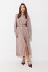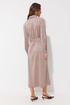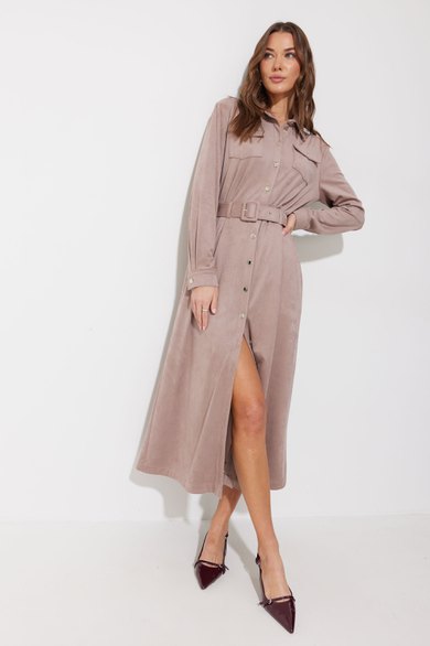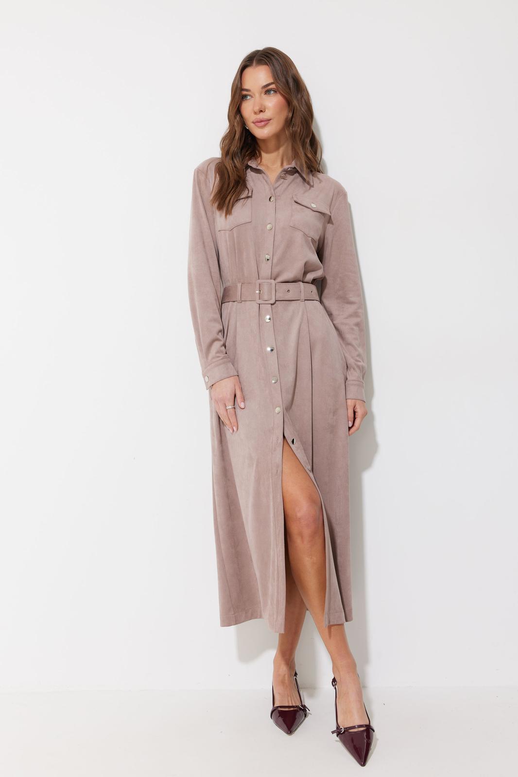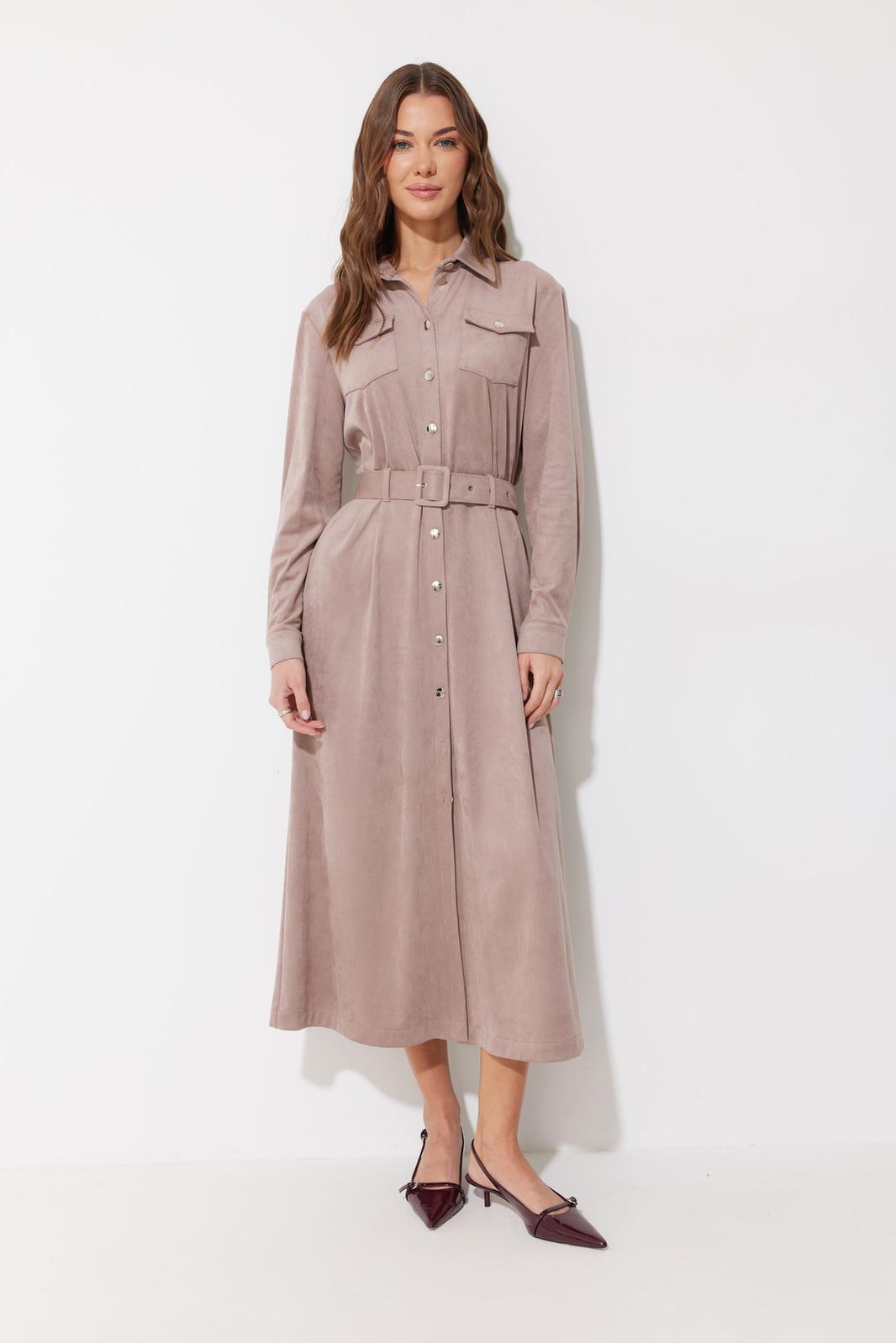 Платье-рубашка из трикотажного полотна «замша». Длина миди. Платье свободного кроя, с небольшим расширением к низу. С отложным воротником на отрезной стойке. Платье с центральной застежкой на петли и металлические пуговицы на ножке. По переду на уровне груди накладные карманы с клапанами, с застежкой на металлическую пуговицу на ножке. По спинке кокетка, бантовая складка, выходящая из-под кокетки. По переду и спинке на уровне линии талии настрочены шлевки. Рукав длинный, двухшовный, с двумя складками по нижнему срезу, с манжетой с застежкой на металлическую пуговицу на ножке. По воротнику, манжетам, кокетке, локтевому шву выполнены отделочные строчки. Платье дополняется съемным поясом с прямоугольной пряжкой. Пояс выполнен из основной ткани. Обращаем Ваше внимание, что фурнитура может незначительно отличаться от фото.