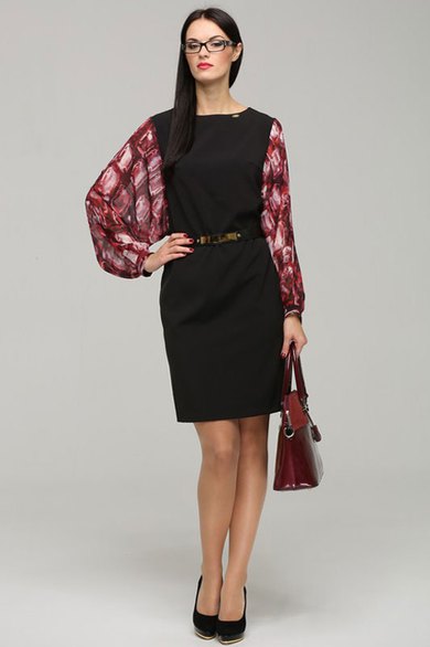 Платье женское полуприлегающего силуэта из однотонной ткани. Полочка прямая цельновыкроенная с нагрудными вытачками. Спинка со средним швом с потайной молнией, шлицей и талиевыми вытачками. Рукав из шифона дизайн втачивается в углубленную пройму. Низ рукава со сборкой на притачной манжете. Горловина с вырезом лодочка. С правой стороны горловины пришито фирменное металлическое украшение. Талия подчеркивается съемным поясом. Длина платья в 48-50 р-рах - 98 см. в 52-56р-рах - 102см, длина рукава во всех размерах 61см.