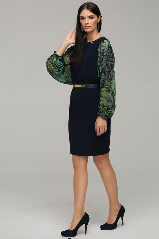 Платье женское полуприлегающего силуэта из однотонной ткани. Полочка прямая цельновыкроенная с нагрудными вытачками. Спинка со средним швом с потайной молнией, шлицей и талиевыми вытачками. Рукав из шифона, дизайн втачивается в углубленную пройму. Низ рукава со сборкой на притачной манжете. Горловина с вырезом лодочка. С правой стороны горловины пришито фирменное металлическое украшение. Талия подчеркивается съемным поясом. Длина платья в 48-50 р-рах - 98 см. в 52-56 р-рах - 102 см, длина рукава во всех размерах 61 см.