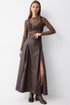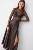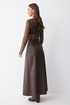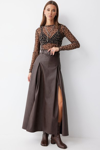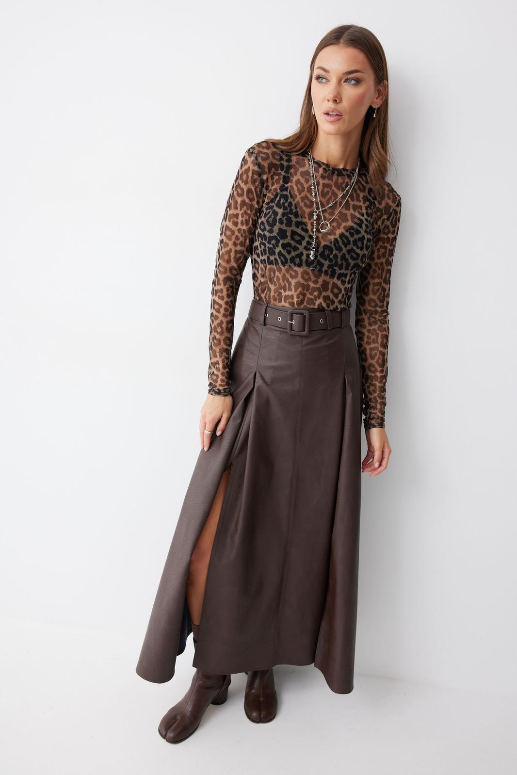 Стильная юбка А-силуэта из экокожи , длины макси. По верху юбки притачной пояс с шлевками для ремня. На передних половинках расположены вытачки со встречной складкой и разрезами по низу. На задних половинках расположены талиевые вытачки. На спинке по центру потайная молния. В комплект входит ремень.