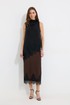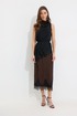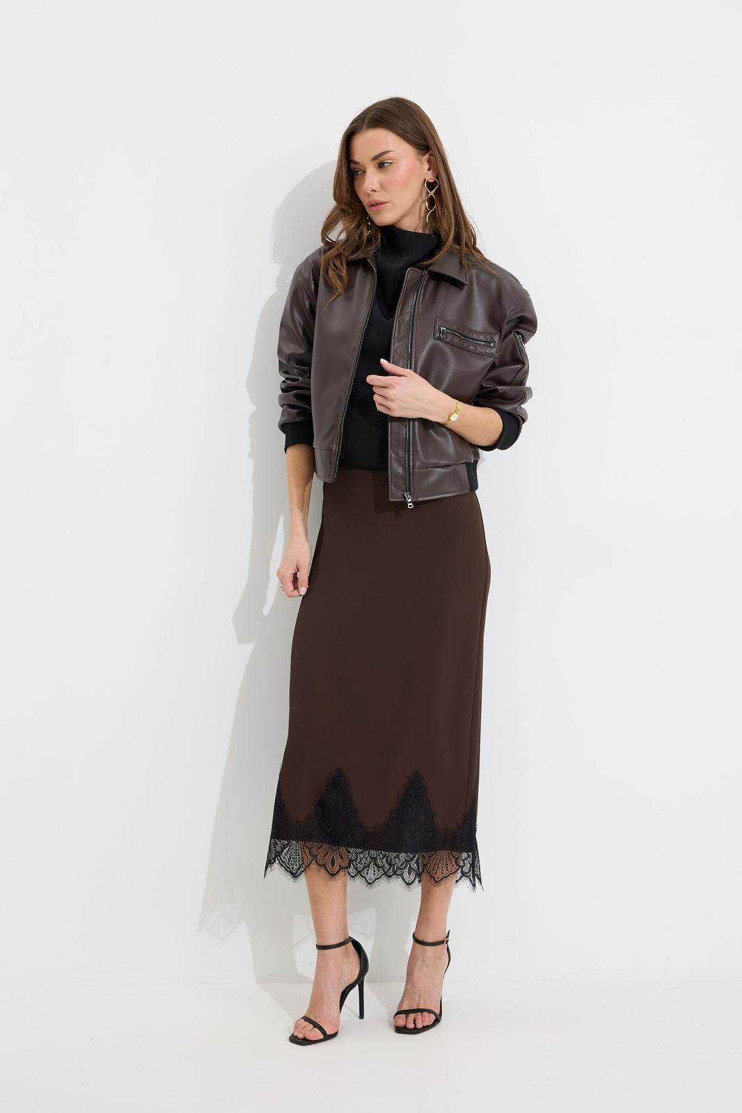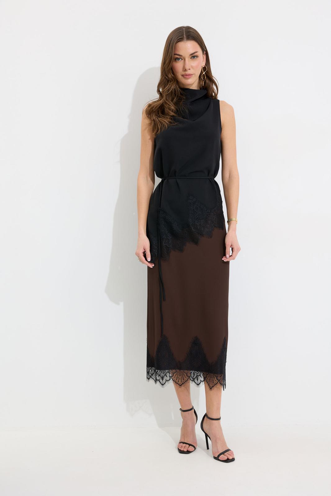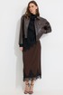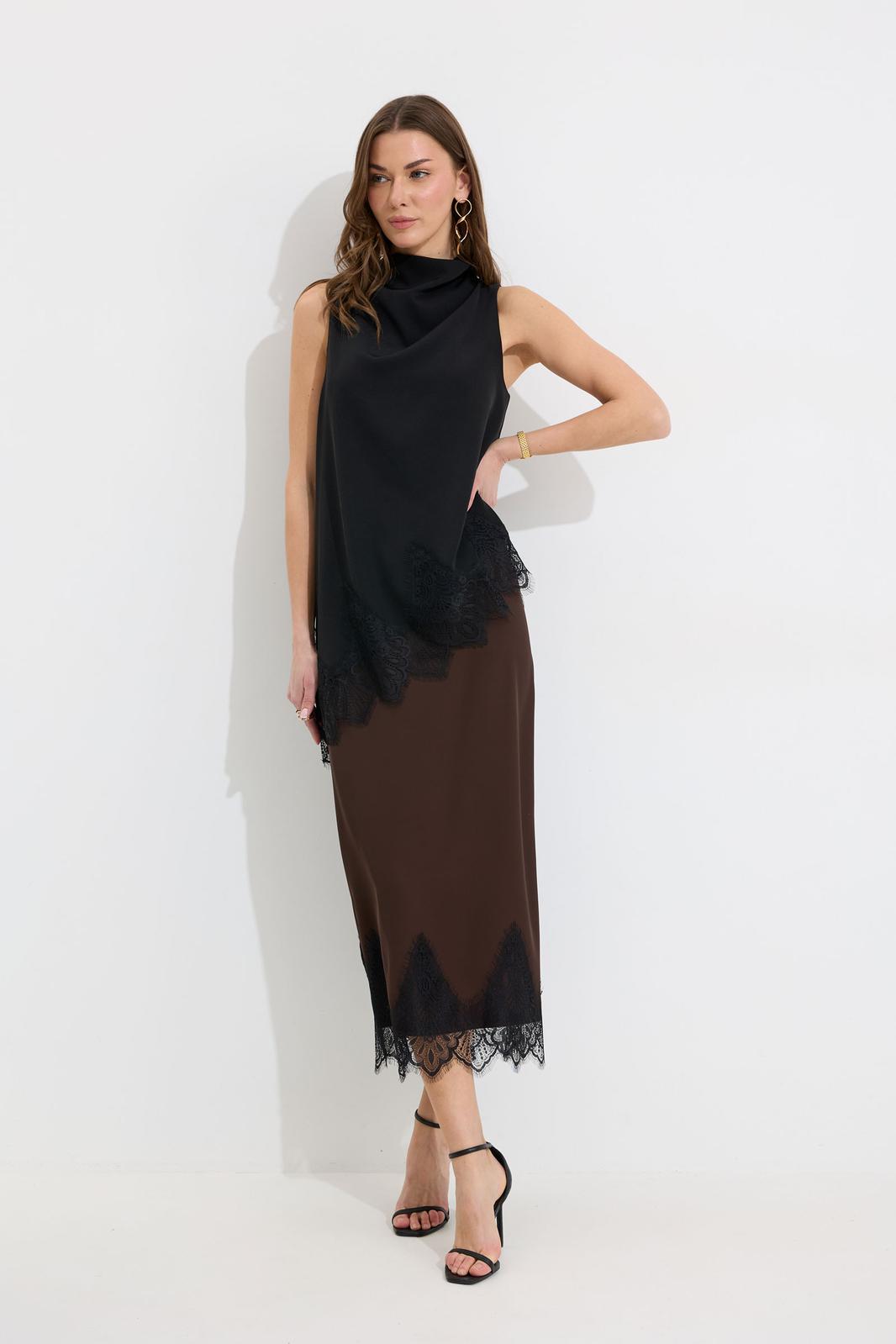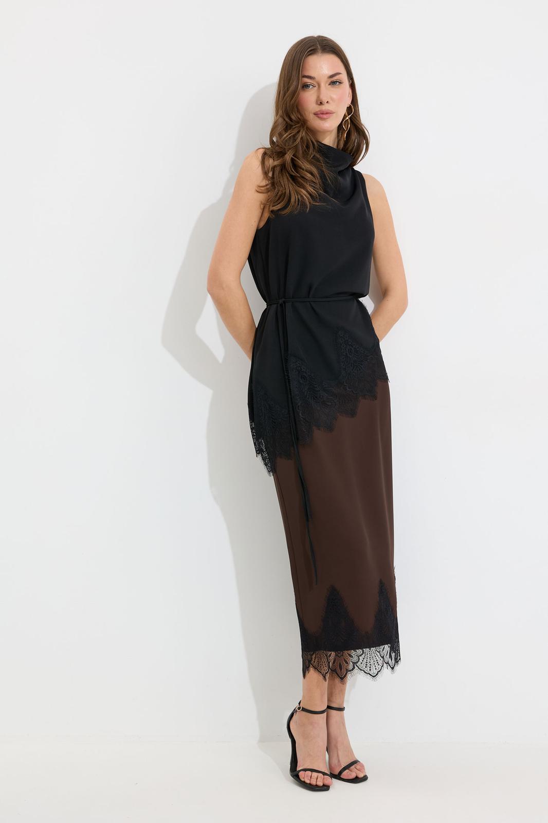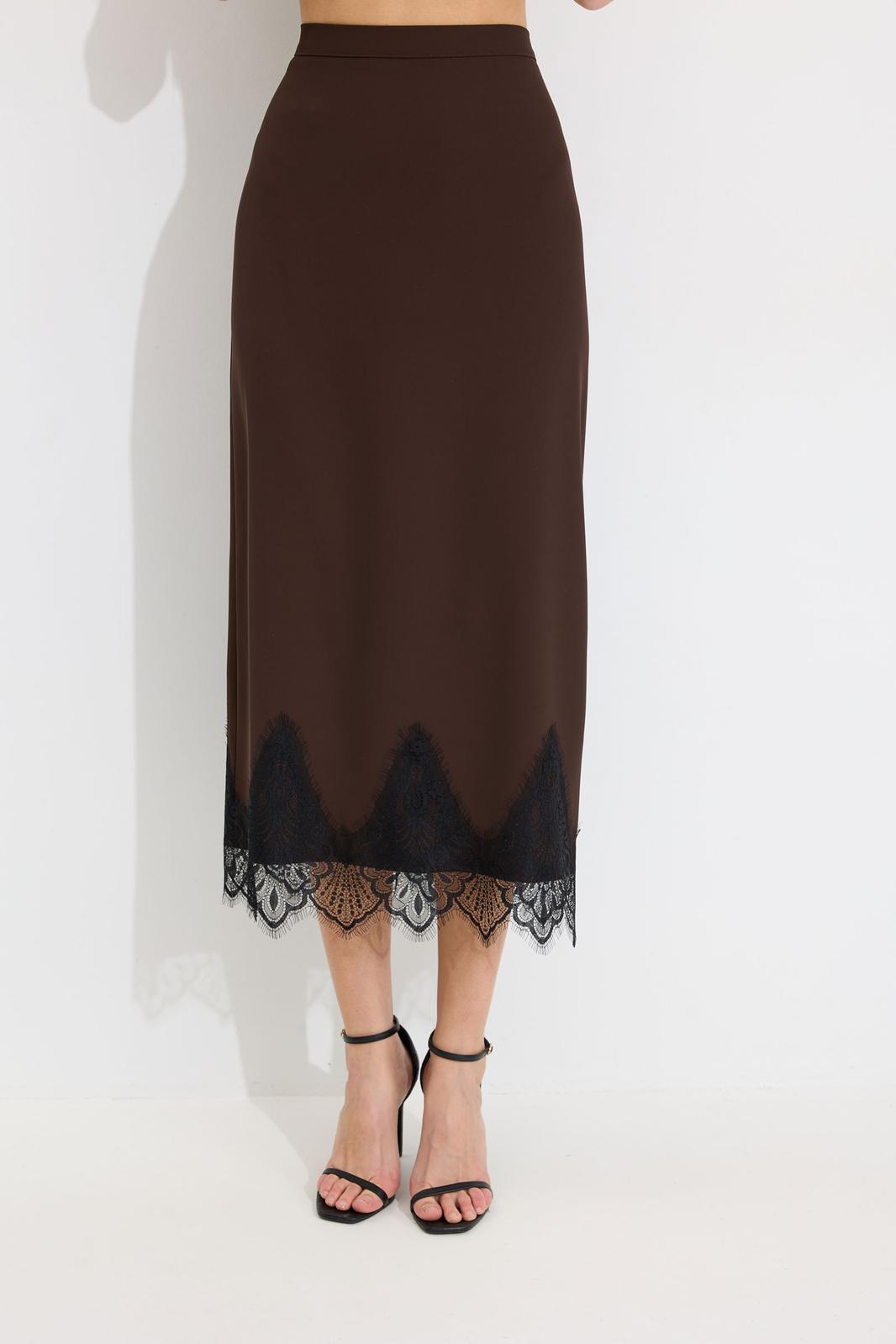 Юбка прямого силуэта из струящейся ткани. По верху юбки притачной пояс с резинкой по задней половинке пояса от бокового шва до вытачки. В центральном шве потайная молния, по низу разрез. По низу юбки декоративная тесьма( кружево). Обращаем ваше внимание, что фурнитура может отличаться от фото.