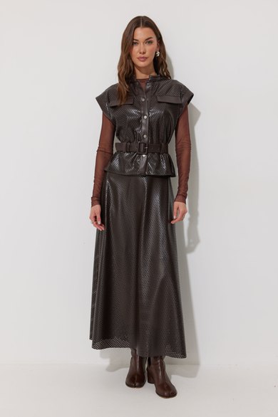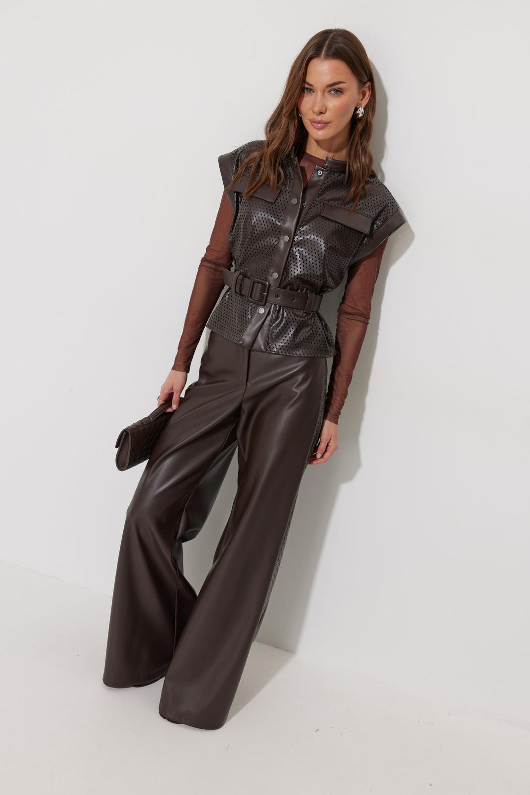 Жилет прямого силуэта из экокожи с перфорацией. Горловина-стойка, по переду застежка на кнопки. Жилет со спущенной линией плеча и отделочными манжетами. По переду кокетка с декоративными клапанами и шлевками для ремня. В комплект входит съемный ремень. Обращаем ваше внимание, что фурнитура может отличаться от фото.