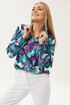 Яркая блуза прямого силуэта фирмы Ma cherie. Застежка центральная на петли и пуговицы. Рукав одношовный втачной, низ рукава оформлен манжетой на две петли и пуговицы. Низ фигурный, по низу бокового шва идут разрезы. Спинка цельнокроеная. Горловина с отложным рубашечным воротником на стойке.