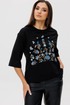 Джемпер свободного силуэта. Горловина округлая, обработана обтачкой. Полочка цельная с нагрудными вытачками, на груди дизайнерская вышивка. Спинка со средним швом, в верхней части которого застежка на навесную петлю и пуговицу. Рукав 3/4 одношовный втачной.