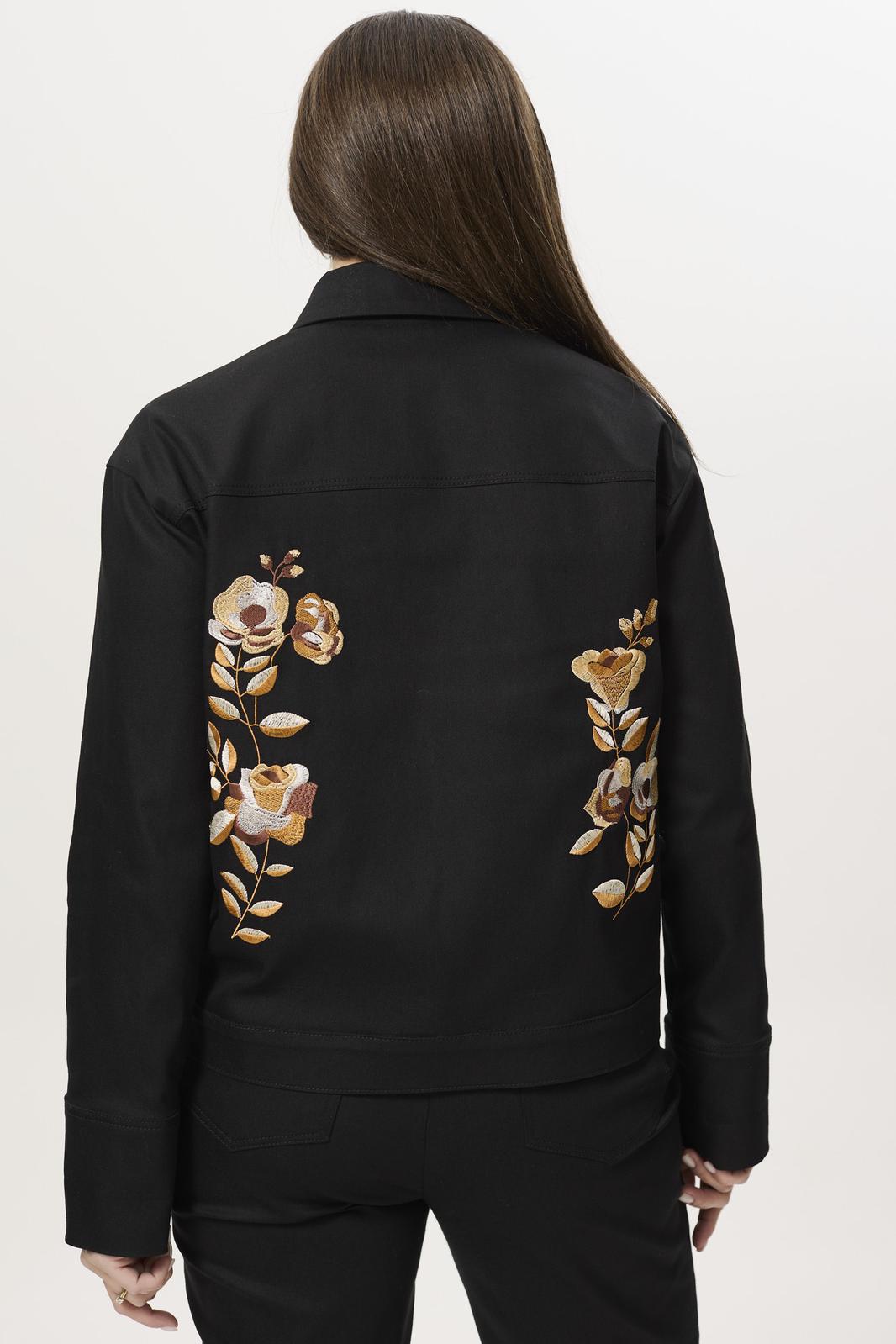 Полочка с рельефами, застежка на петли и пуговицы, выполнена на притачной планке. Воротник рубашечного типа. Полочка и спинка с кокеткой, на спинке дизайнерская вышивка. Рукав втачной, одношовный, по низу рукава широкая притачная манжета, линия плеча спущена.