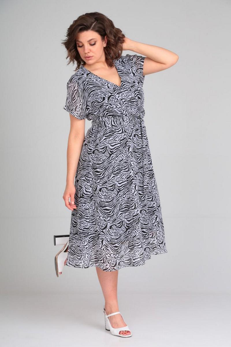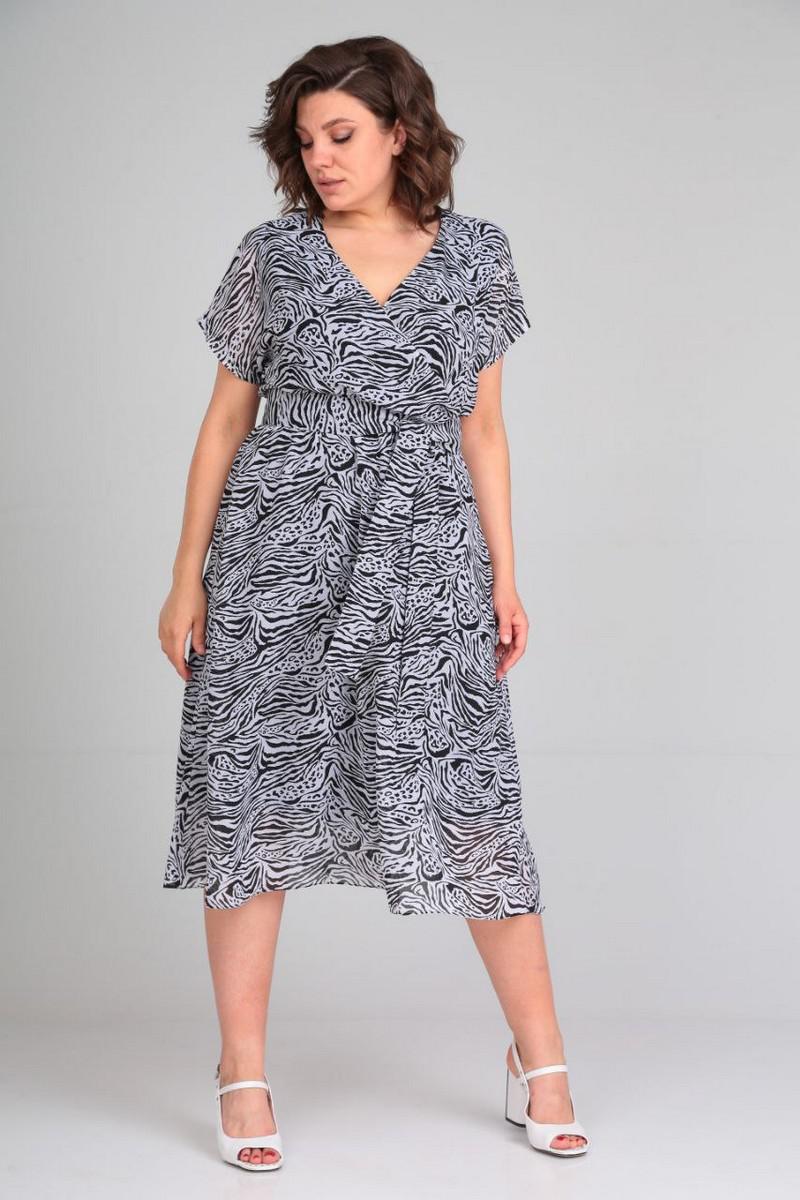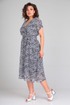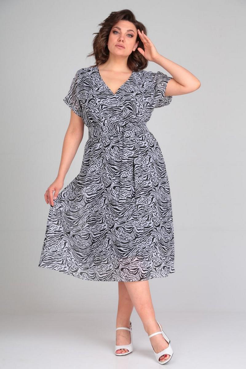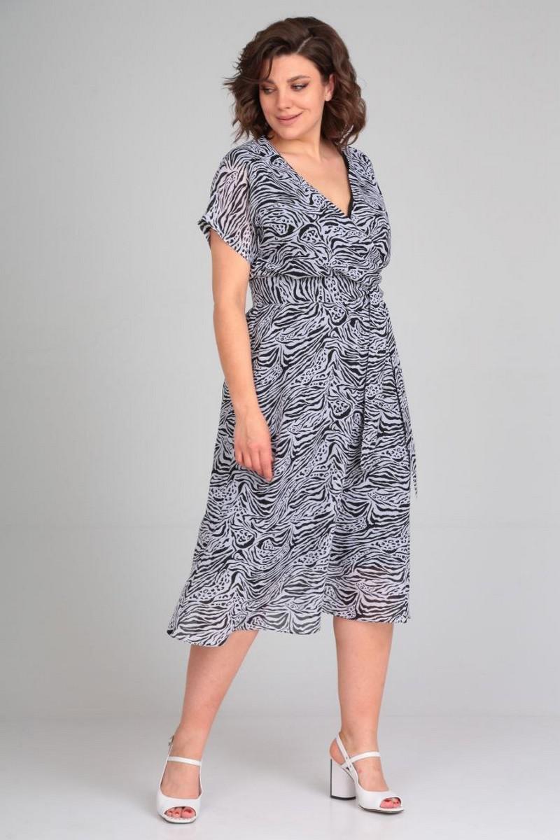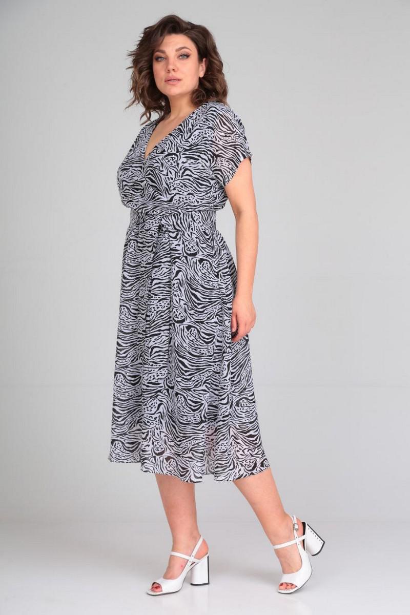 Шифоновое платье из струящейся ткани длиной миди. Верхняя часть переда на запах, рукав целнокроеный. По талии подрез, в который вставлена эластичная тесьма (резинка). Юбка платья расклешенная. Платье на подкладке. В состав входит пояс из основной ткани.