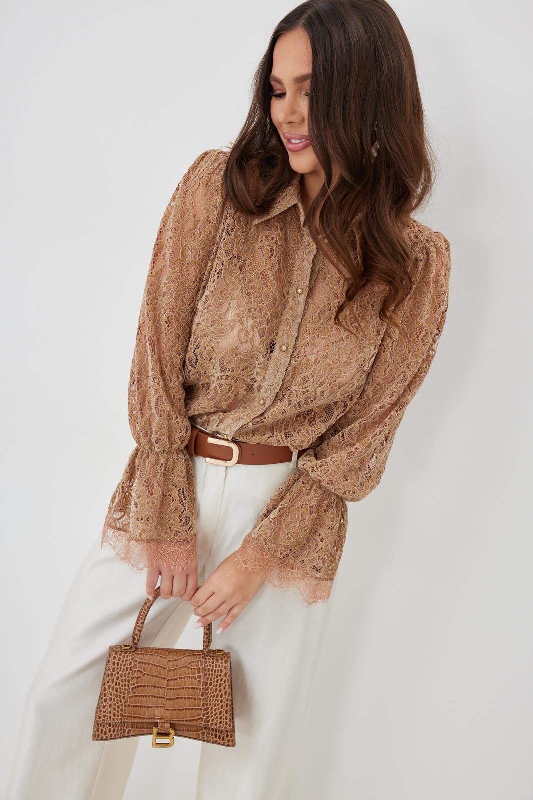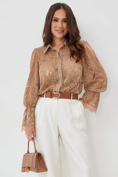 Невероятно нежная и стильная блуза прямого кроя с нагрудными вытачками. Рукав втачной, по низу присборен на эластичную тесьму и дополнен притачной кружевной манжетой. Застежка центральная на пришивные пуговицы. Воротник отложной на стойке. Блуза выполнена из красивого нежного бархатного кружева премиум качества. Длина блузы от плечевого шва 67см. Длина рукава 69 см.