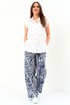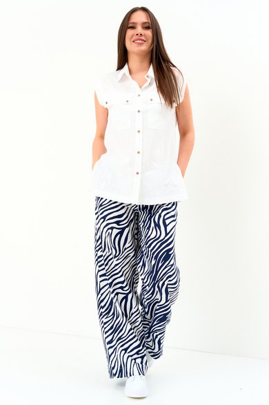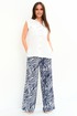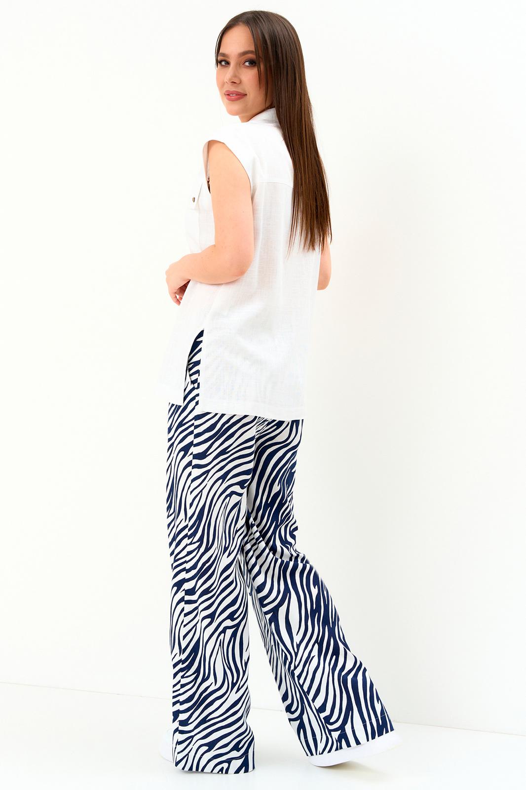 Легкий стильный комплект из натуральных ткани, состоящий из блузы и брюк. Блуза свободного прямого кроя с центральной застежкой на пришивные пуговицы. Воротник отложной на стойке. Широкие брюки прямого кроя , с притачным поясом, дополненным эластичной тесьмой. Застежка на молнию и пришивную пуговицу. Брюки дополнены боковыми карманами. Длина блузы от плечевого шва 69 см. Длина брюк по боковому шву 105 см.