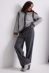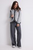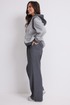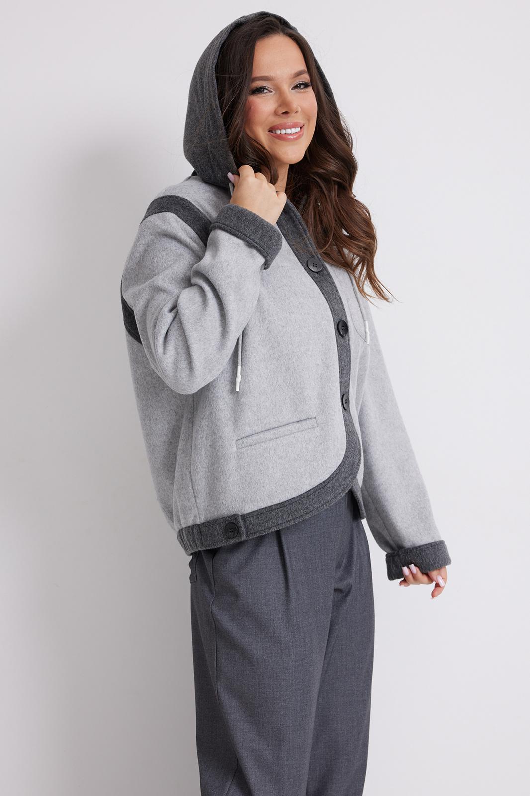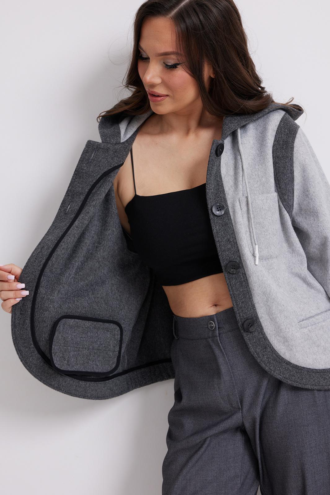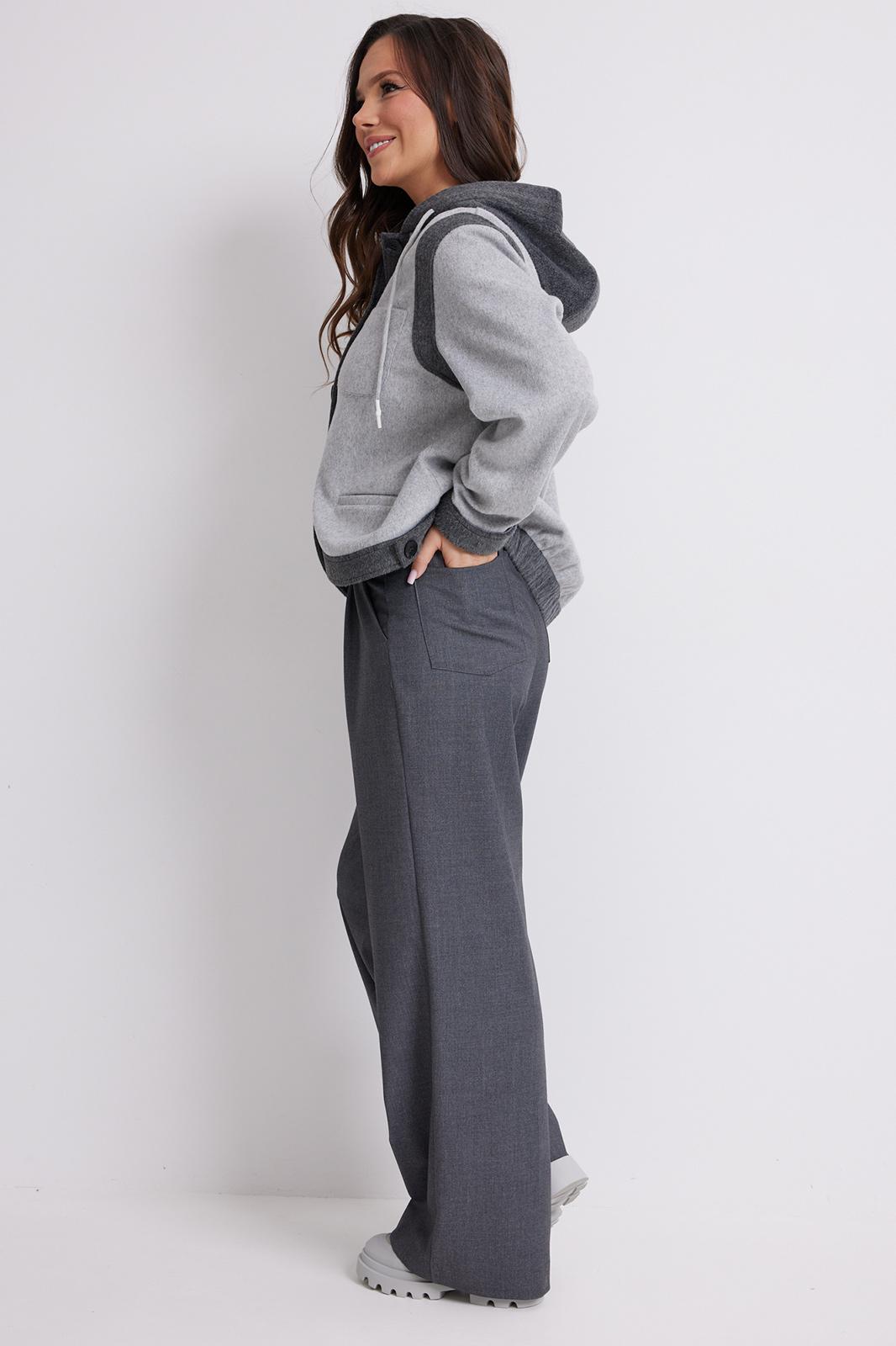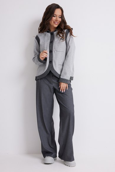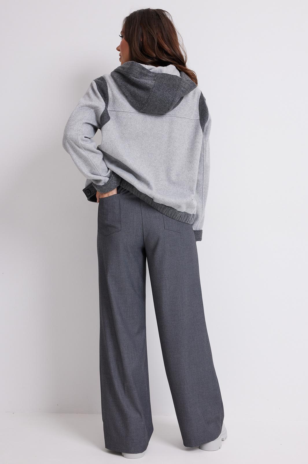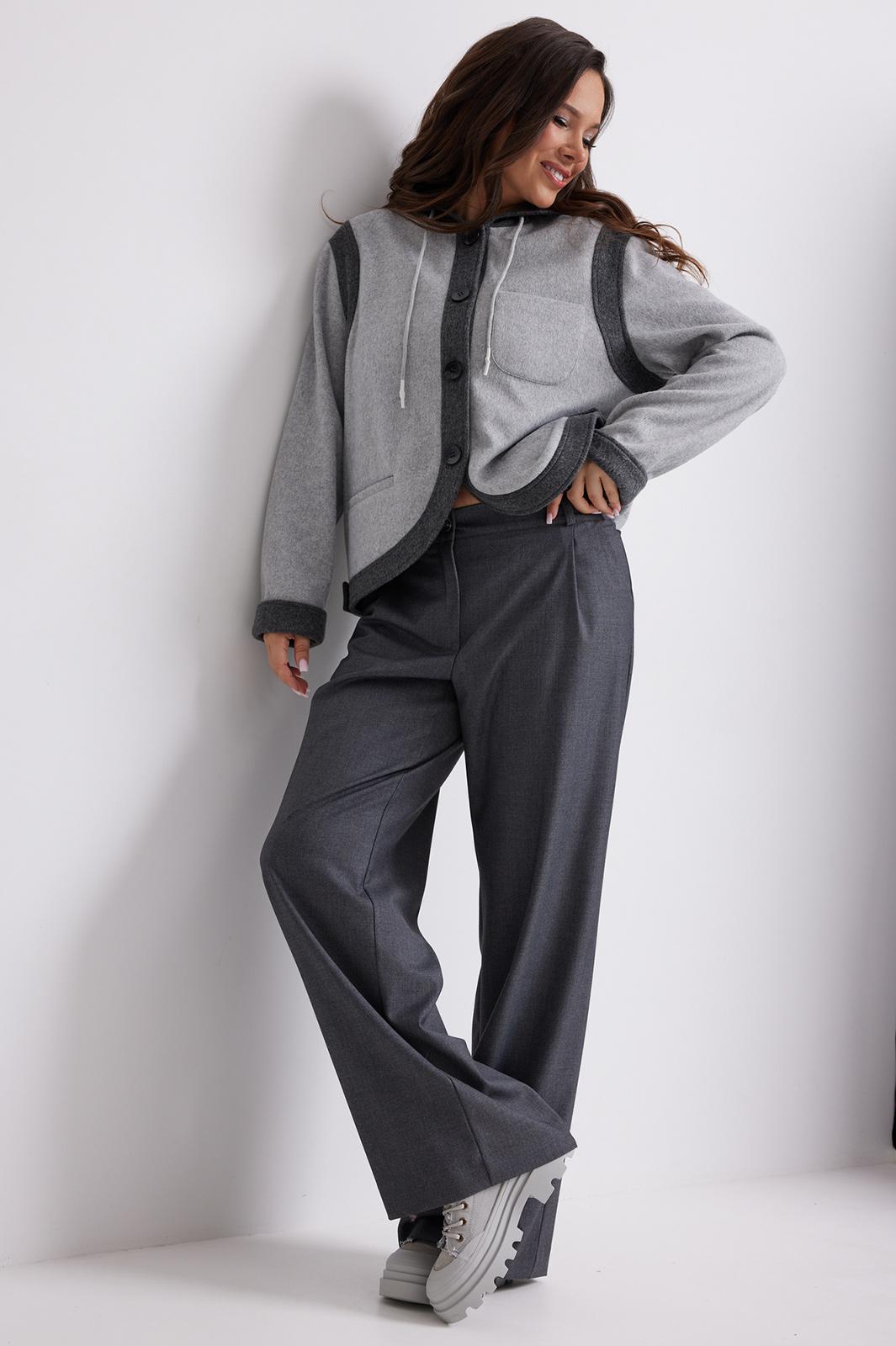 Стильный комплект из бомбера и брюк. Бомбер свободного кроя, без подкладки, с центральной застежкой на пришивные пуговцы. Выполнен из плотного трикотажного полотна, напоминающего пальтовую ткань с мягкой и комфортной изнанкой. Тактильно приятный, уютный и теплый бомбер дополнен капюшоном. Рукав втачной, слегка спущен. Бомбер может использоваться самостоятельно, или под верхнюю одежду. Брюки прямого кроя с притачным поясом, дополненным эластичной тесьмой. Выполнены из комфортной костюмной ткани. Посадка средняя. Застежка гульфик на молнию и пуговицу. Дополнены функциональными боковыми карманами и накладными задними. Брюки дополнены шлевками для пояса. Длина бомбера от плечевого шва 65см. Длина рукава 60см. Длина брюк по боковому шву 108см
