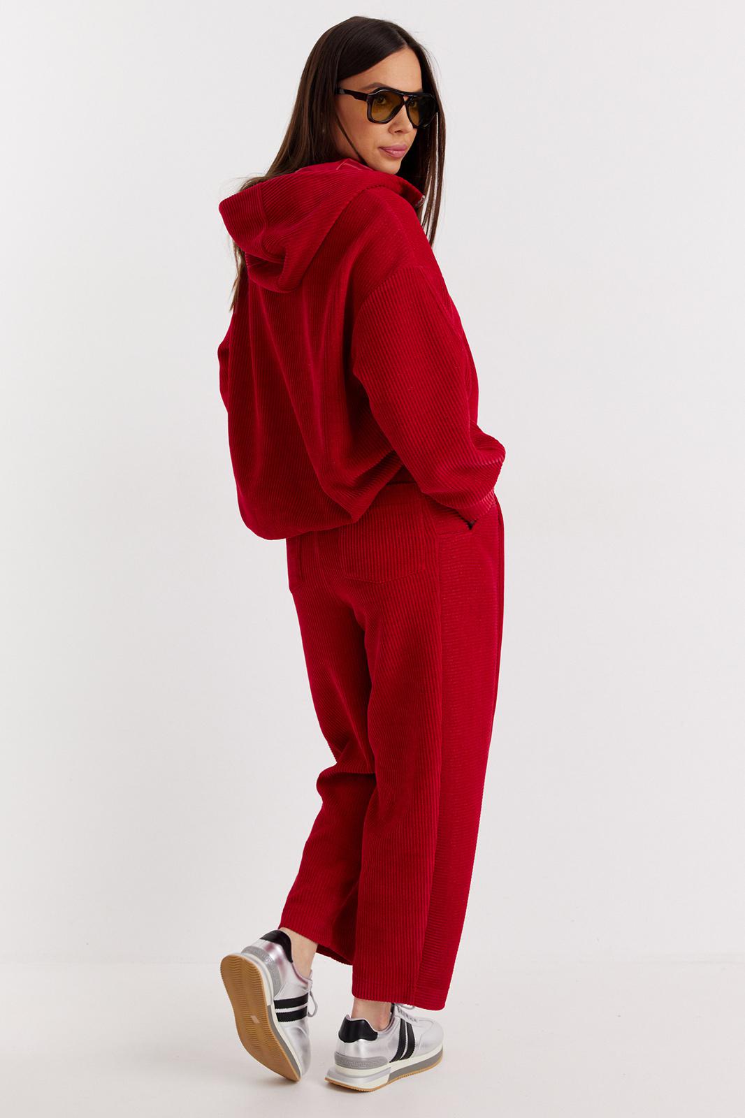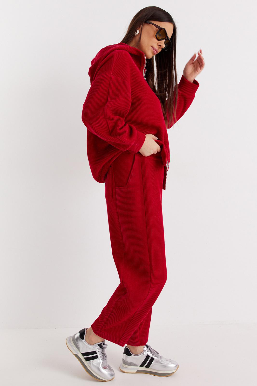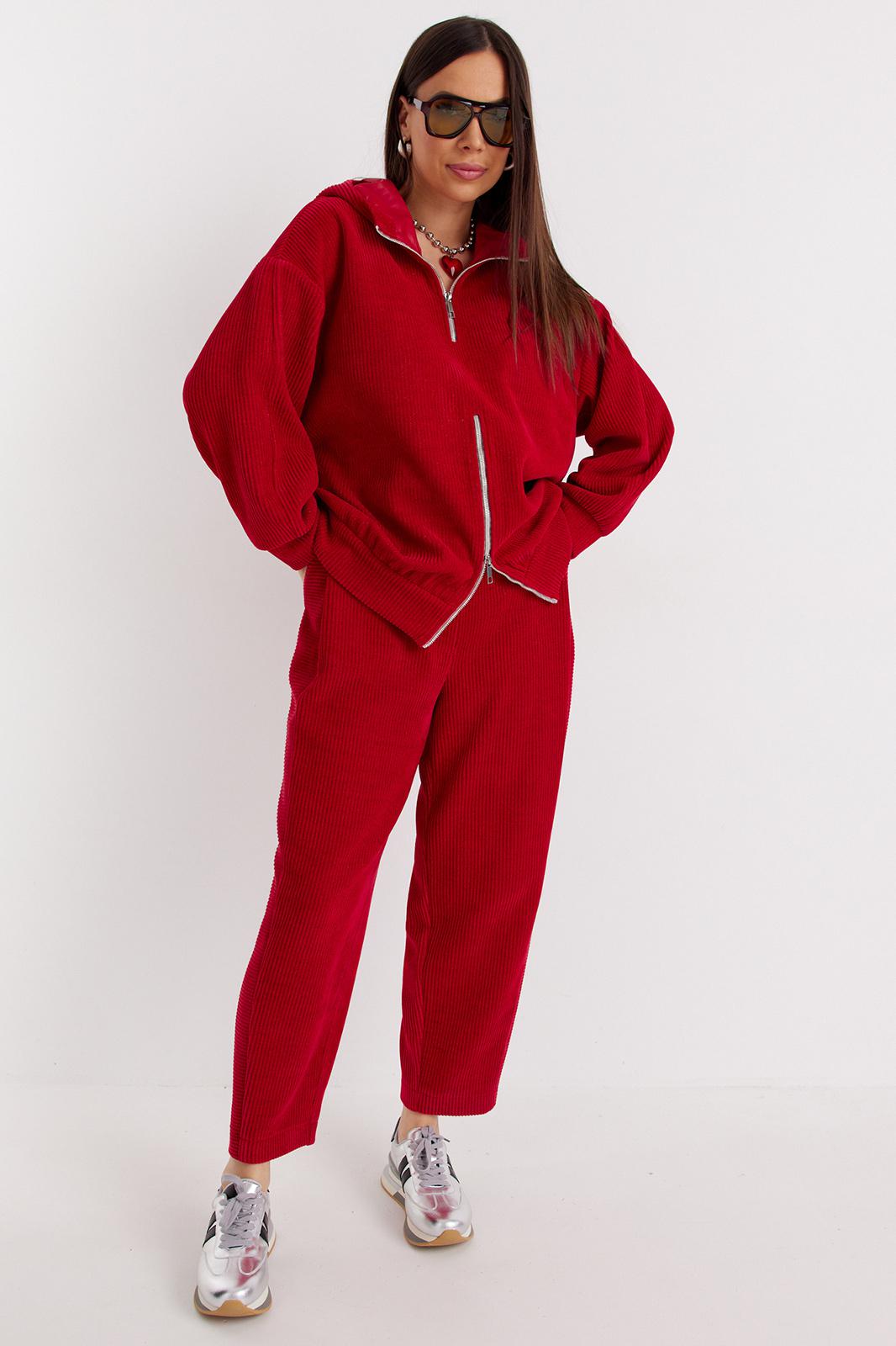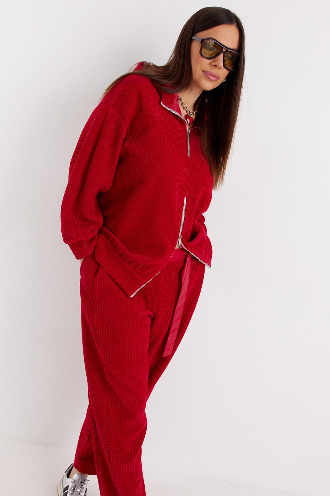 Стильный комплект из джемпера и брюк , выполненных из фактурного трикотажного плотна (штрукс) Джемпер свободного объемного кроя со спущенной линией плеча. Горловина укладывается в стойку и дополнена капюшоном. Оригинальные застежки на металлические молнии придают джемперу особый стиль. Брюки свободного кроя, слегка заужены книзу. Притачной пояс дополнен эластичной тесьмой. Брюки дополнены стильным поясом на полукольцах, и удобными боковыми карманами. По бокам оригинальные вставки из ткани. Длина спинки джемпера 68 см. Длина рукава 60 см. Длина брюк 98 см.