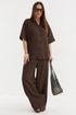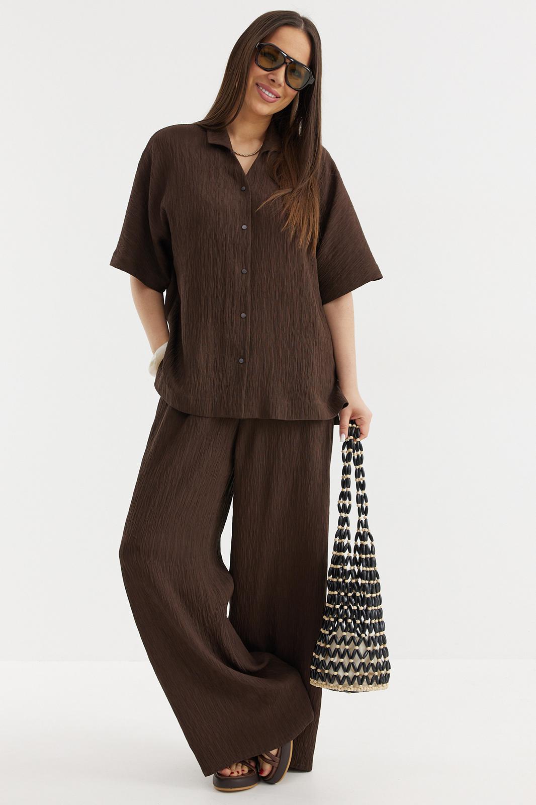 Стильный комплект из рубашки и брюк, выполненных из натуральной фактурной ткани. Рубашка свободного прямого кроя с центральной застежкой на металлические кнопки. Горловина обработана отложным воротником. Рукав цельнокроеный. Брюки прямого свободного кроя с притачным поясом, дополненным эластичной тесьмой. Посадка средняя. Дополнены удобными боковыми карманами. Длина рубашки от плечевого шва 70 см. Длина брюк по боковому шву 107 см.