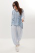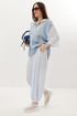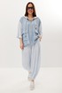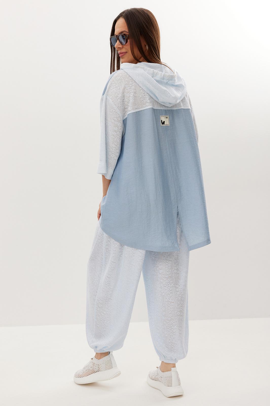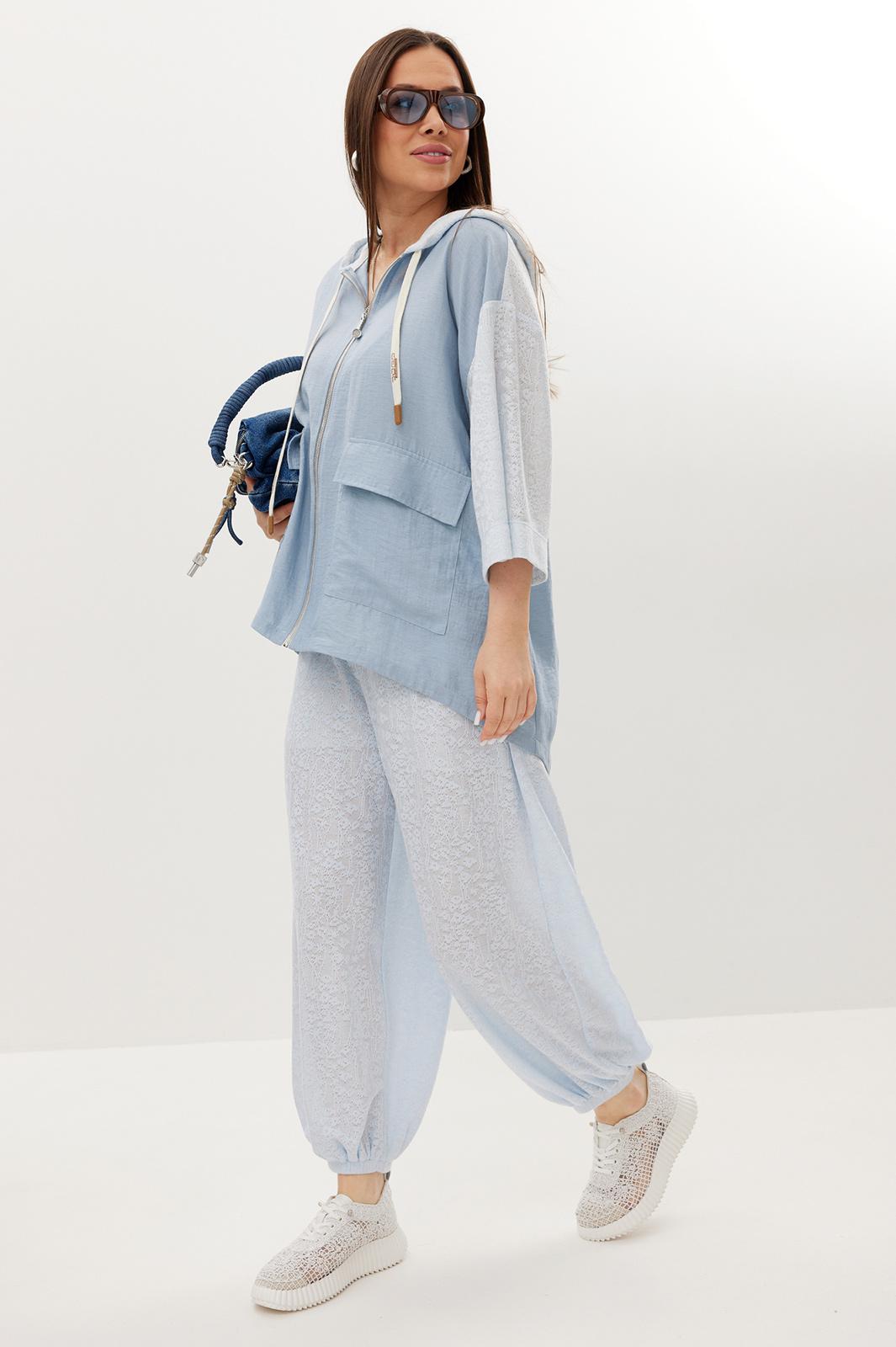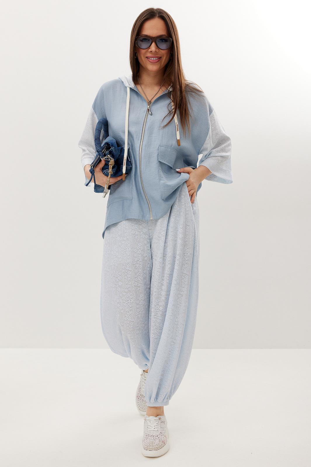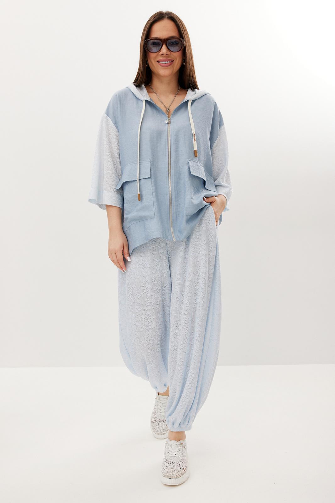 Стильный летний комплект из блузы и брюк, выполненный из ажурного трикотажного полотна в сочетании с легкой однотонной тканью. Блуза свободного кроя с центральной застежкой на молнию. Горловина обработана капюшоном. Блуза с удлиненной спинкой. Легкие и дышащие брюки-аладины свободного объемного кроя выполнены из ажурного трикотажного полотна. Дополнены притачным поясом с эластичной тесьмой. Удобные боковые карманы придают еще большего комфорта. Брюки имеют подкладку-шортики телесного цвета. Длина блузы по переду 70 см, по спинке 86 см. Длина рукава 35 см. Длина брюк по боковому шву 96 см.