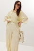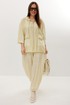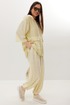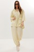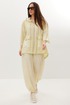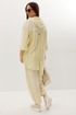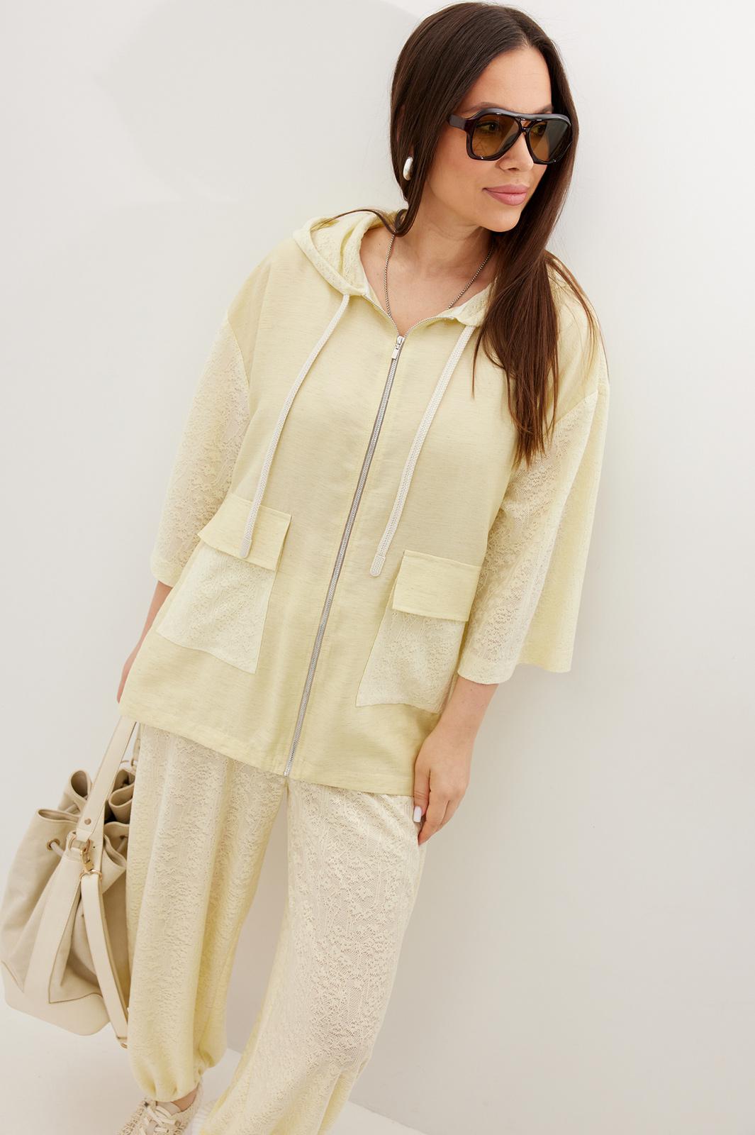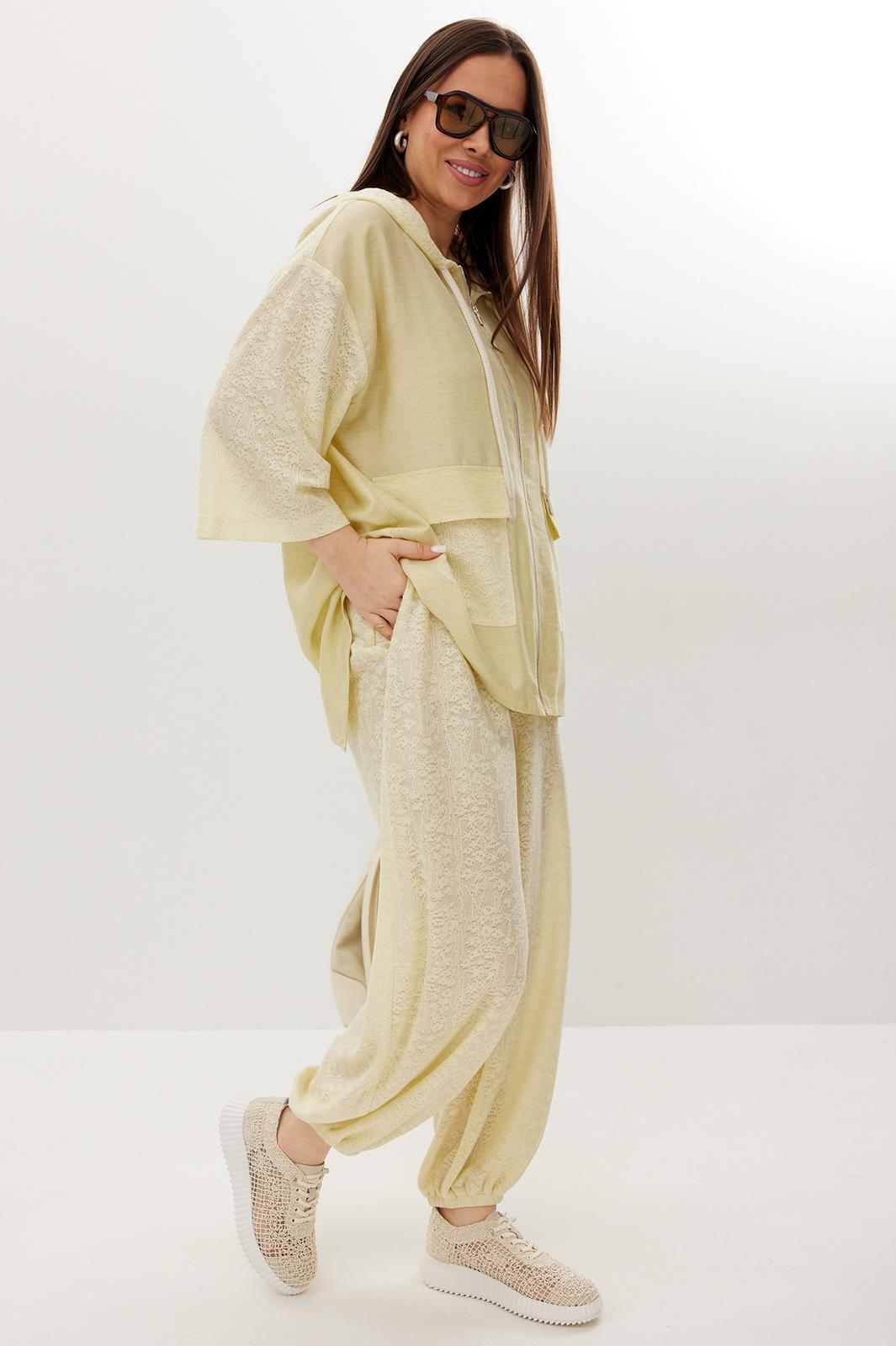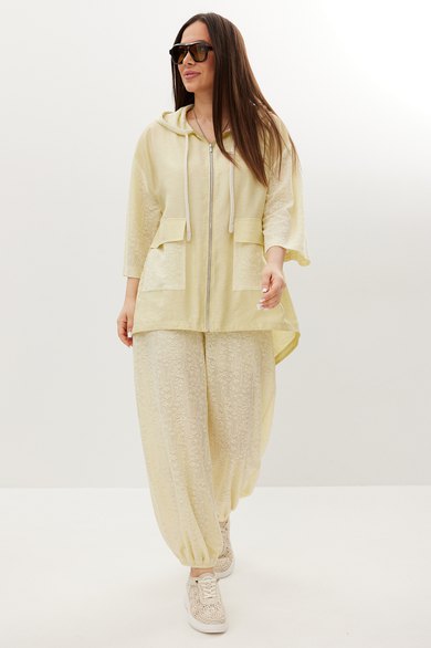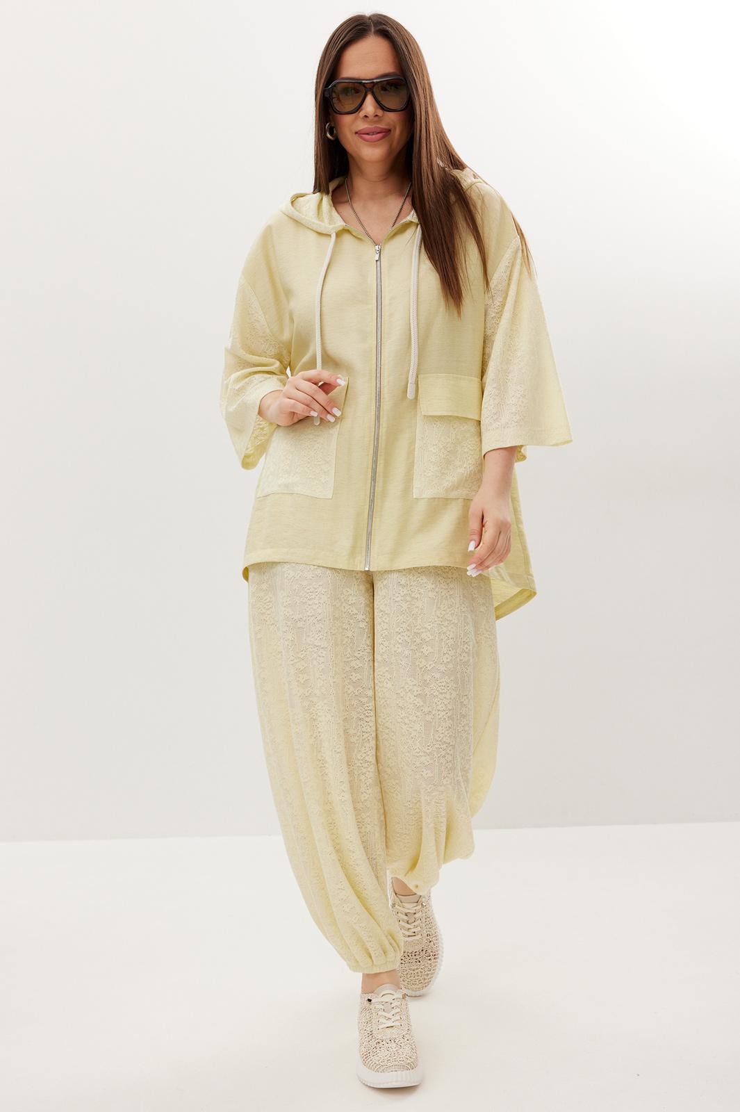 Стильный летний комплект из блузы и брюк, выполненный из ажурного трикотажного полотна в сочетании с легкой однотонной тканью. Блуза свободного кроя с центральной застежкой на молнию. Горловина обработана капюшоном. Блуза с удлиненной спинкой. Легкие и дышащие брюки-аладины свободного объемного кроя выполнены из ажурного трикотажного полотна. Дополнены притачным поясом с эластичной тесьмой. Удобные боковые карманы придают еще большего комфорта. Брюки имеют подкладку-шортики телесного цвета. Длина блузы по переду 70 см, по спинке 86 см. Длина рукава 35 см. Длина брюк по боковому шву 96 см.