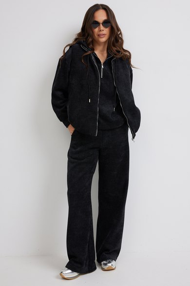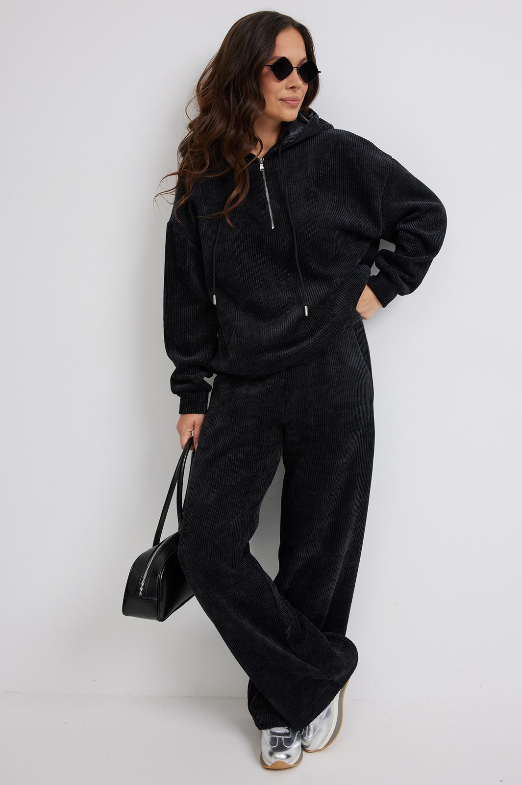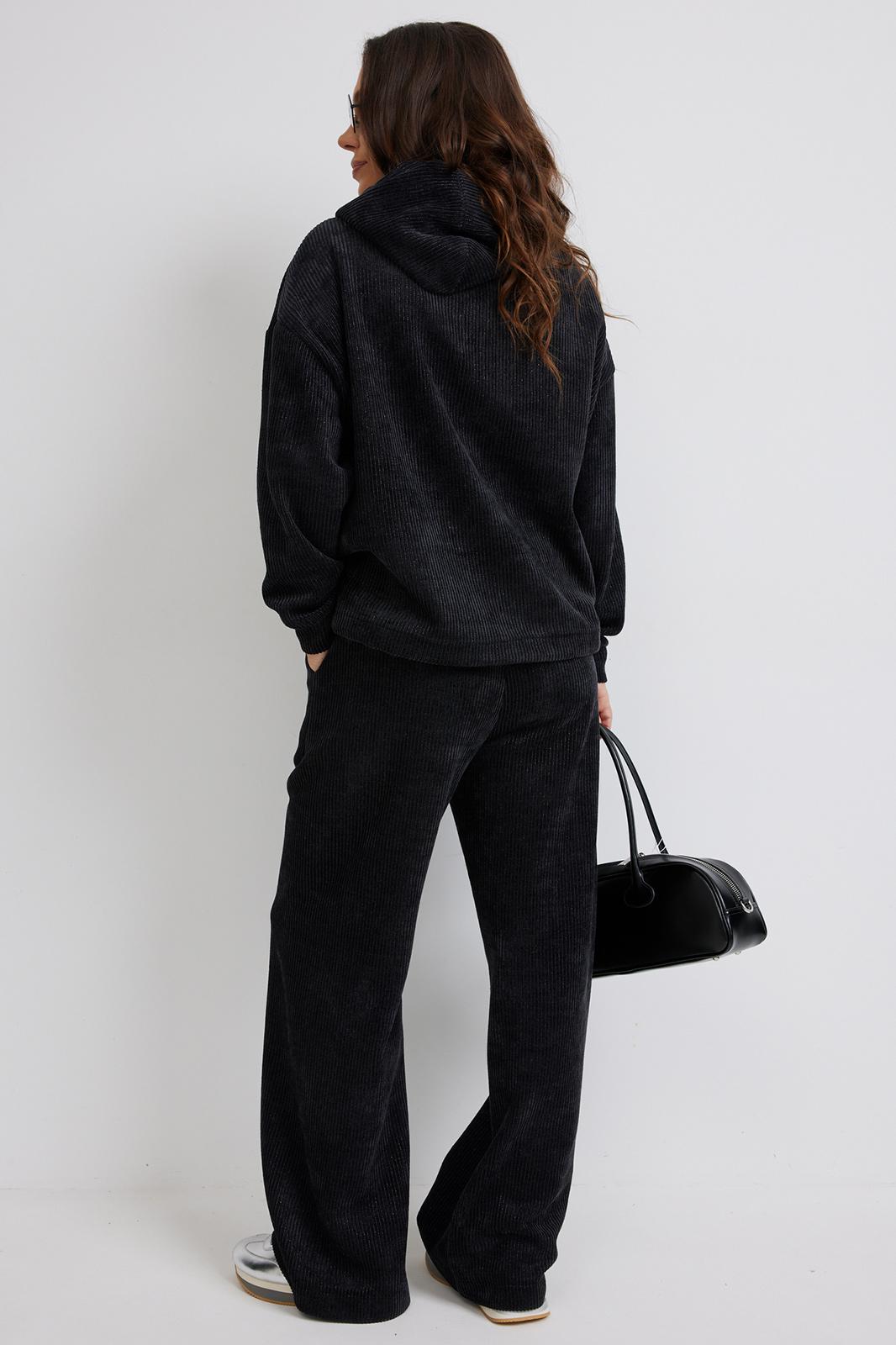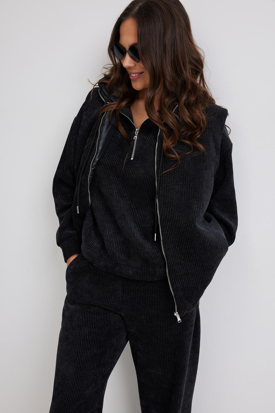 Стильный и уютный комплект из утепленного жилета, худи и брюк, выполненных из фактурного трикотажного полотна (штрукс). Жилет свободного прямого кроя с центральной застежкой на металлическую молнию. Горловина обработана стойкой. Перед жилета выполнен из трикотажного полотна, спинка выполнена из плащевой ткани. Жилет дополнен удобными боковыми карманами. Худи свободного прямого кроя со слегка спущенным рукавом. Дополнено уютным капюшоном и застежкой на металлическую молнию. Для придания формы по низу расположена кулиска на резинке с фиксаторами. Так же худи дополнено удобными карманами. Брюки прямого свободного кроя, с притачным поясом, дополненным эластичной тесьмой. Посадка средняя. По бокам брюки дополнены удобными карманами.