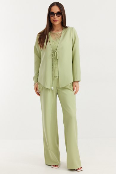 Элегантный костюм из кардигана, блузы и брюк. Выполнен из мягкой летней костюмной ткани в сочетании с нежным кружевом Кардиган свободного прямого кроя с центральной застежкой на завязку бантик. Рукав слегка спущен. Изнанка выполнена из нежного кружева в цвет основной ткани. По спинке небольшой разрез. Блуза свободного прямого кроя с коротким рукавом. Выполнена из основной ткани с наложенным на нее кружевом. Брюки свободного классического кроя с притачным поясом, дополненным эластичной тесьмой. Застежка гульфик на молнию и пуговицу. Брюки дополнены удобными боковыми карманами. Посадка средняя, ткань не просвечивает. Длина кардигана от плечевого шва по спинке 61см., по крайней точке переда 70 см. Дина рукава 60см. Длина блузы 66см. Длина брюк по боковому шву 105 см.