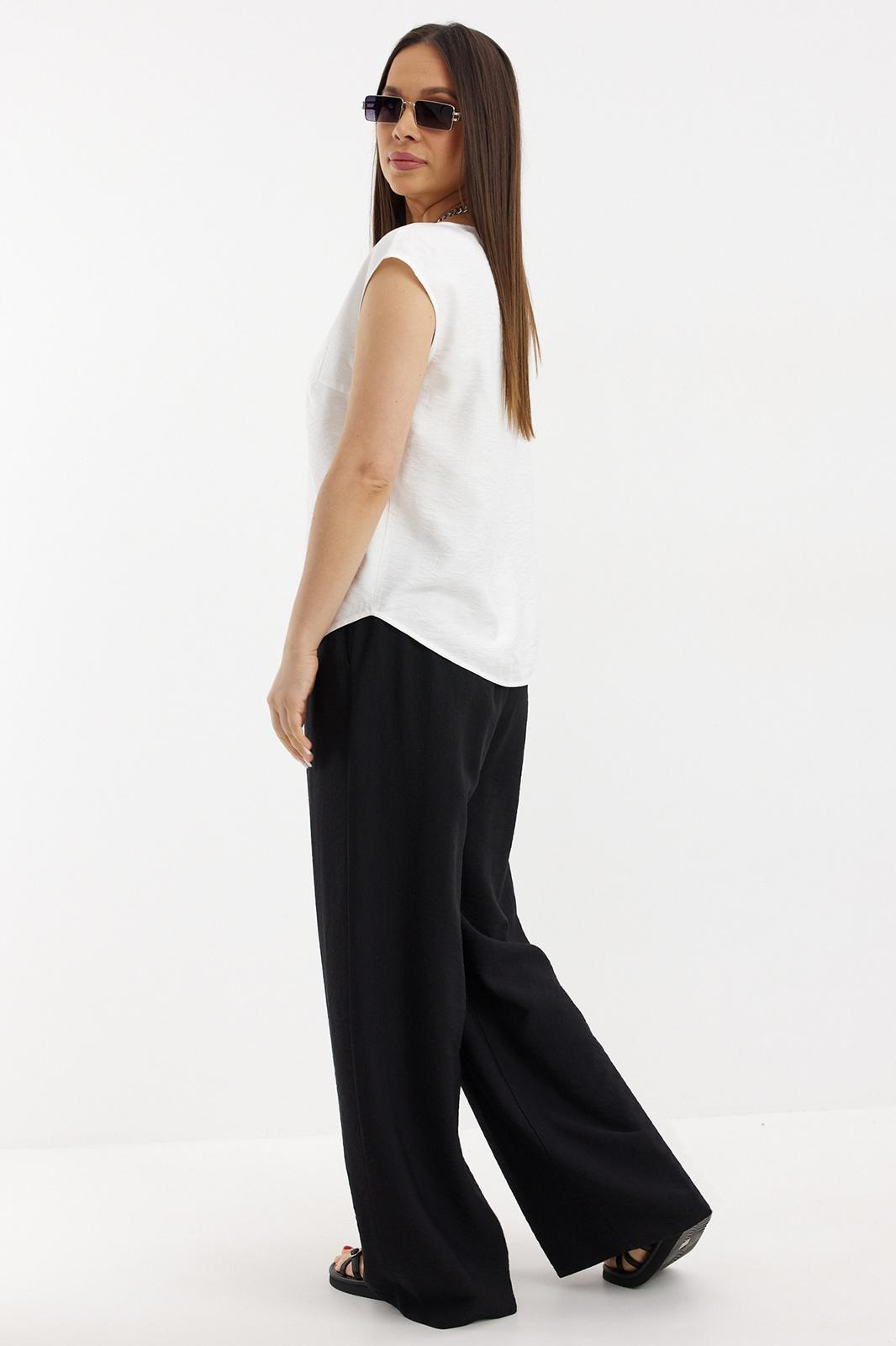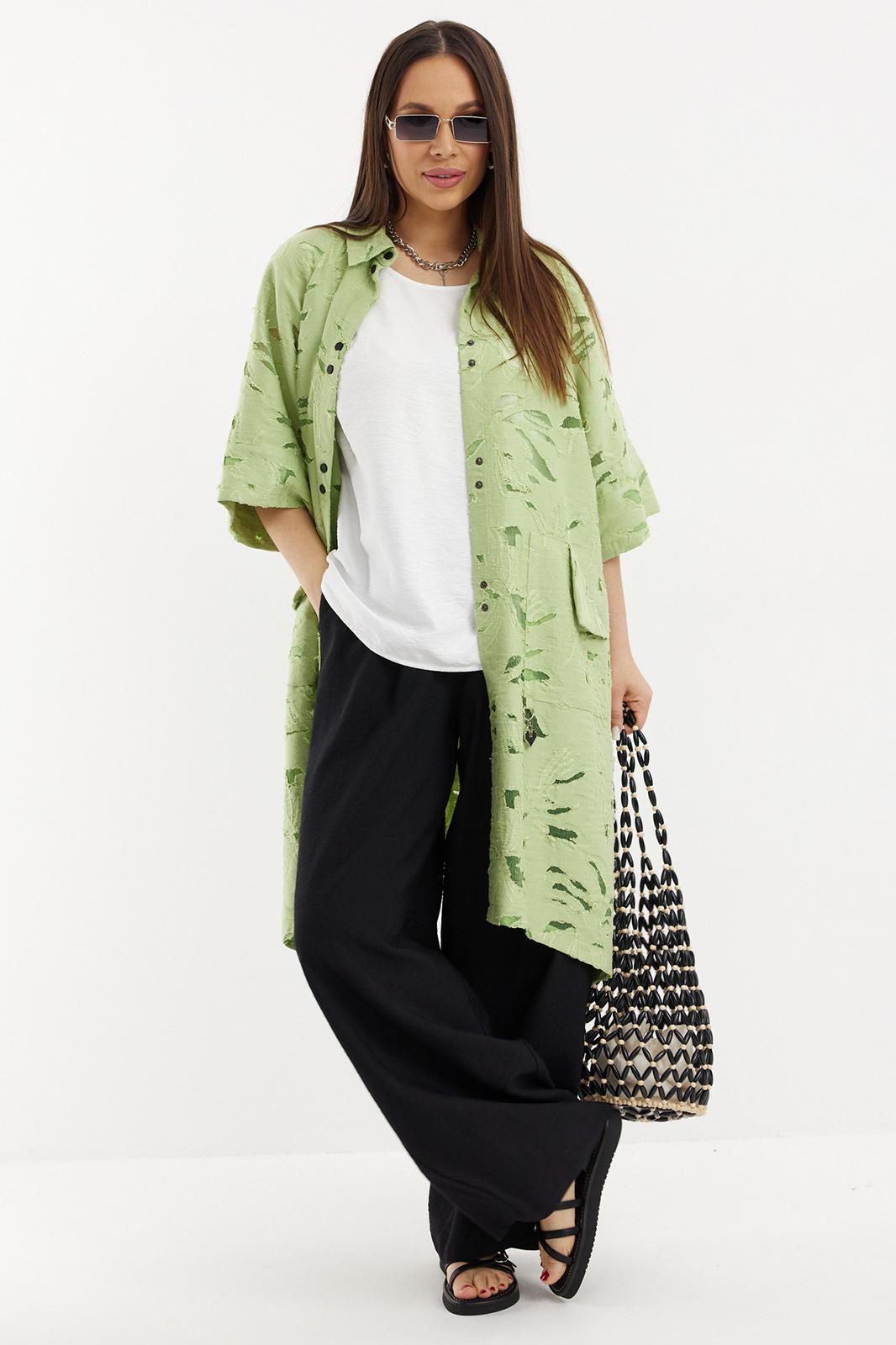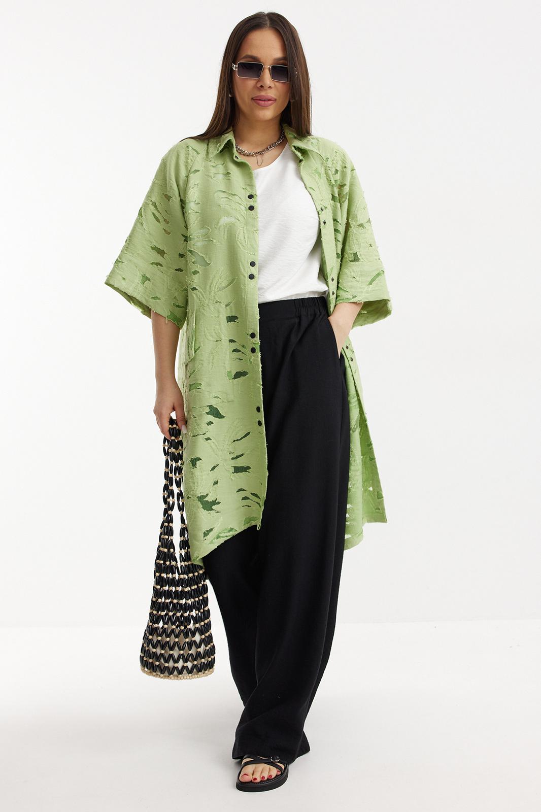 Стильный и элегантный образ из кардигана, топа и брюк. Кардиган свободного рубашечного кроя с центральной застежкой на металлические кнопки. По спинке дополнен кулиской с декоративной тесьмой. Кардиган дополнен удобными карманами. Топ свободного прямого кроя с округлой горловиной и коротким рукавом. Брюки свободного прямого кроя с притачным поясом, дополненным эластичной тесьмой. Длина кардигана от плечевого шва по переду 98 см., по спинке 111 см. Длина рукава 35 см. Длина топа 66 см. Длина брюк по боковому шву 103 см.