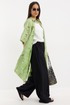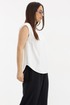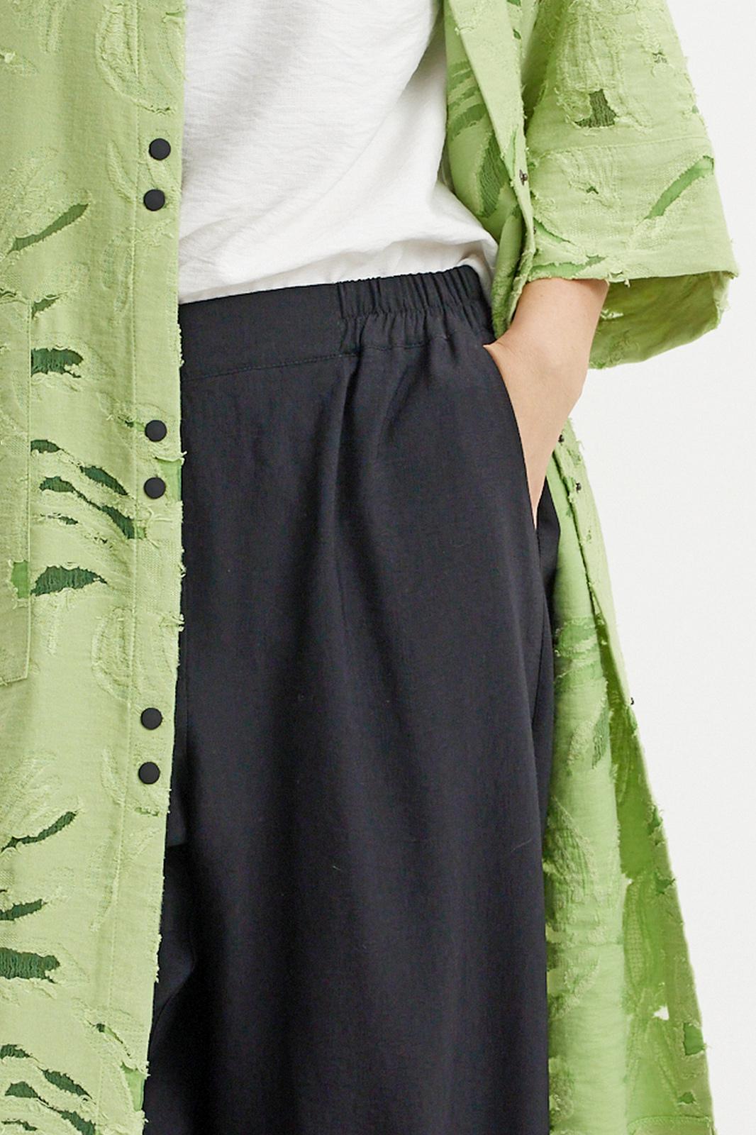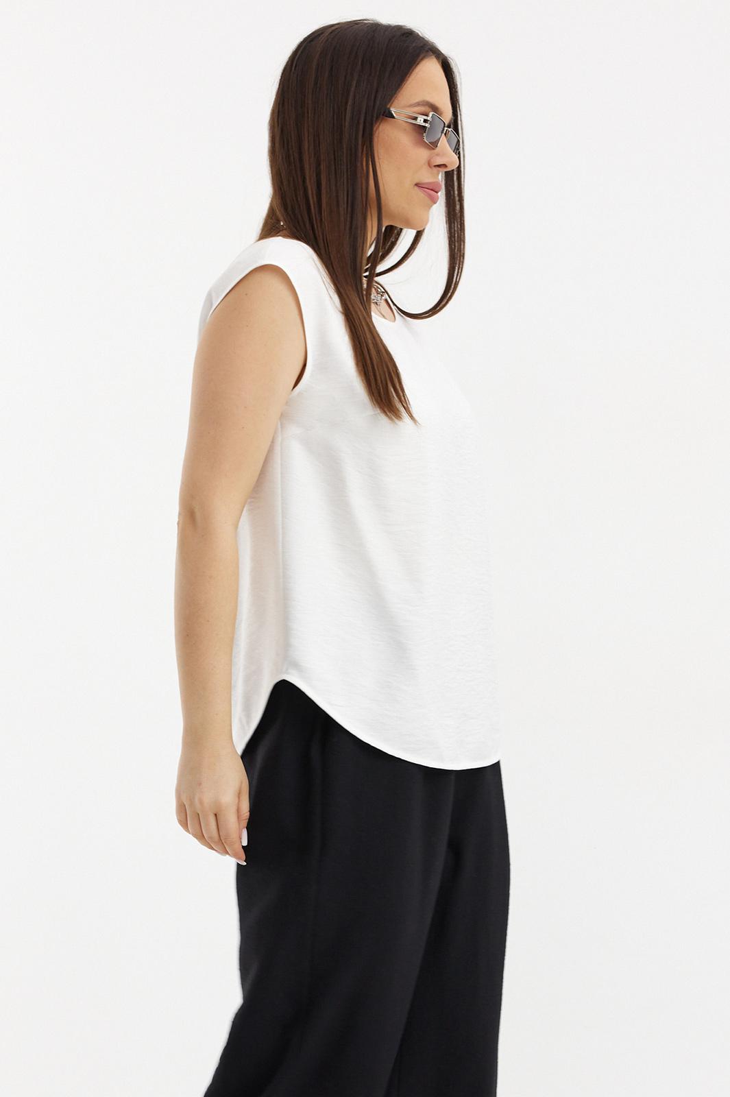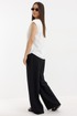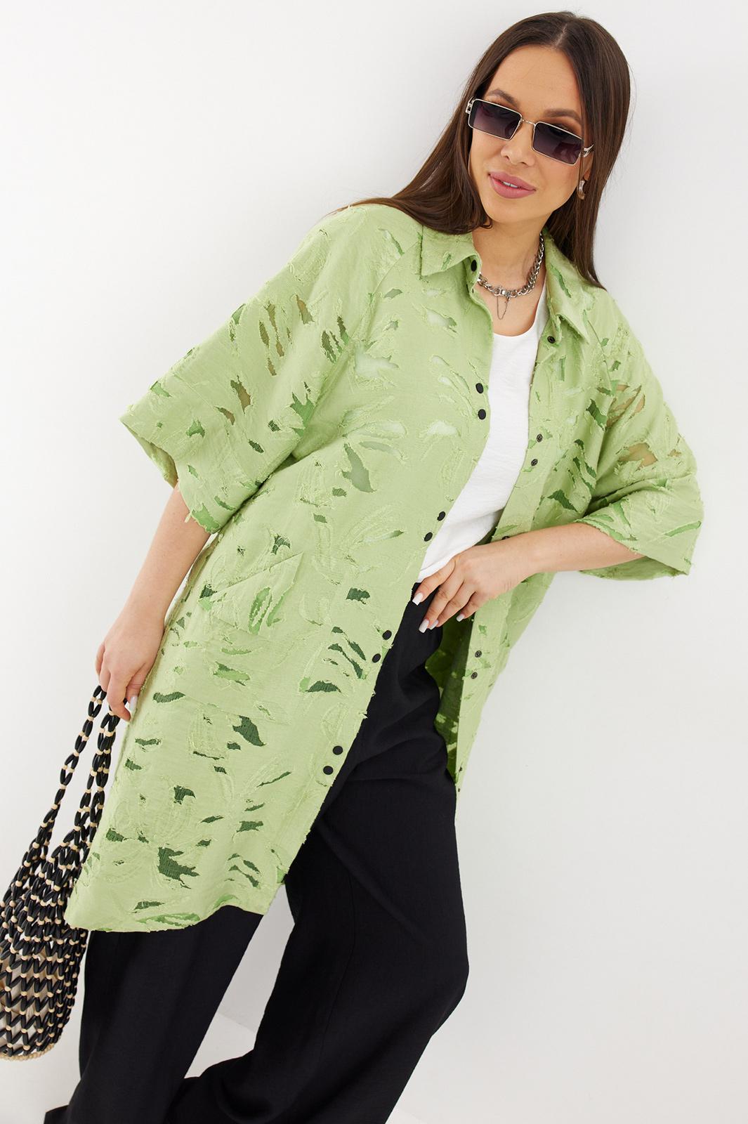 Стильный и элегантный образ из кардигана, топа и брюк. Кардиган свободного рубашечного кроя с центральной застежкой на металлические кнопки. По спинке дополнен кулиской с декоративной тесьмой. Кардиган дополнен удобными карманами. Топ свободного прямого кроя с округлой горловиной и коротким рукавом. Брюки свободного прямого кроя с притачным поясом, дополненным эластичной тесьмой. Длина кардигана от плечевого шва по переду 98 см., по спинке 111 см. Длина рукава 35 см. Длина топа 66 см. Длина брюк по боковому шву 103 см.