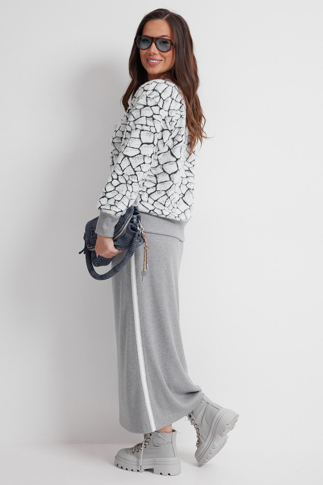 Стильный трикотажный комплект из джемпера и юбки. Джемпер свободного кроя. Выполнен из нежного, слегка пушистого , трикотажа. Горловина V- образная, обработана довязом. Рукав втачной, дополнен притачной манжетой. Низ джемпера слегка присборен и обработан притачным довязом. Юбка макси с одним боковым разрезом. Выполнена из приятного к телу трикотажа в рубчик. Дополнена отделкой из тесьмы по боковым швам. Юбка с притачным поясом, дополненным эластичной тесьмой. Длина джемпера от плечевого шва 65см. Длина рукава 62см. Длина юбки по боковому шву 90см.
