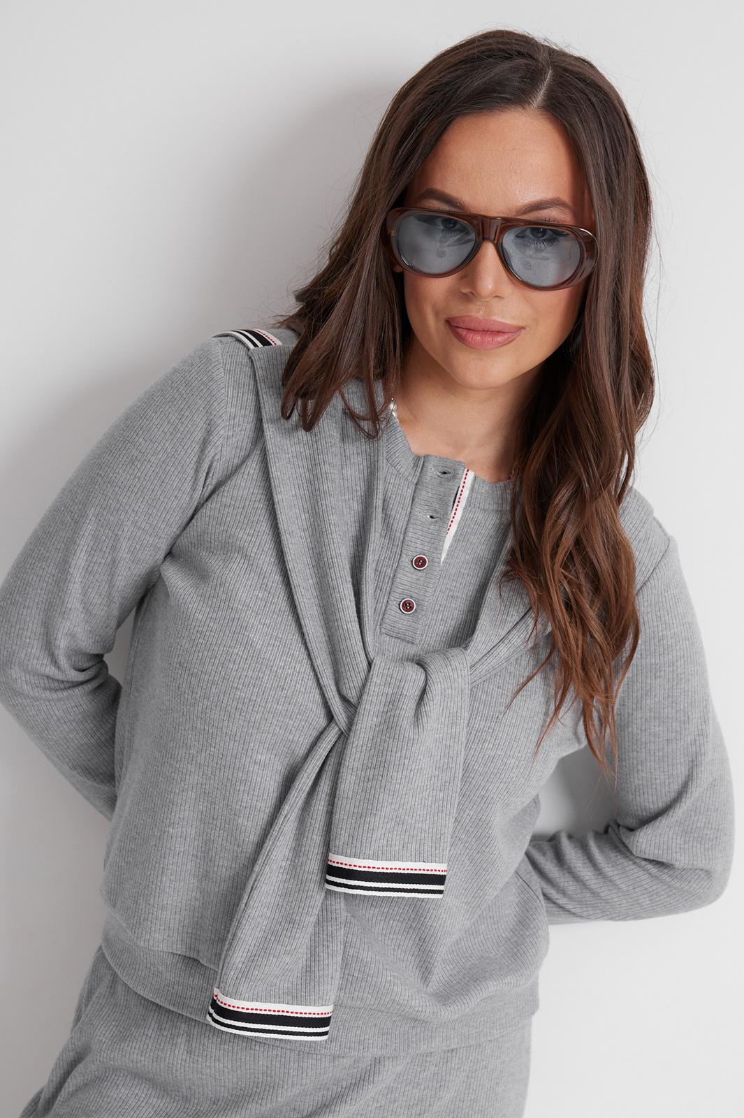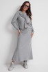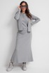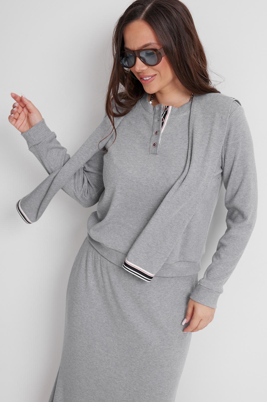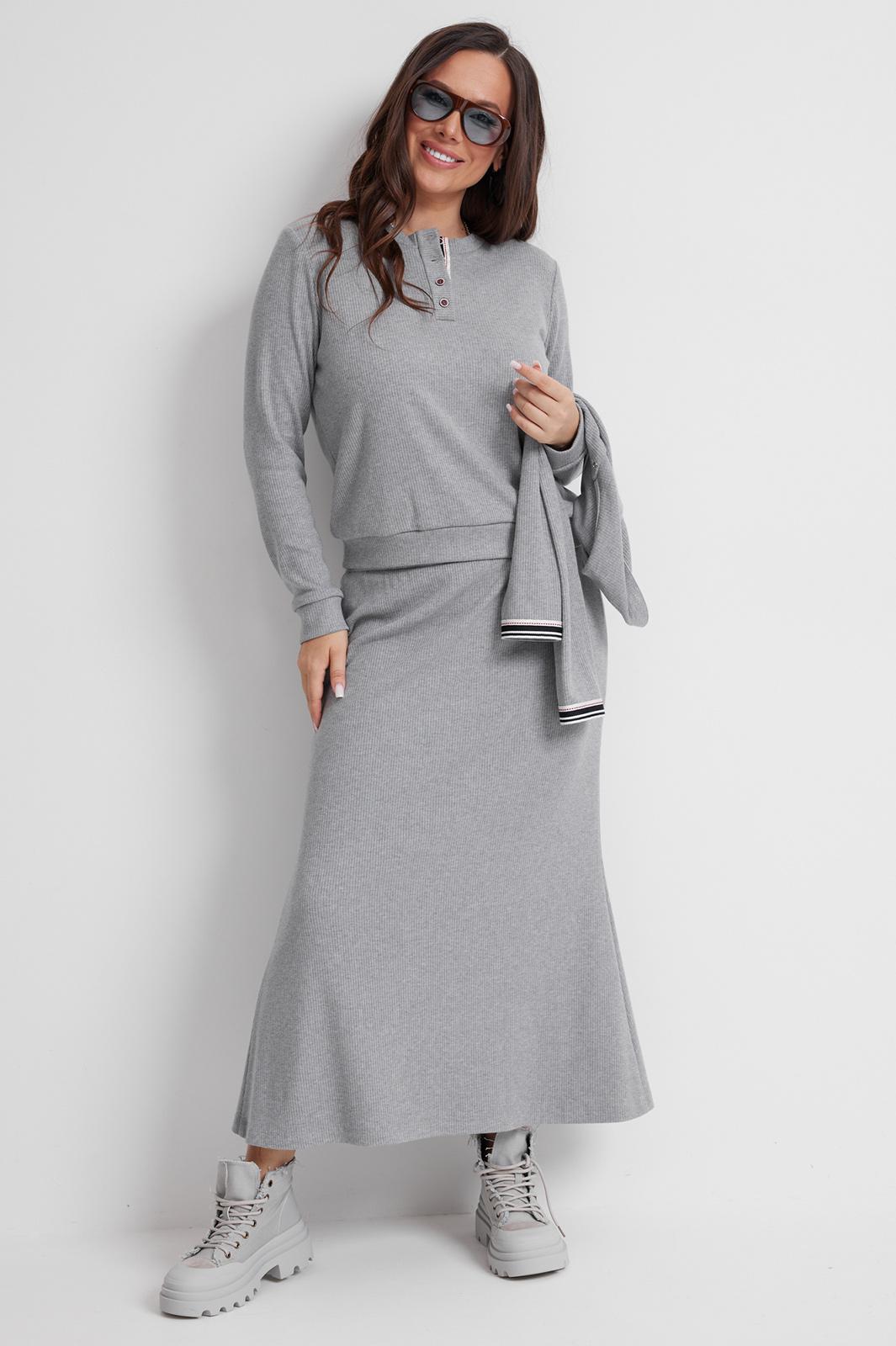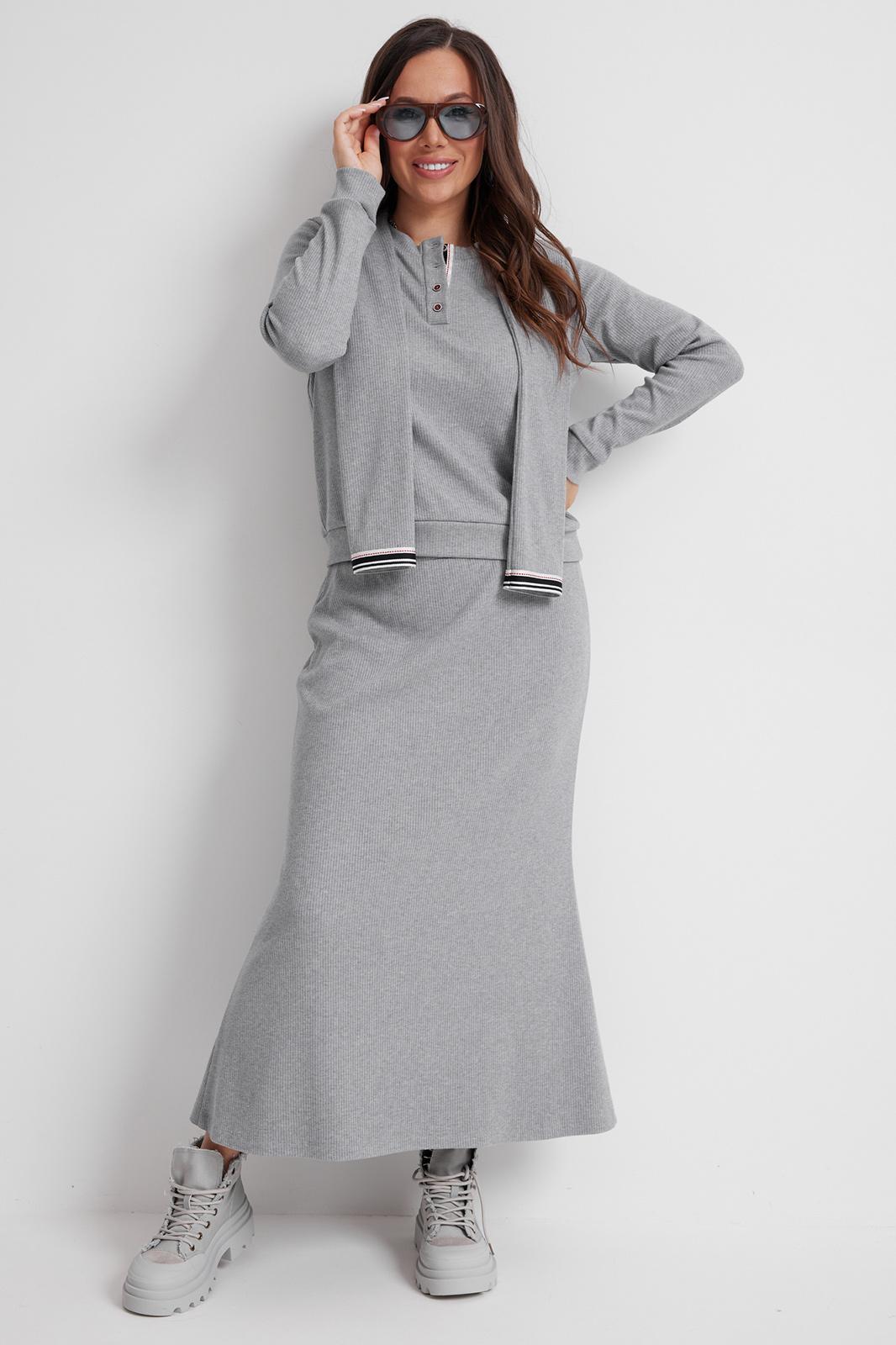 Стильный трикотажный комплект из джемпера и юбки. Выполнен из приятного к телу трикотажного полотна средней плотности в рубчик. Джемпер свободного прямого кроя с длинным втачным рукавом, дополненным притачной манжетой. Горловина округлой формы с планкой на застежке(пуговицы). Низ слегка присборен притачным поясом. Изюминкой является съемный (на потайных кнопках) воротник с имитацией рукавов. Юбка макси с притачным поясом, дополненным эластичной тесьмой. Крой юбки прямой с легким клешением к низу. Длина джемпера от плечевого шва 63см. Длина рукава 60см. Длина юбки 90 см.
