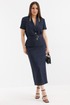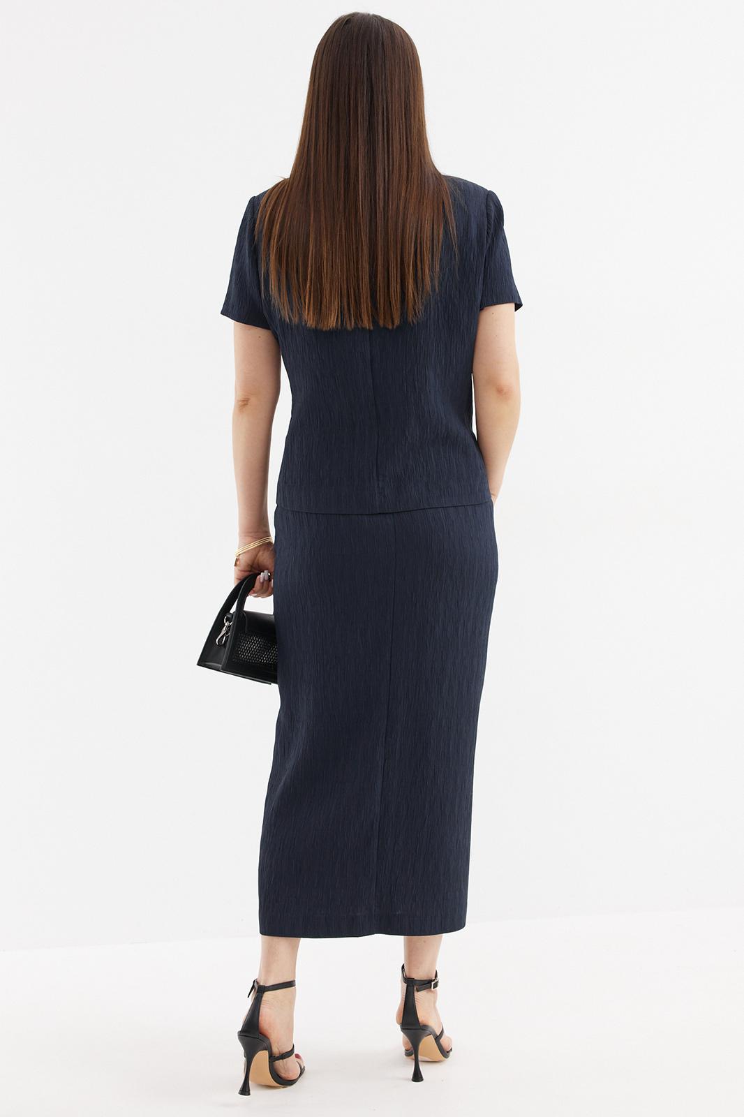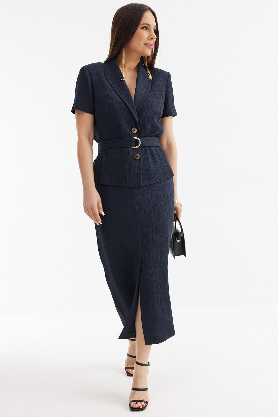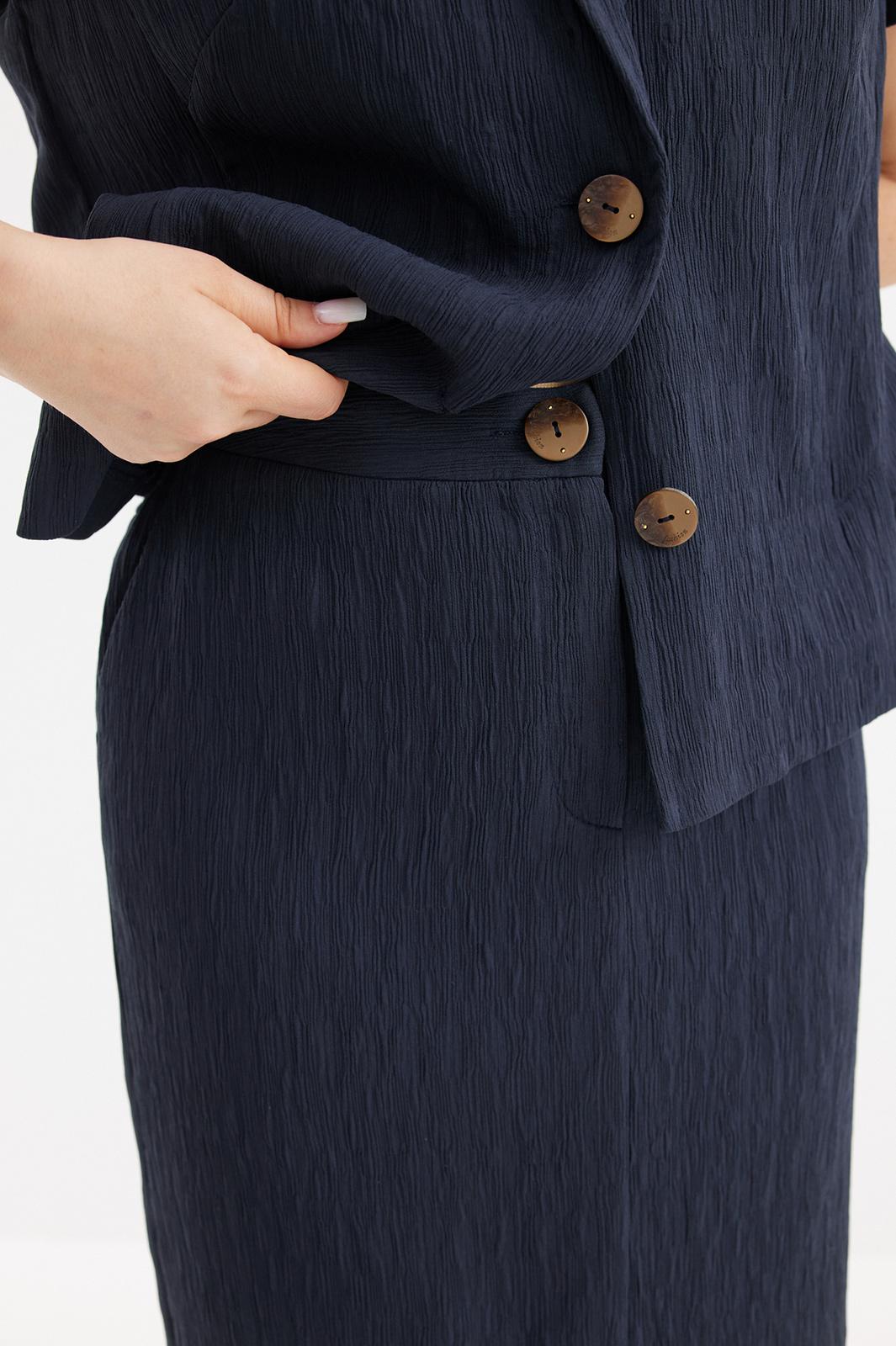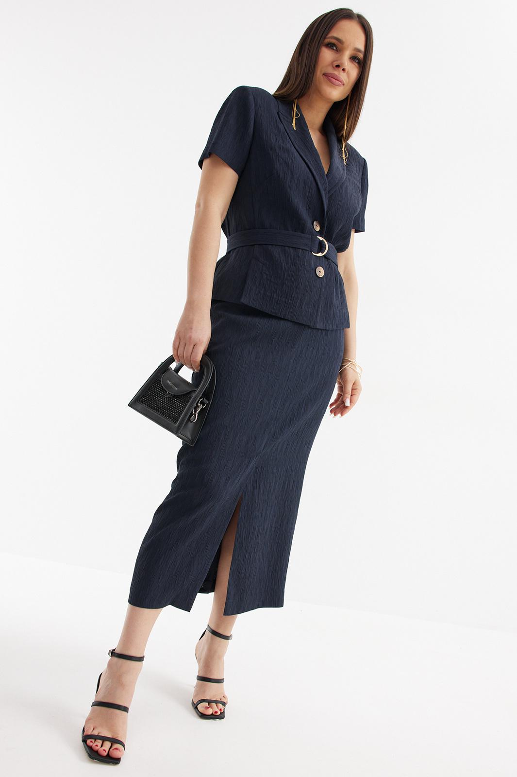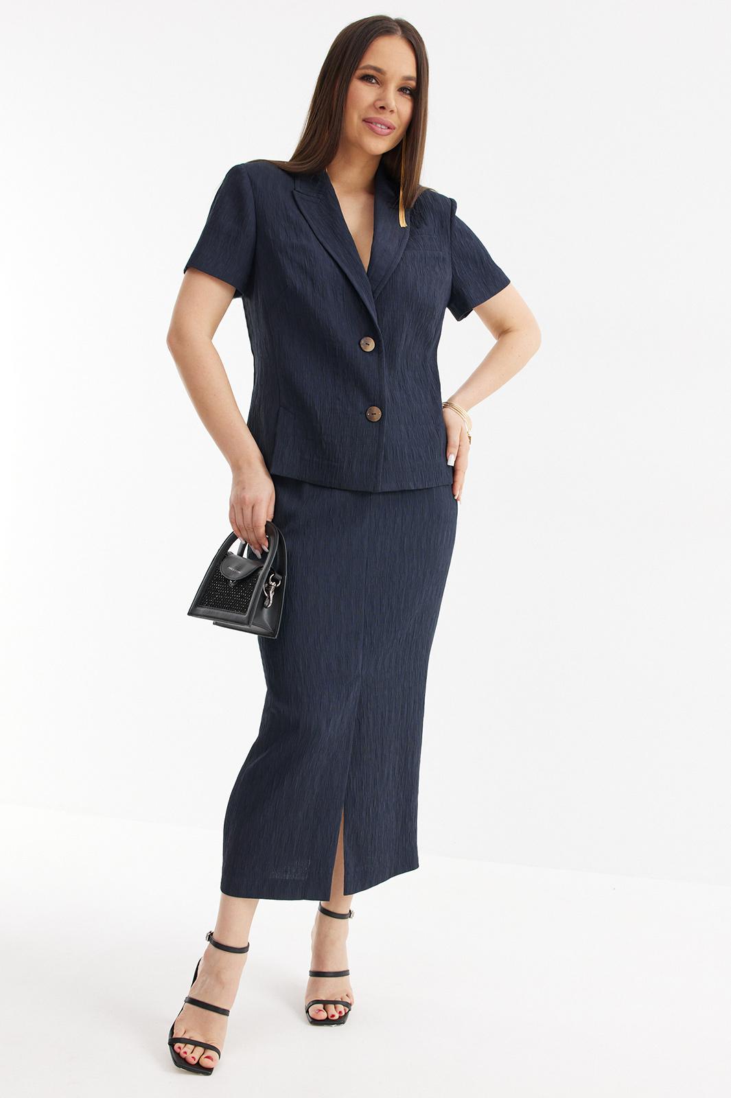 Стильный и элегантный комплект из жакета и юбки выполнен из красивой фактурной ткани. Жакет полуприлегающего силуэта с центральной застежкой на красивые пуговицы. Дополнен съемным поясом с пряжкой. Юбка миди прямого кроя со шлицей. Дополнена притачным поясом с эластичной тесьмой. Застежка на пуговицу и молнию. По спинке кокетка. Длина жакета от плечевого шва 60см. Длина рукава 25см. Длина юбки 88см.