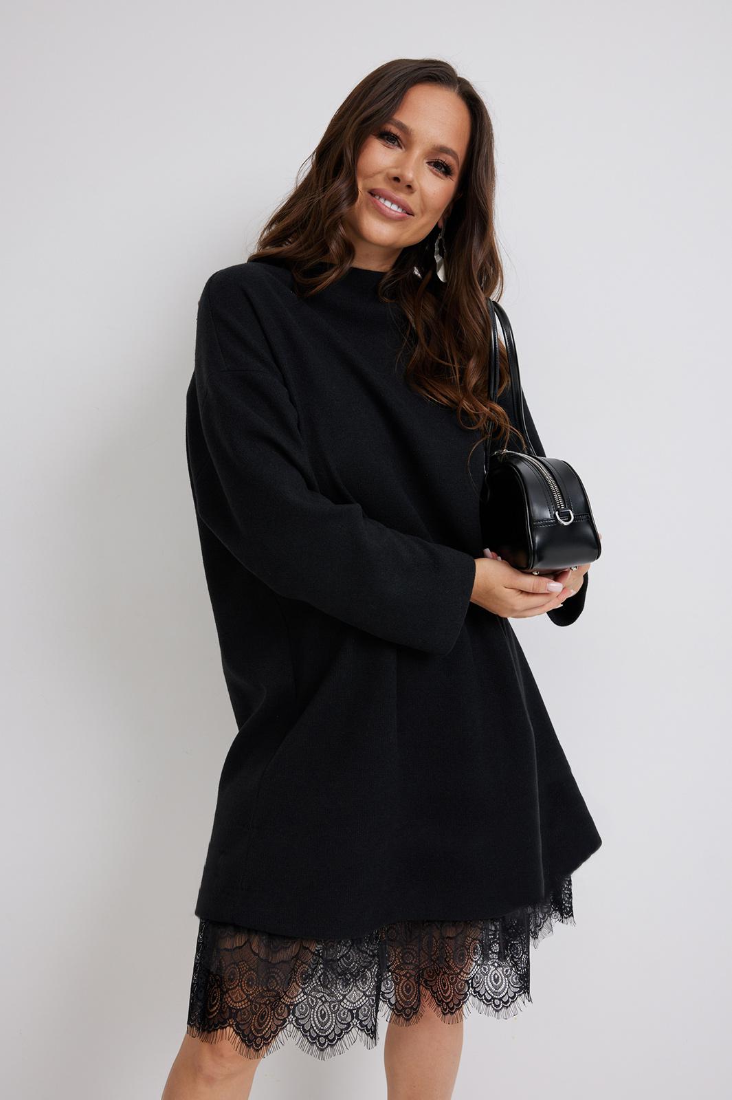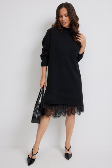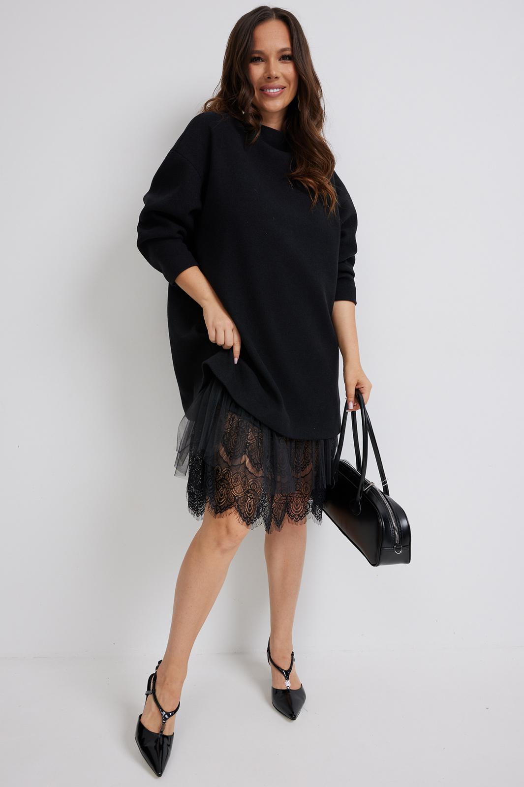 Стильный комплект из верхнего трикотажного платья и нижнего платья-комбинации. Верхнее платье свободного прямого кроя с длинным рукавом. Выполнено из приятного к телу трикотажного полотна средней плотности, который прекрасно держит форму. Нижнее платье-комбинация выполнено из нежного трикотажного полотна, дополненного красивым кружевом и фатином. Комбинация на тонких регулируемых бретелях. Длина верхнего платья от плечевого шва 81 см. Длина рукава 60 см. Длина нижнего платья 95 см.