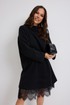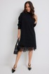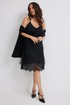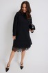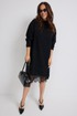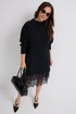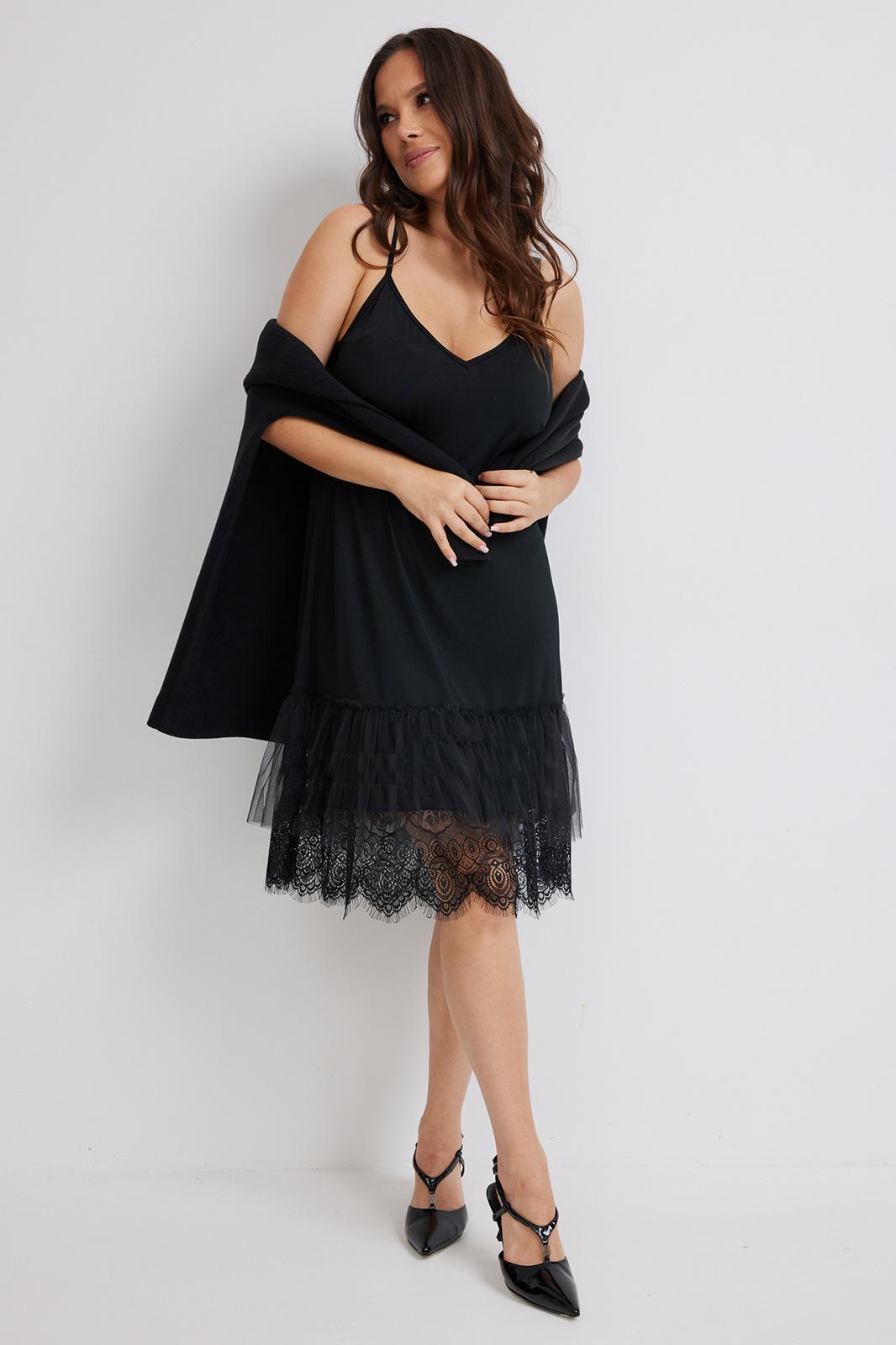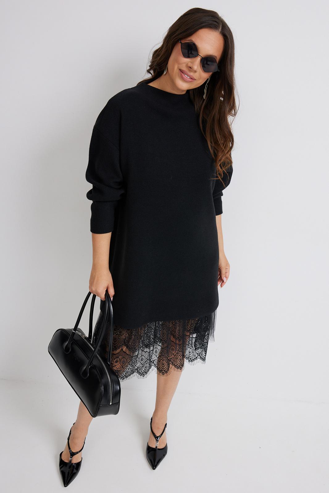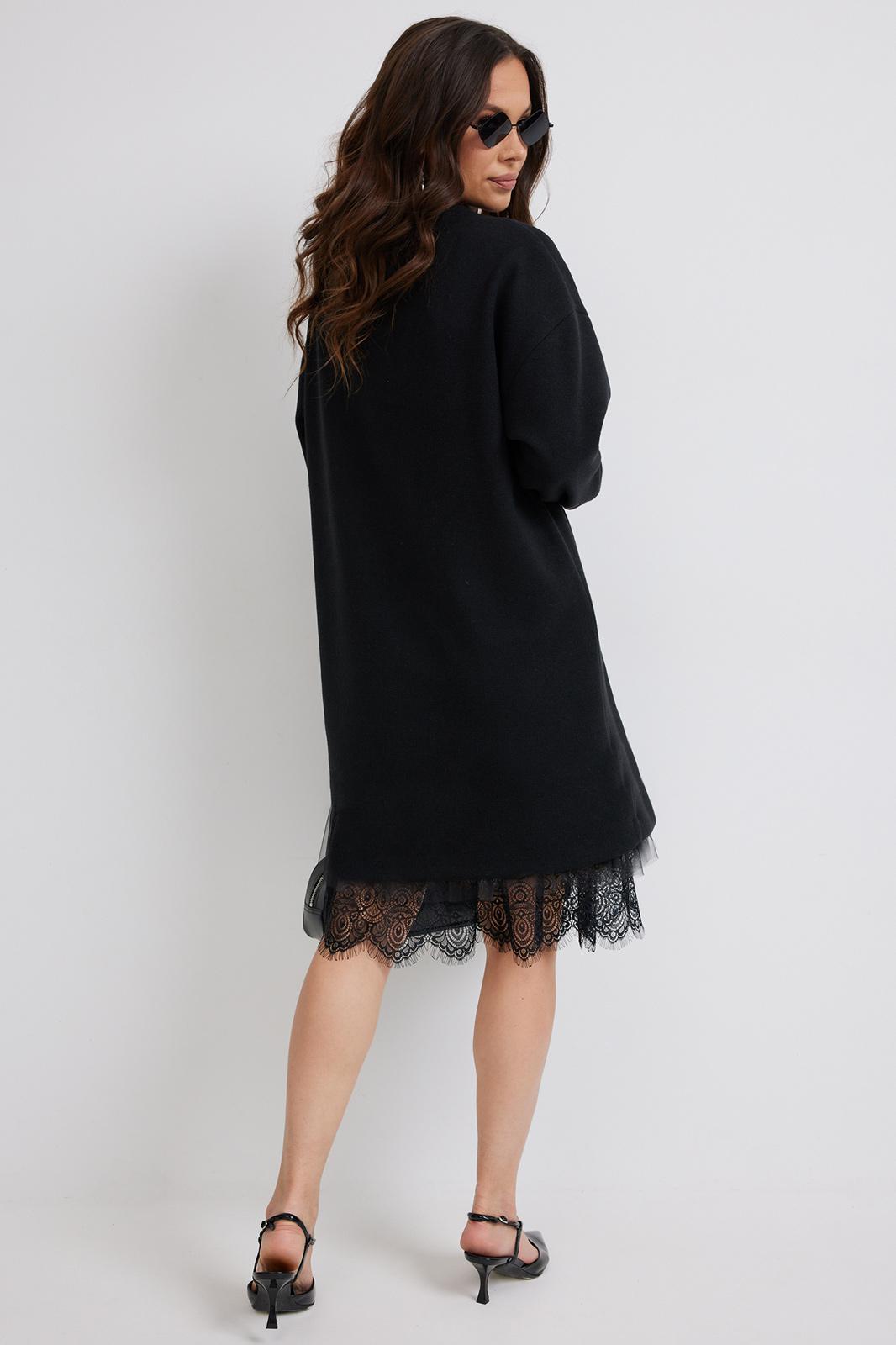 Стильный комплект из верхнего трикотажного платья и нижнего платья-комбинации. Верхнее платье свободного прямого кроя с длинным рукавом. Выполнено из приятного к телу трикотажного полотна средней плотности, который прекрасно держит форму. Нижнее платье-комбинация выполнено из нежного трикотажного полотна, дополненного красивым кружевом и фатином. Комбинация на тонких регулируемых бретелях. Длина верхнего платья от плечевого шва 81 см. Длина рукава 60 см. Длина нижнего платья 95 см.