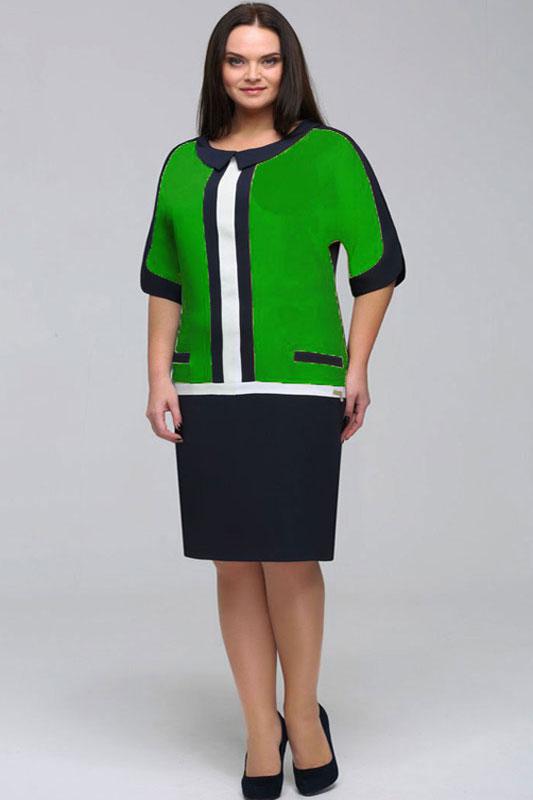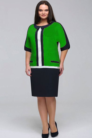 Платье прямого силуэта, отрезное ниже талии. Впереди планка, выполненная из ткани двух контрастных цветов. Выше линии подреза – две «листочки», имеющие карманы. Воротник округлой формы, доходит до плечевого шва. По рукаву фигурные подрезы, переходящие в манжеты по низу рукава. Под воротником пришивается металлическое украшение. Спинка на потайной «молнии», внизу шлица. Длина изделия в 54 размере 107 см.