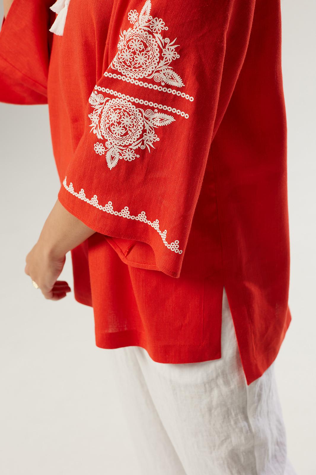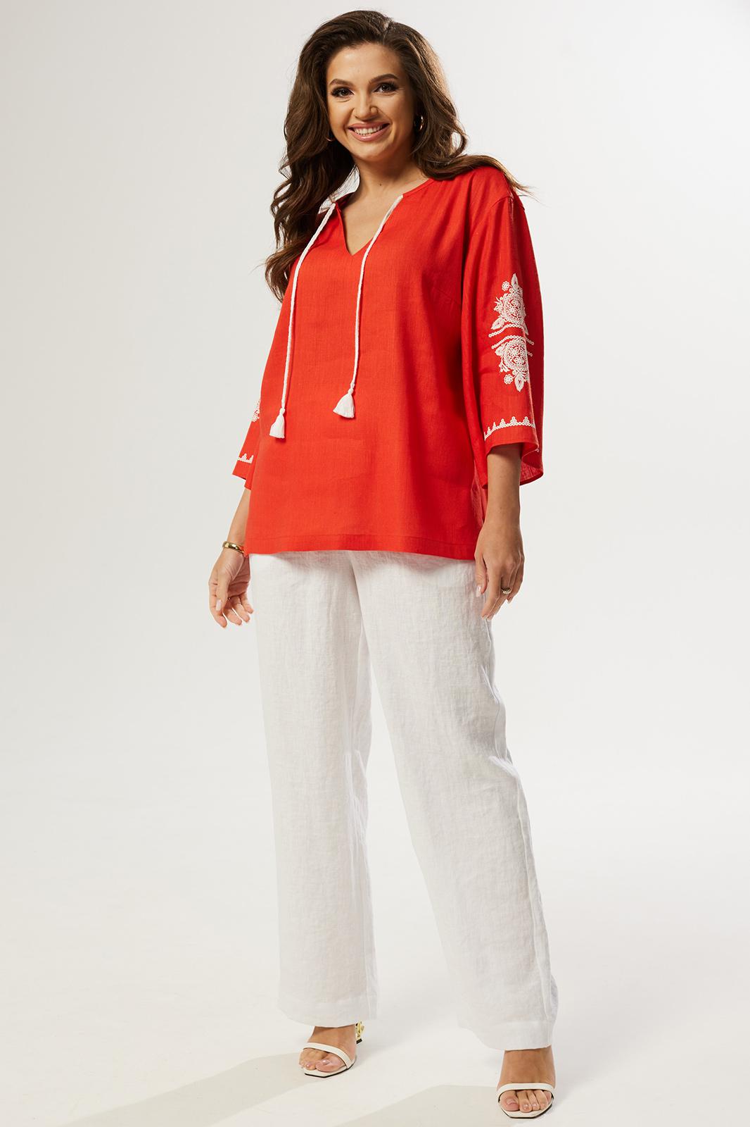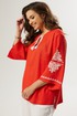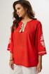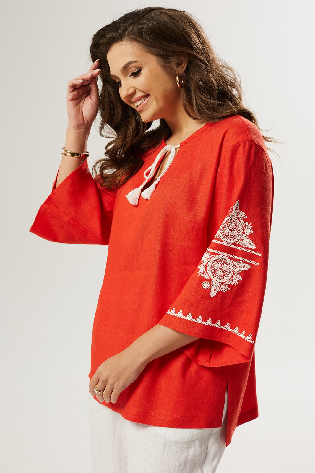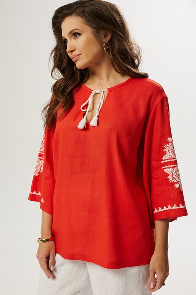 Блузка свободного силуэта со спущенным плечом. Рукав свободный, расширенный к низу. Горловина круглая с V-образным вырезом, украшенная декоративными завязками с кисточками. По бокам разрезы. На рукавах принт.
