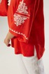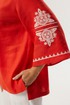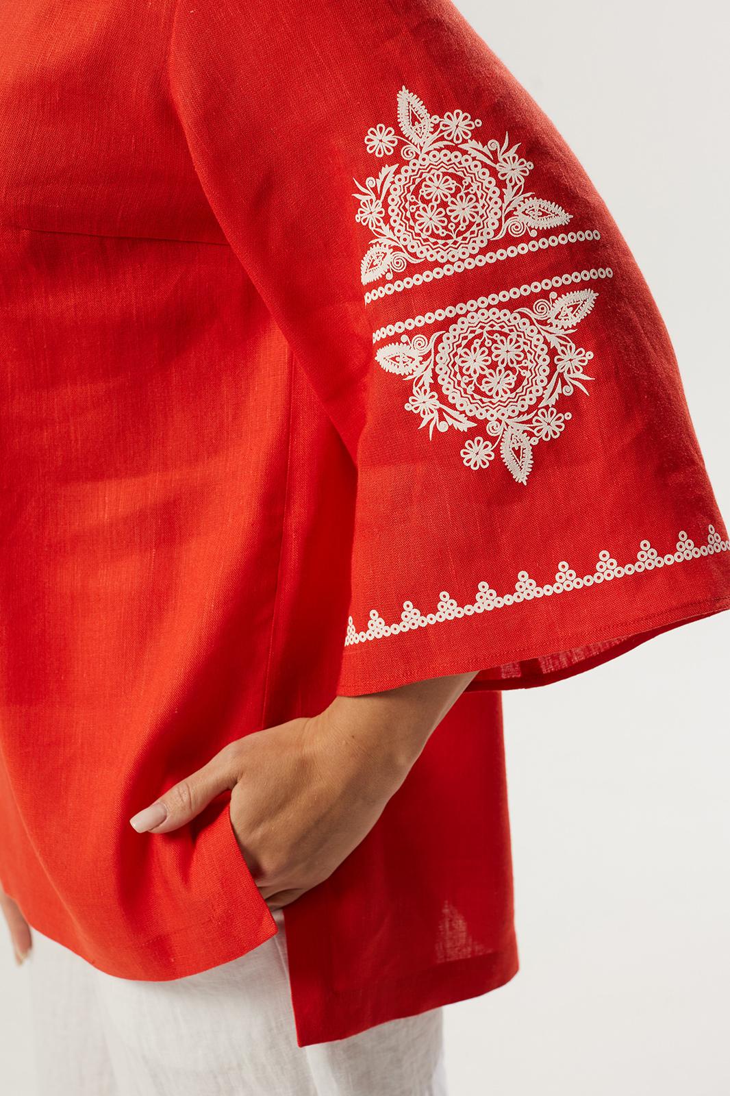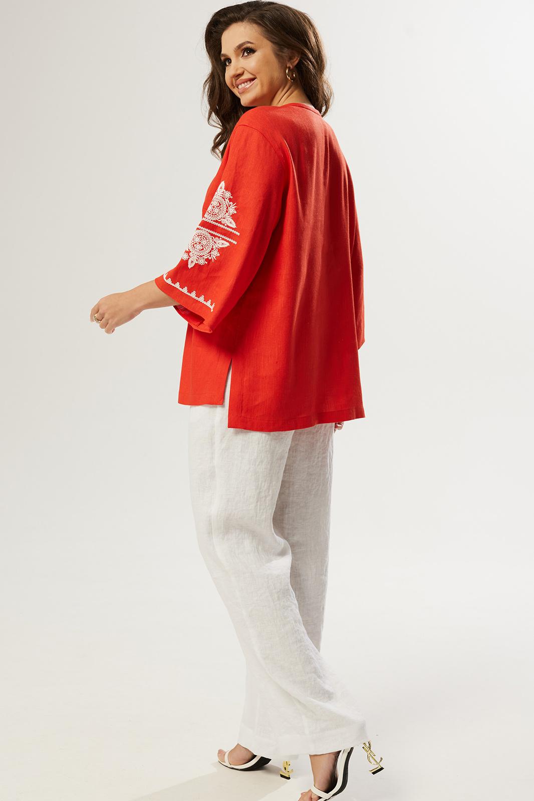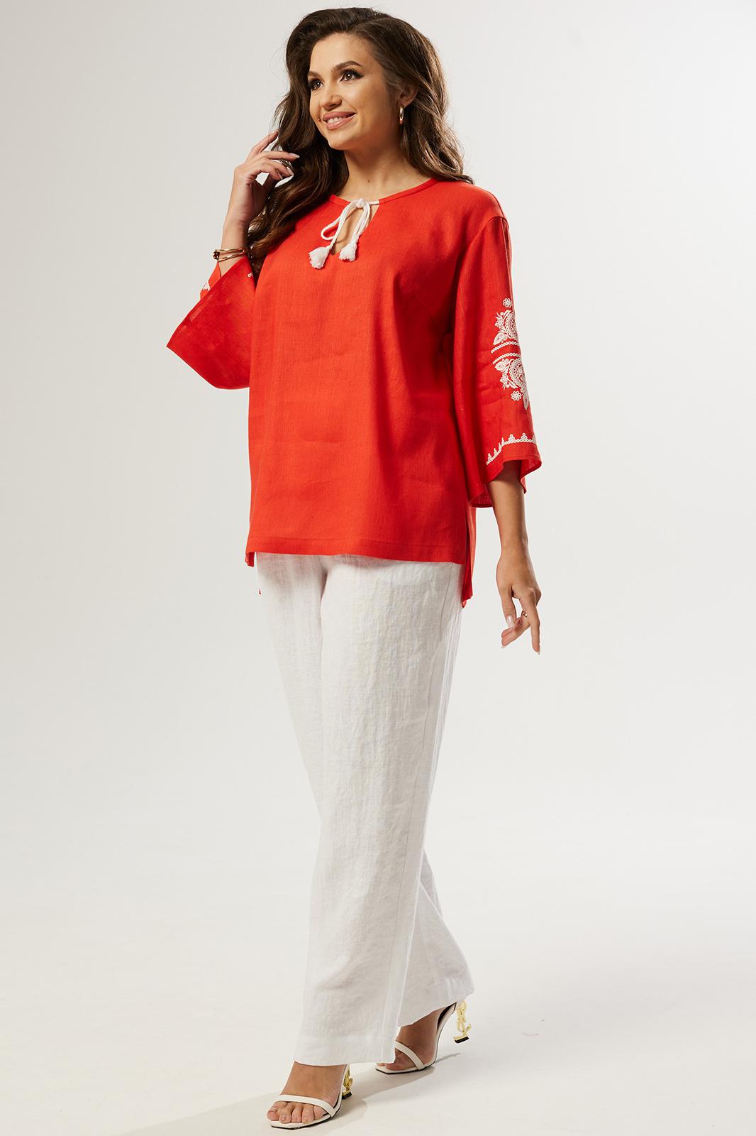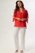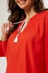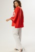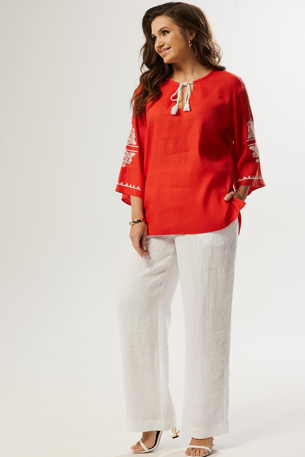 Блузка свободного силуэта со спущенным плечом. Рукав свободный, расширенный к низу. Горловина круглая с V-образным вырезом, украшенная декоративными завязками с кисточками. По бокам разрезы. На рукавах принт.