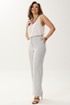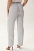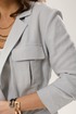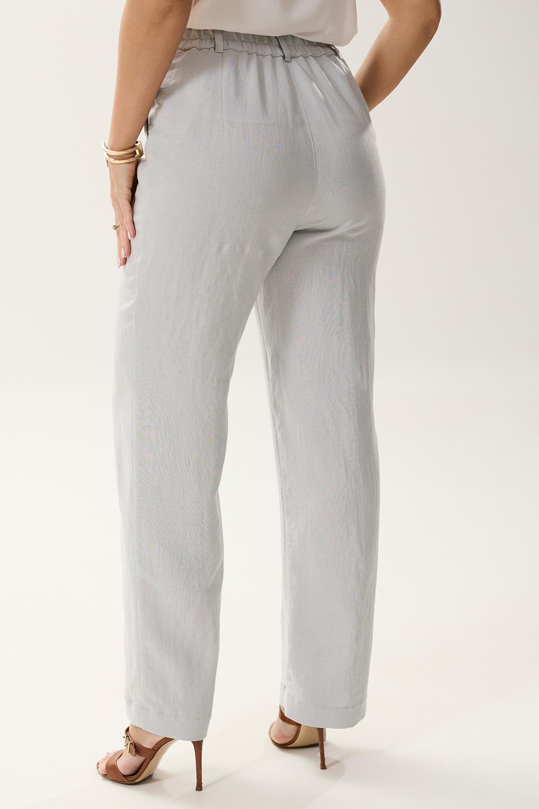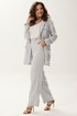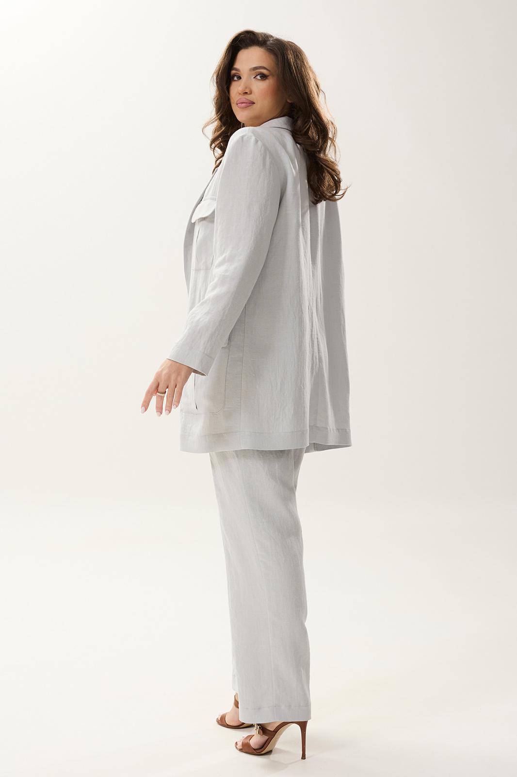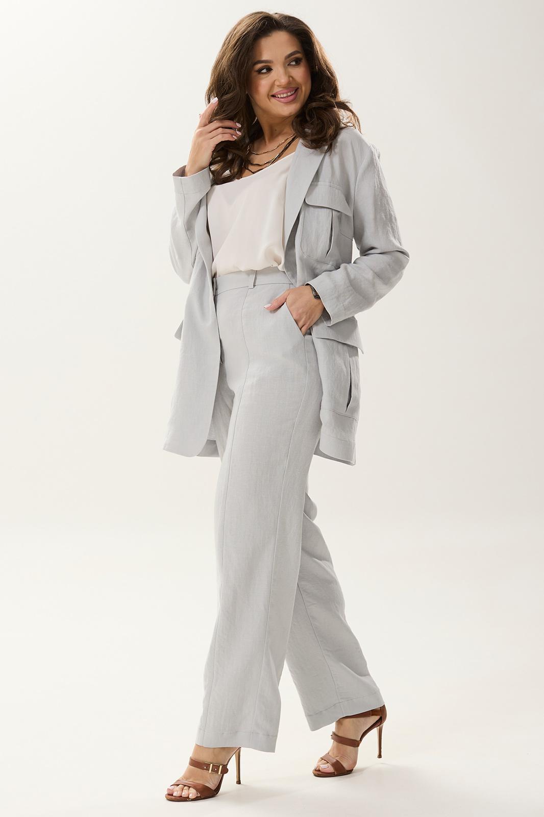 Комплект женский, состоящий из жакета и брюк. Жакет полуприлегающего силуэта, рукав длинный втачной, спинка со средним швом. По переду накладные карманы со складкой и клапаном. Пояс в комплекте. Брюки прямые на резинке по спинке, по переду рельефы, на задней половине вытачки. Застежка на молнию и пуговицы.