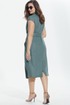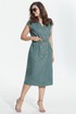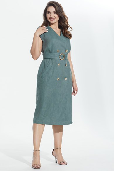 Платье женское прямого силуэта на центральной двубортной застёжке на декоративные петли и пуговицы. Перед с нагрудными вытачками из боковых швов, наклонными карманами с листочкой в области бёдер и имитацией нагрудного косого кармана с листочкой. Линия плеча спущена. Спинка со средним швом, внизу которого выполнена шлица. Горловина V–образной формы с цельнокроенной стойкой по спинке. Платье без рукавов со съёмным поясом и декоративной пряжкой.