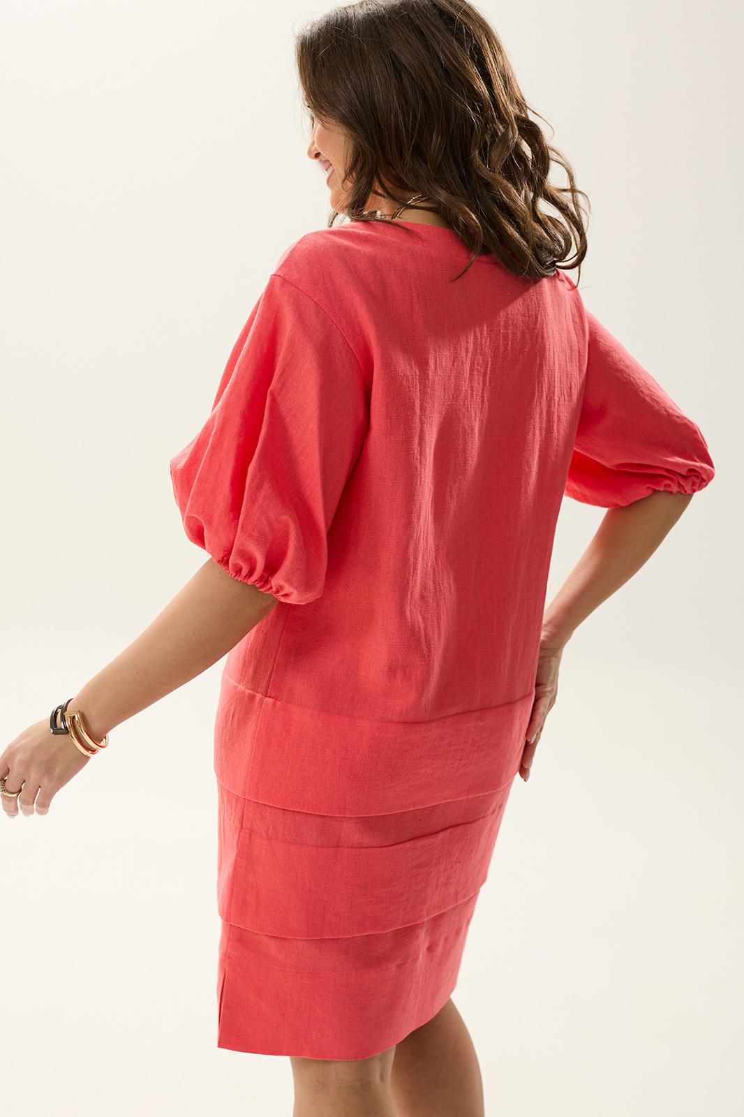 Платье прямого силуэта с крупными декоративными складками по низу юбки. В боковых швах по низу небольшие разрезы. Горловина в форме лодочки, плечо спущенное. Рукав ¾, расширенный книзу, собранный на резинку.