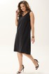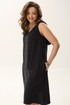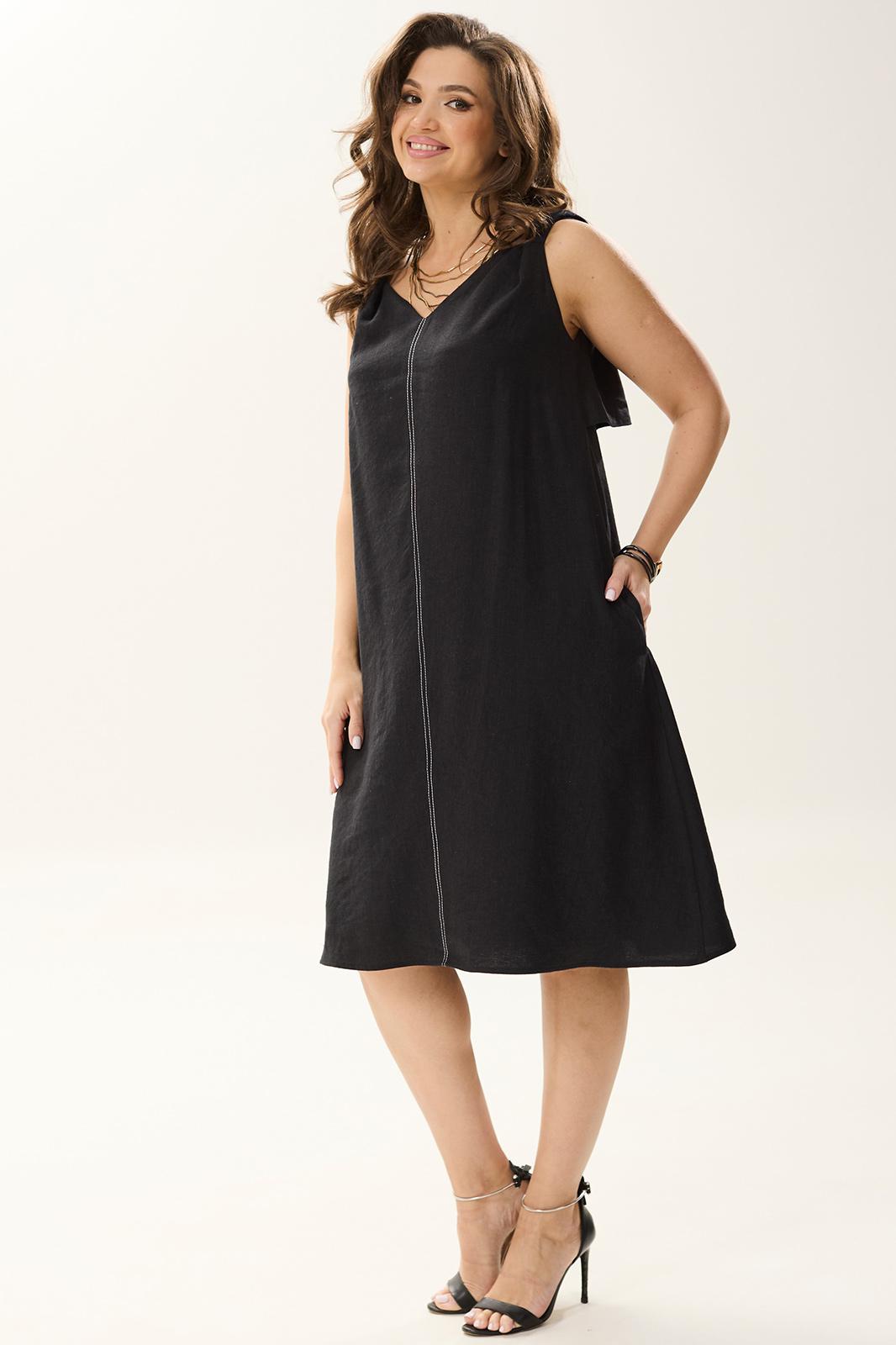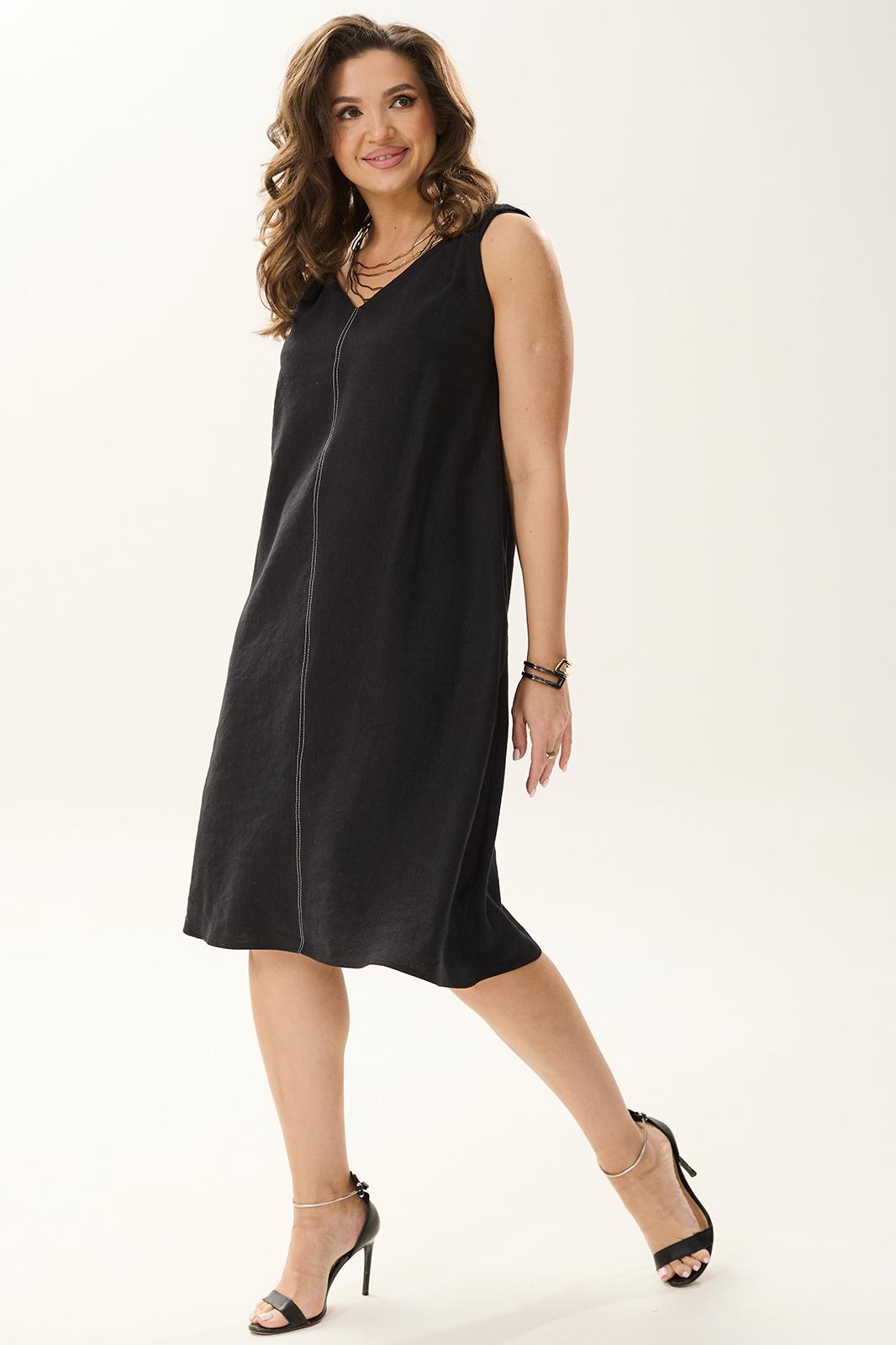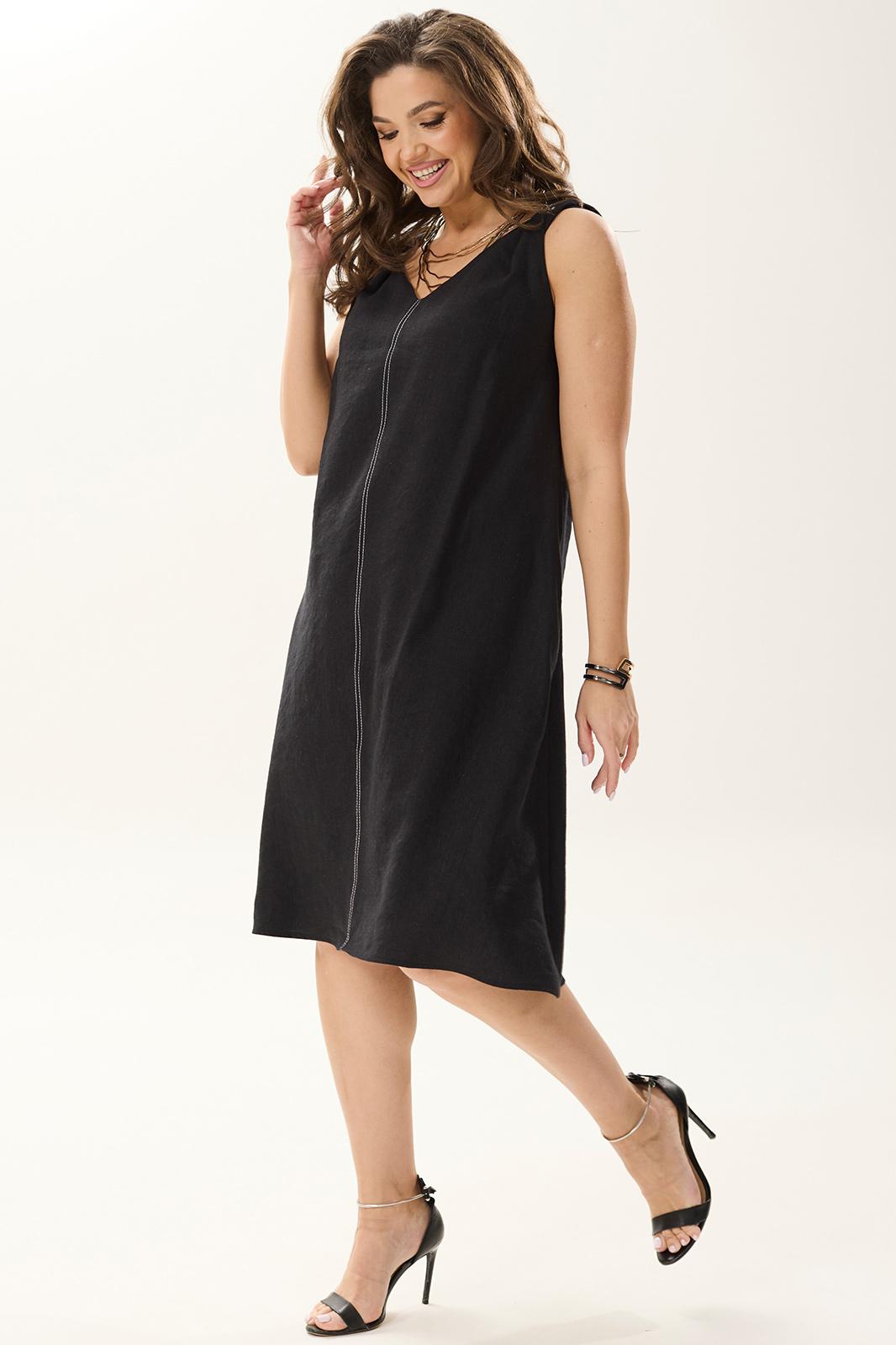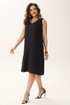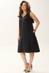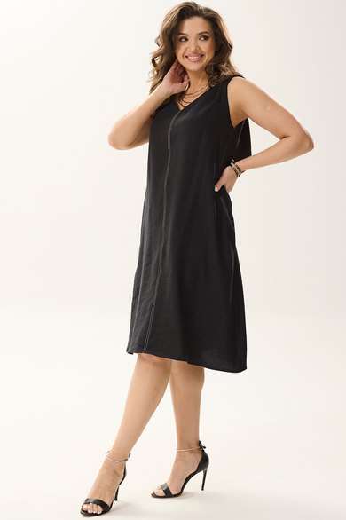 Платье женское А-образного силуэта без рукавов, с V-образной горловиной. Перед со средним швом, по которому прострочены контрастные отделочные строчки. В боковых швах выполнены карманы. Спинка с отлетной кокеткой и средним швом, по которому прострочены контрастные отделочные строчки.