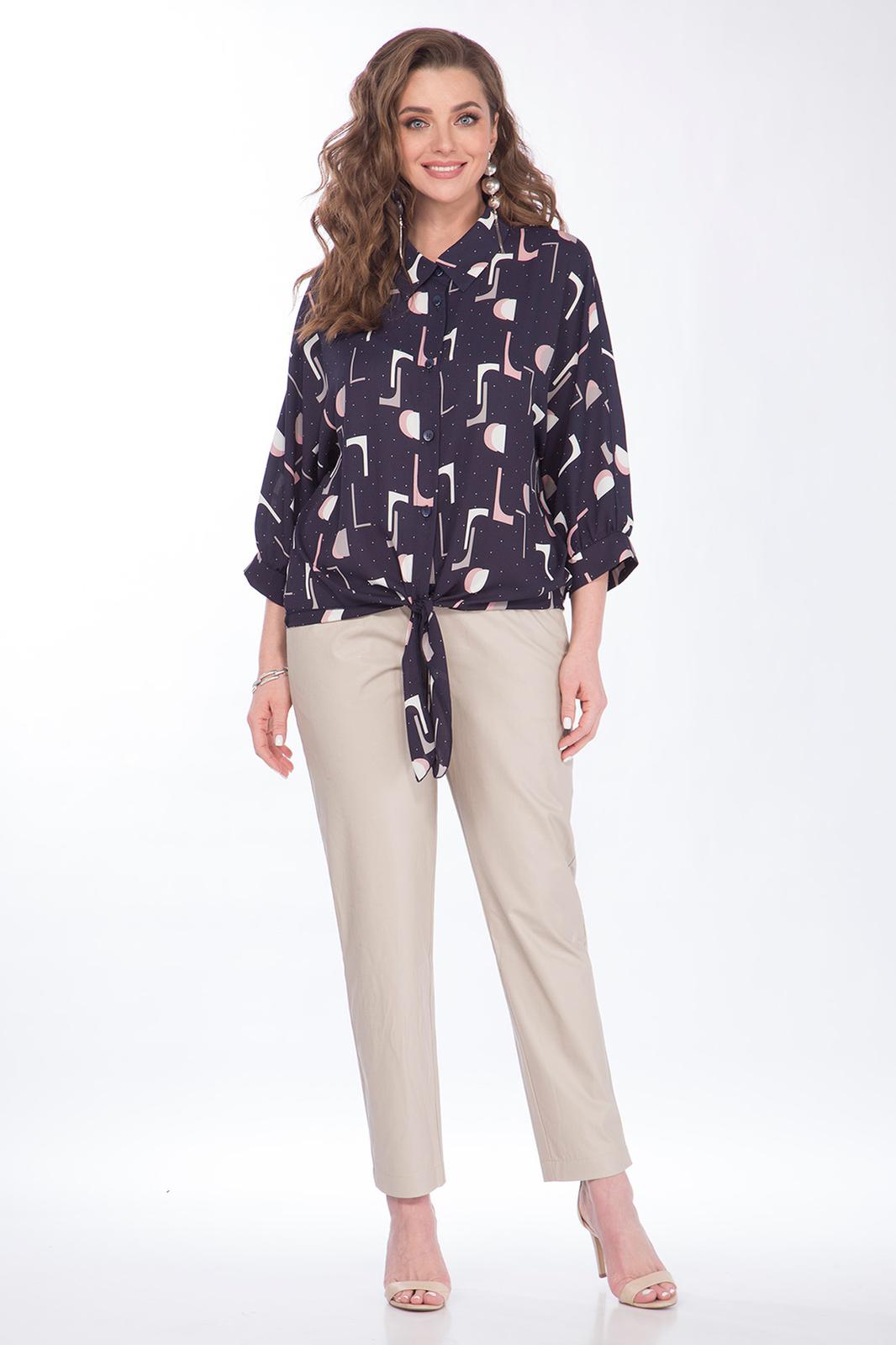 Блузка женская прямого силуэта. Застёжка центральная на петли пуговицы. Рукав цельнокроеный, длина 3/4. Воротник рубашечный с отрезной стойкой. Детали переда к низу по центру удлиненные на завязку. Длина по спинке - 59 см, длина рукава - 49 см, ширина рукава на уровне низа 54-46 см, 56-47см,58-48см.
