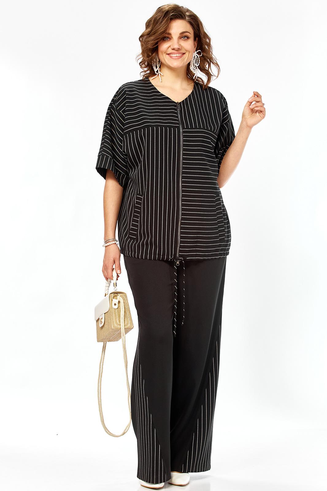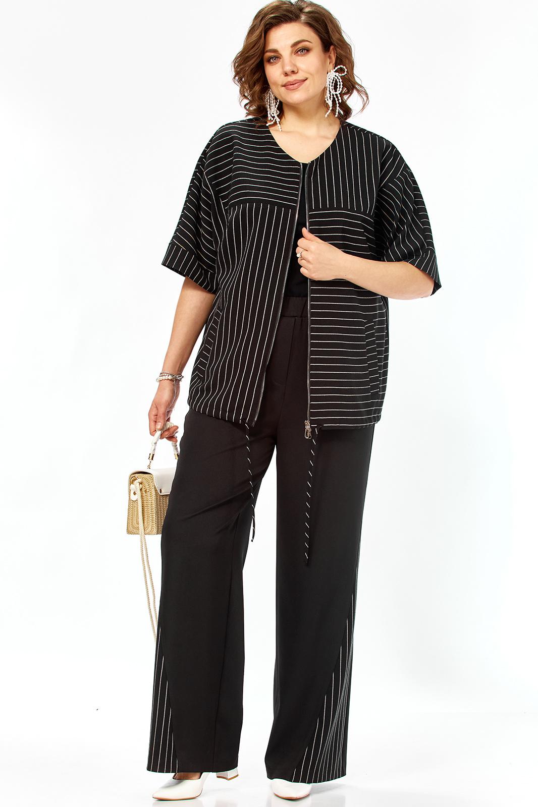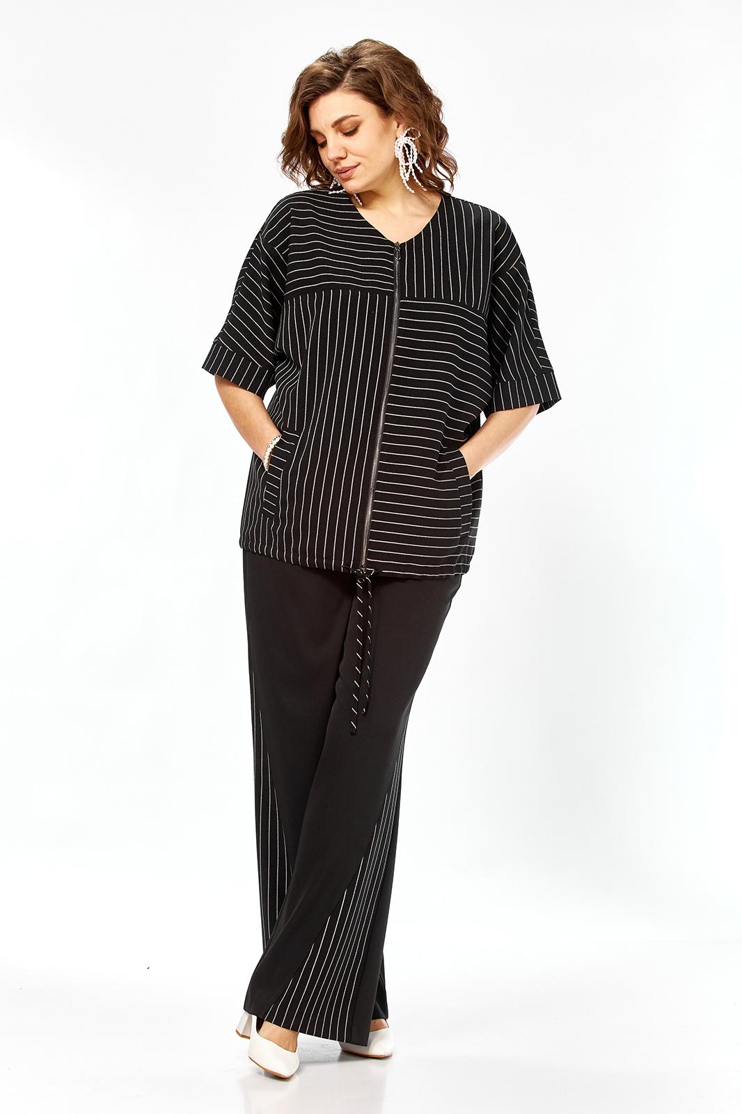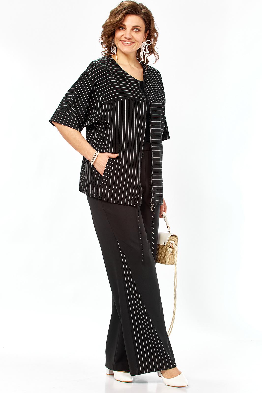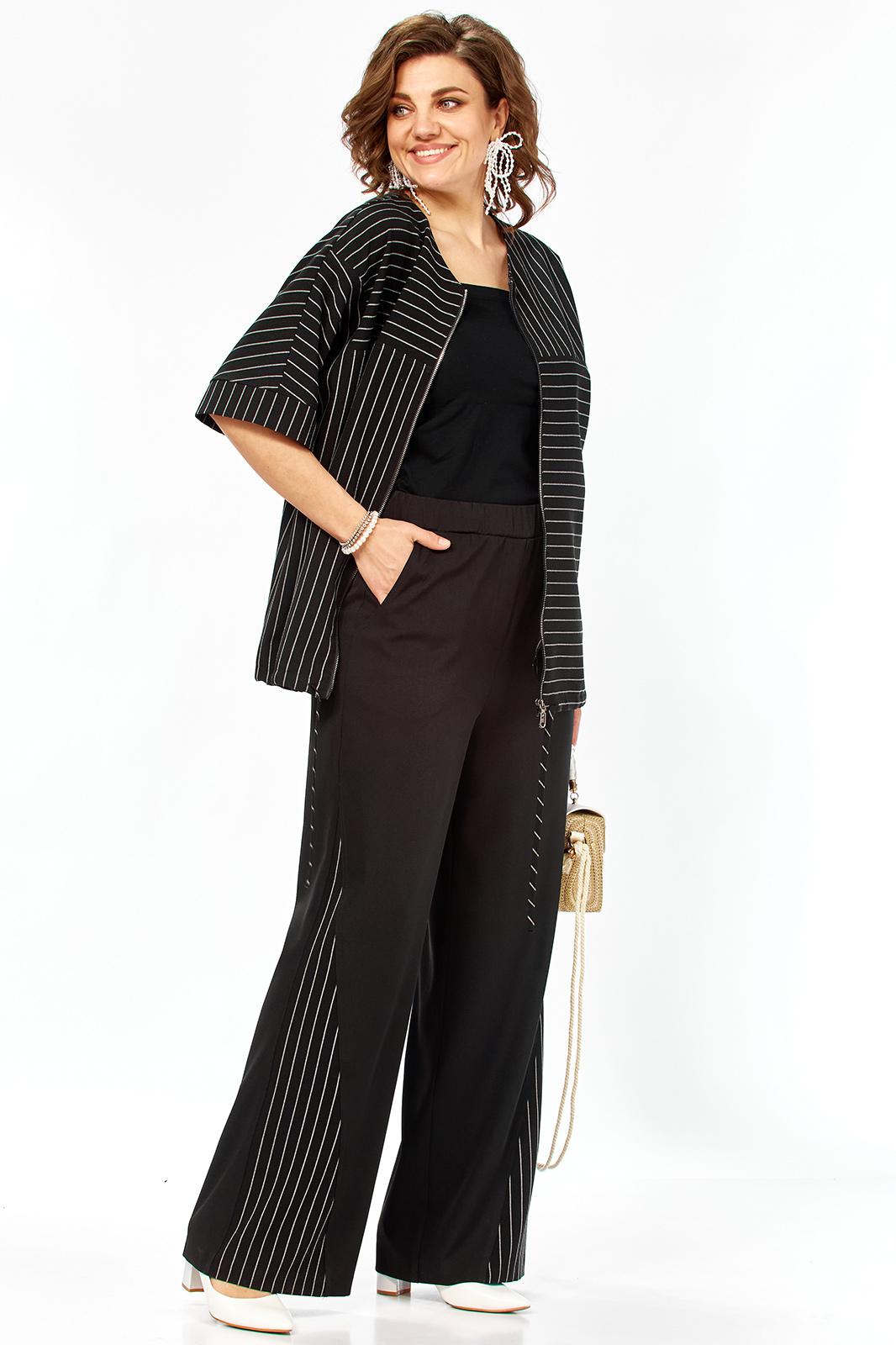 Комплект женский 2-х предм., состоящий из брюк и жакета. Жакет женский с центральной молнией по переду, V-образным вырезом горловины, отрезными кокетками по переду, прорезными карманами с листочкой и цельнокроеным рукавом на отрезной манжете, длина рукава до локтя. По низу жакета имеется кулиса. Брюки свободного кроя, на круговой резинке, с карманами в боковых швах. По переду выполнена клиновидная вставка из полосатой ткани.