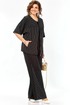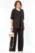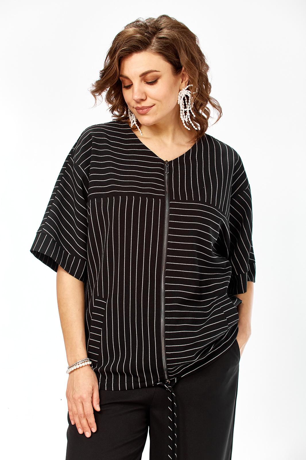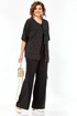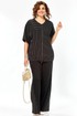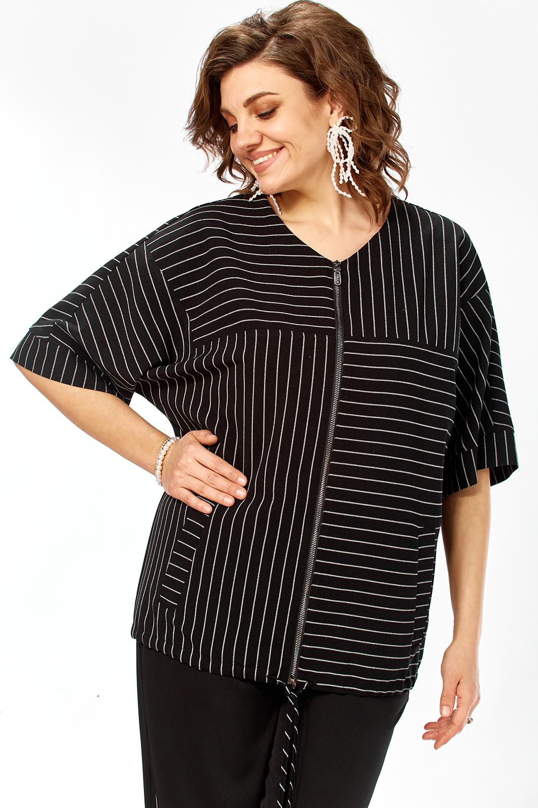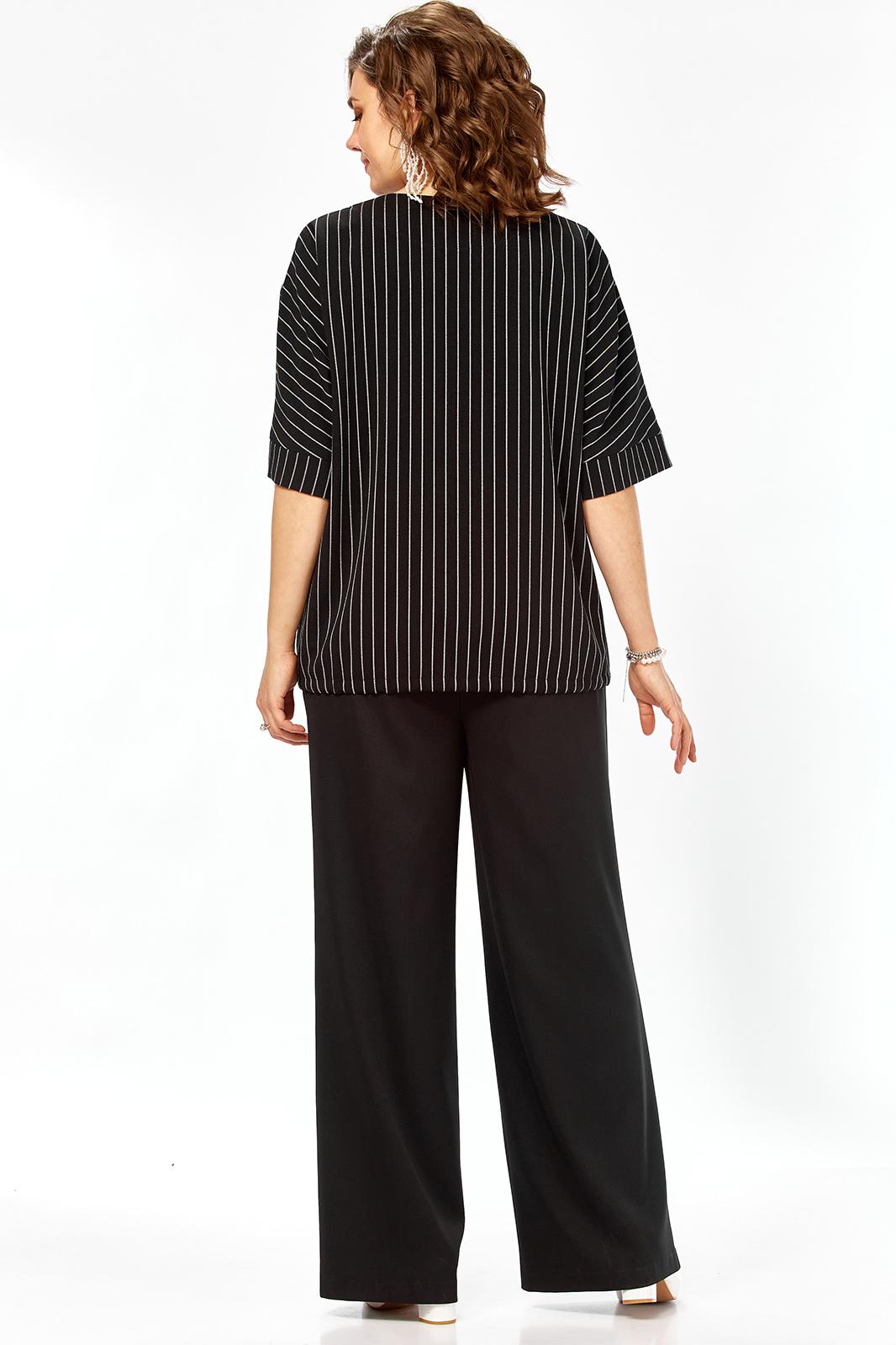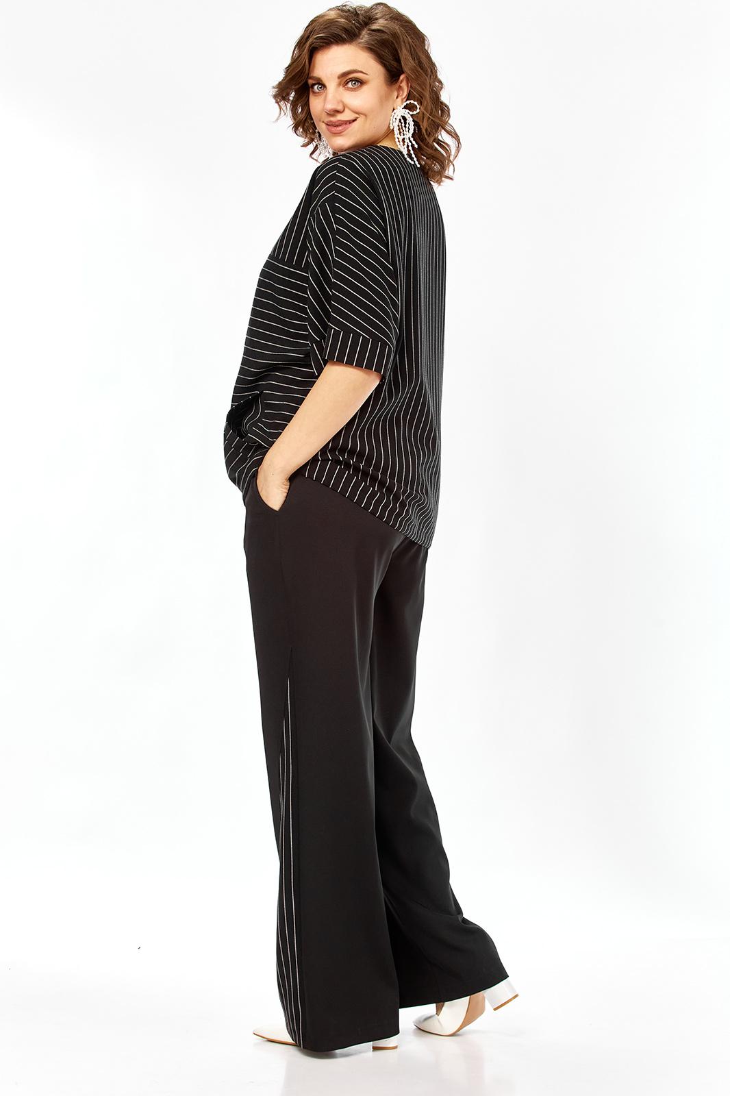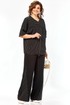 Комплект женский 2-х предм., состоящий из брюк и жакета. Жакет женский с центральной молнией по переду, V-образным вырезом горловины, отрезными кокетками по переду, прорезными карманами с листочкой и цельнокроеным рукавом на отрезной манжете, длина рукава до локтя. По низу жакета имеется кулиса. Брюки свободного кроя, на круговой резинке, с карманами в боковых швах. По переду выполнена клиновидная вставка из полосатой ткани.