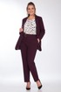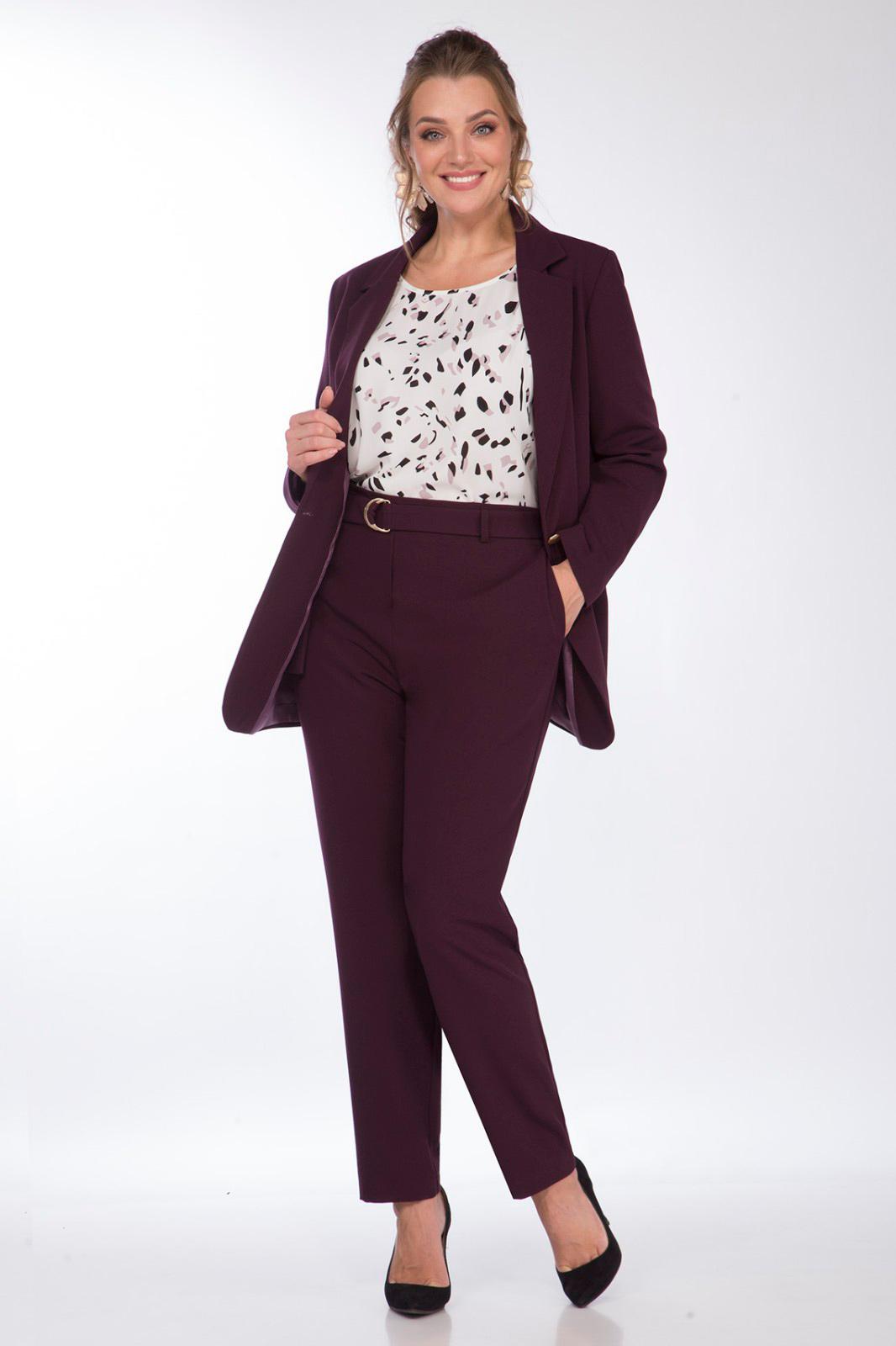 Комплект женский 3-х предметный состоящий из жакета,брюк, блузки. Жакет прямого силуэта, на подкладке с центральной застежкой на петли-пуговицы. По переду на уровне талии выполнены прорезные карманы с листочкой и клапаном. Рукав втачной, двухшовный с цельнокроеной манжетой. Брюки прямые,слегка заужены к низу. По переду выполнены боковые карманы. Пояс брюк на резинке. К брюкам прилагается съемный пояс из основной ткани. Блузка прямого силуэта, вырез горловины круглый, линия плеча спущена.