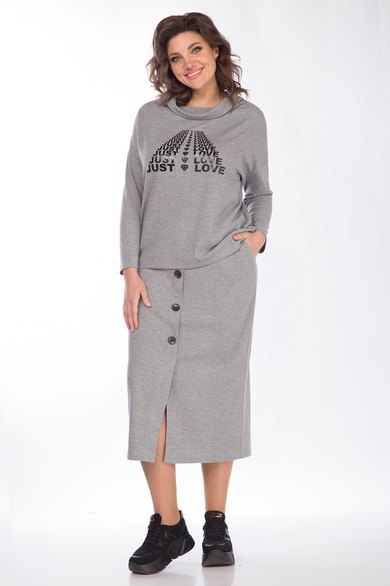 Комплект женский 2-х предметный, состоящий из блузки и юбки. Выполнен из трикотажного полотна в рубчик. Блузка со спущенной линией плеча и воротником-хомутом, по переду украшена декоративной печатью. По спинке блузка слегка удлинена. Юбка длины-миди, с поясом на резинке и карманами хулиганами. По центру переда юбки расположилась декоративная планка с пуговицами, которая переходит в шлицу у низа изделия.