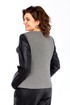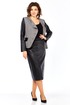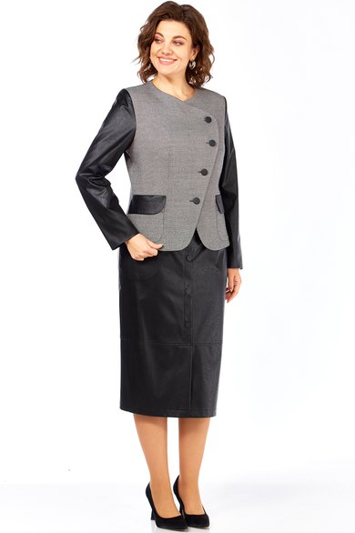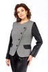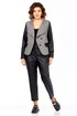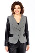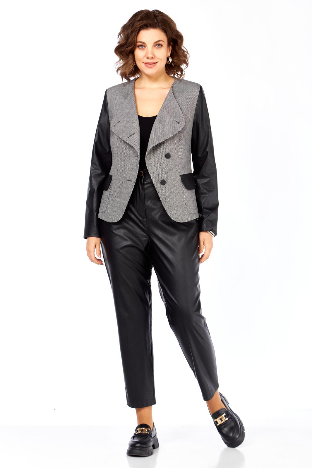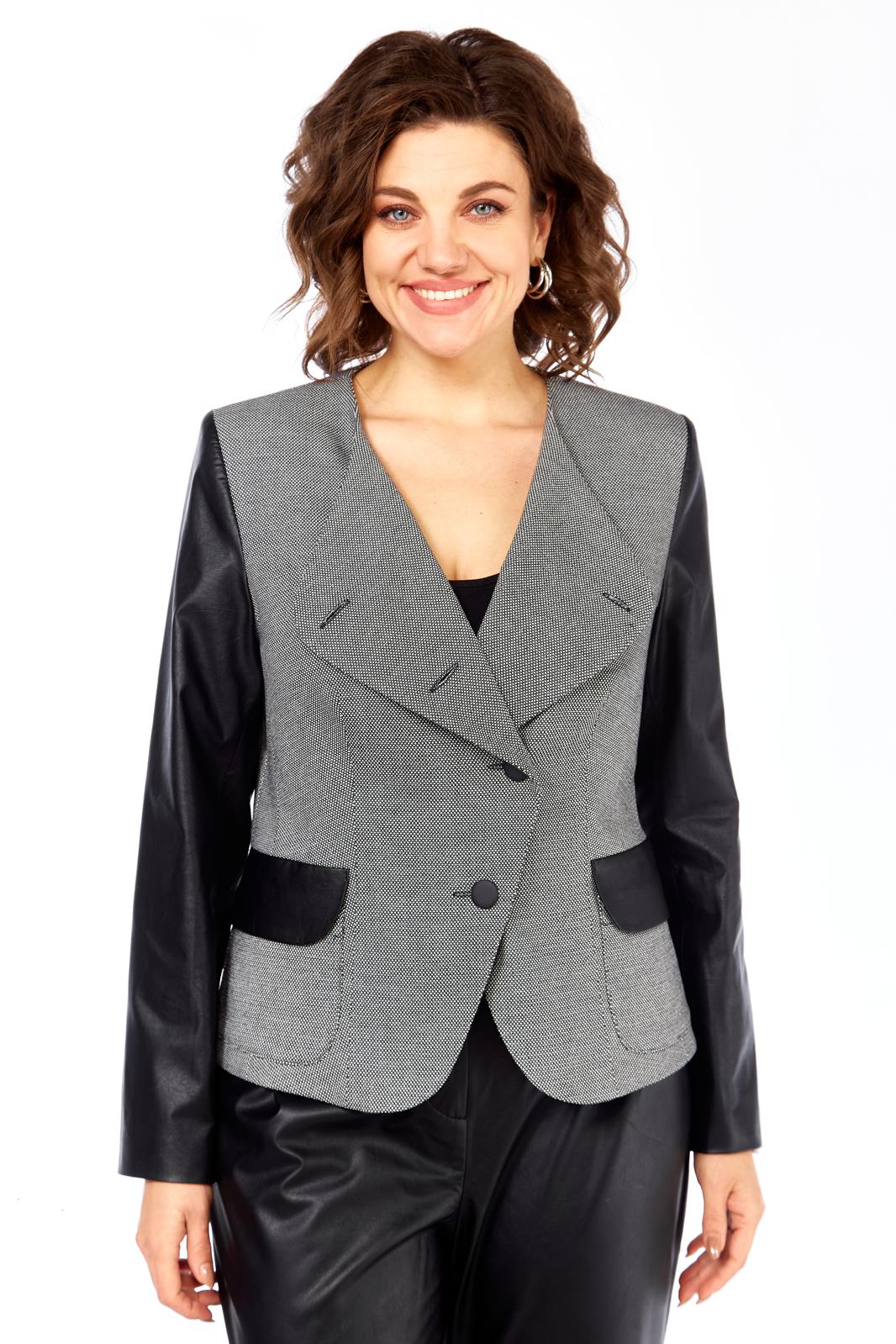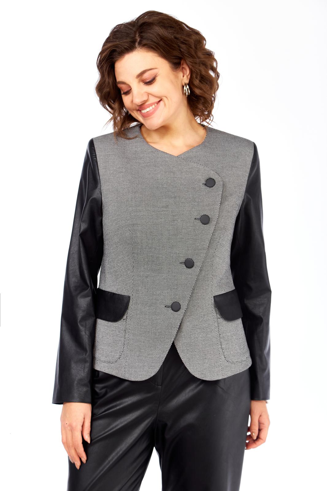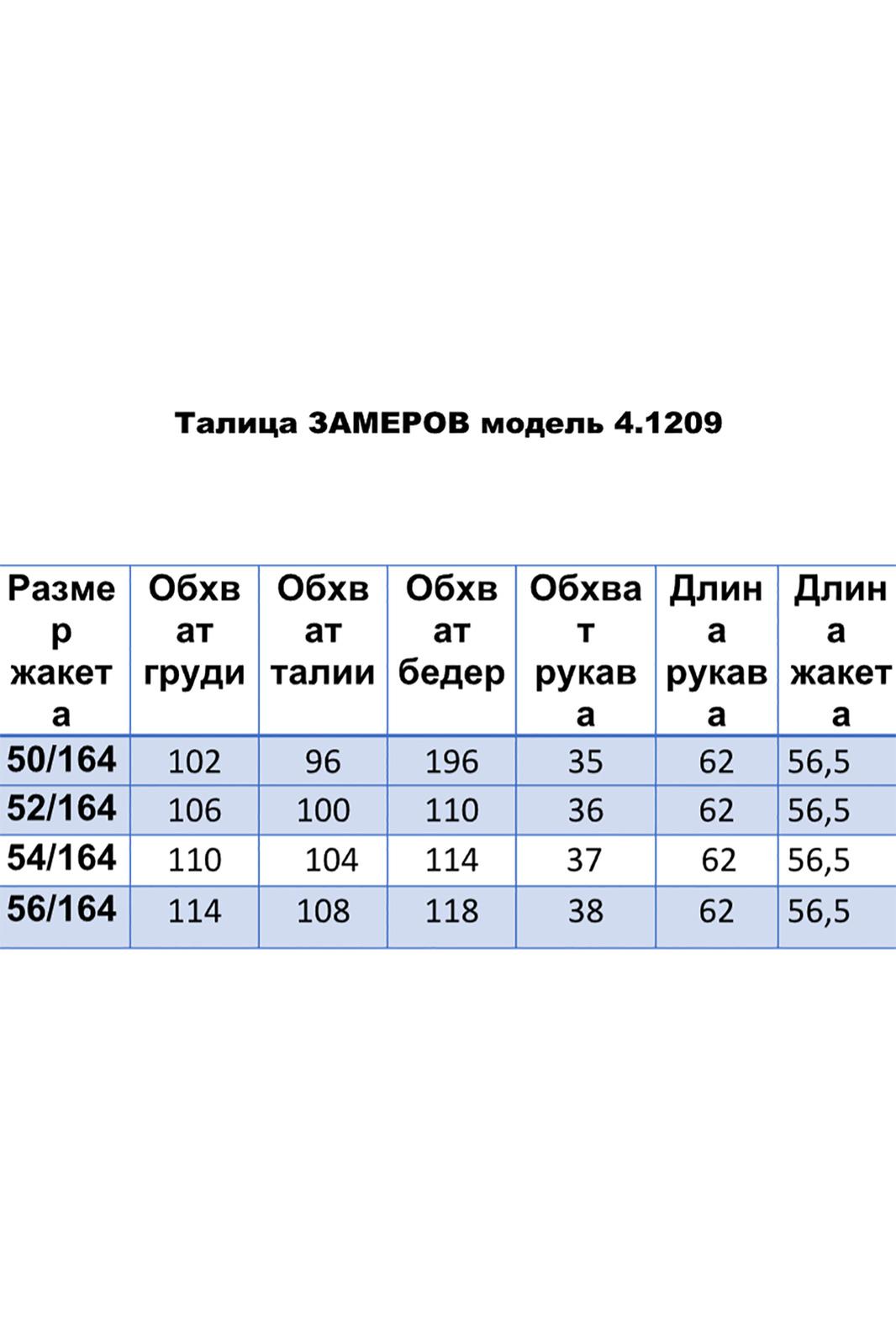 Жакет женский, укороченный, на подкладке. Перед жакета с отрезными бочками, талиевыми вытачками от низа изделия, накладными карманами с клапанами. Линия подборта фигурная с застёжкой на 4 пуговицы. Спинка со средним швом и рельефами. Рукав длинный, втачной, двухшовный.